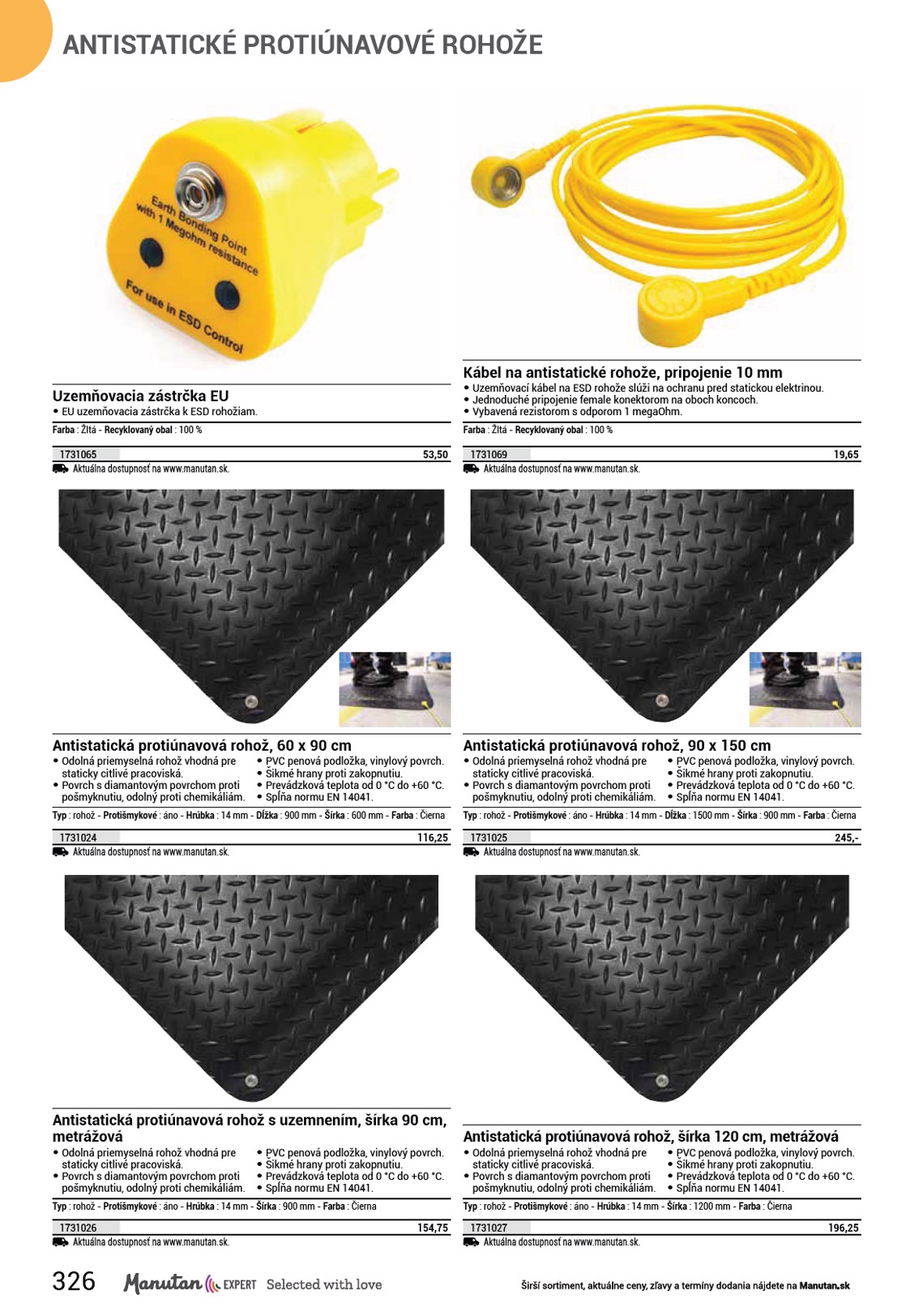 ANTISTATICKÉ PROTIÚNAVOVÉ ROHOŽE Uzemňovacia zástrčka EU • EU uzemňovacia zástrčka k ESD rohožiam. Farba : Žltá - Recyklovaný obal : 100 % 1731065 Aktuálna dostupnosť na www.manutan.sk. 53,50 Kábel na antistatické rohože, pripojenie 10 mm • Uzemňovací kábel na ESD rohože slúži na ochranu pred statickou elektrinou. • Jednoduché pripojenie female konektorom na oboch koncoch. • Vybavená rezistorom s odporom 1 megaOhm. Farba : Žltá - Recyklovaný obal : 100 % 1731069 Aktuálna dostupnosť na www.manutan.sk. 19,65 Antistatická protiúnavová rohož, 60 x 90 cm • Odolná priemyselná rohož vhodná pre • PVC penová podložka, vinylový povrch. staticky citlivé pracoviská. • Šikmé hrany proti zakopnutiu. • Povrch s diamantovým povrchom proti • Prevádzková teplota od 0 °C do +60 °C. pošmyknutiu, odolný proti chemikáliám. • Spĺňa normu EN 14041. Typ : rohož - Protišmykové : áno - Hrúbka : 14 mm - Dĺžka : 900 mm - Šírka : 600 mm - Farba : Čierna 1731024 Aktuálna dostupnosť na www.manutan.sk. 116,25 Antistatická protiúnavová rohož, 90 x 150 cm • Odolná priemyselná rohož vhodná pre • PVC penová podložka, vinylový povrch. staticky citlivé pracoviská. • Šikmé hrany proti zakopnutiu. • Povrch s diamantovým povrchom proti • Prevádzková teplota od 0 °C do +60 °C. pošmyknutiu, odolný proti chemikáliám. • Spĺňa normu EN 14041. Typ : rohož - Protišmykové : áno - Hrúbka : 14 mm - Dĺžka : 1500 mm - Šírka : 900 mm - Farba : Čierna 1731025 Aktuálna dostupnosť na www.manutan.sk. 245,- Antistatická protiúnavová rohož s uzemnením, šírka 90 cm, metrážová • Odolná priemyselná rohož vhodná pre • PVC penová podložka, vinylový povrch. staticky citlivé pracoviská. • Šikmé hrany proti zakopnutiu. • Povrch s diamantovým povrchom proti • Prevádzková teplota od 0 °C do +60 °C. pošmyknutiu, odolný proti chemikáliám. • Spĺňa normu EN 14041. Typ : rohož - Protišmykové : áno - Hrúbka : 14 mm - Šírka : 900 mm - Farba : Čierna 1731026 Aktuálna dostupnosť na www.manutan.sk. 154,75 Antistatická protiúnavová rohož, šírka 120 cm, metrážová • Odolná priemyselná rohož vhodná pre • PVC penová podložka, vinylový povrch. staticky citlivé pracoviská. • Šikmé hrany proti zakopnutiu. • Povrch s diamantovým povrchom proti • Prevádzková teplota od 0 °C do +60 °C. pošmyknutiu, odolný proti chemikáliám. • Spĺňa normu EN 14041. Typ : rohož - Protišmykové : áno - Hrúbka : 14 mm - Šírka : 1200 mm - Farba : Čierna 1731027 Aktuálna dostupnosť na www.manutan.sk. 196,25 326