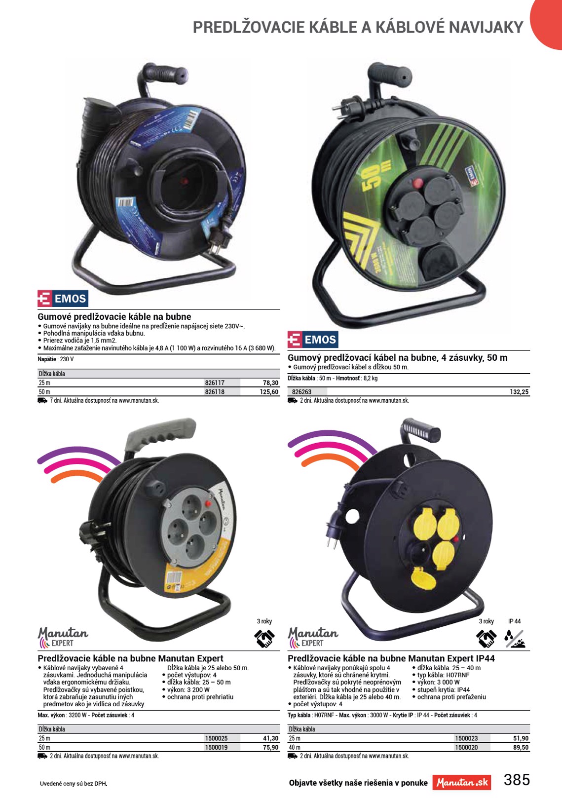 PREDLŽOVACIE KÁBLE A KÁBLOVÉ NAVIJAKY IP 20 Predlžovacie káble s prepäťovou ochranou Emos, 5 zásuviek, 3 - 5 m • Predlžovacie káble s prepäťovou ochrannou s piatimi zásuvkami v rôznych dĺžkach. • Prepäťová ochrana slúži na účinnú ochranu elektronických zariadení pred poškodením alebo zničením pri výkyvoch napätia napr. pri búrkach. • Vybavené podsvieteným sieťovým vypínačom a automatickou poistkou s časovým oneskorením. • Sivé vyhotovenie vyrobené zo samozhášacieho plastu, rozmery zostavy zásuviek sú 330 x 54 x 55 mm. Typ : prepäťová ochrana - Počet zásuviek : 5 - Max. výkon : 2300 W - Vypínač : áno - Typ kábla : H05VV-F3G 1,0 mm2 - Farba : Sivá Napätie Dĺžka kábla 230 V 5 m 250 V 3 m 2 dni. Aktuálna dostupnosť na www.manutan.sk. 826295 826225 34,50 28,25 Predlžovacie káble Emos s vypínačom, biele, PVC, 6 zásuviek • Biely predlžovací kábel 6 zásuviek slúži na privedenie elektriny tam, kde pevná zásuvka nedosiahne. • Vybavený detskými clonkami. • Dá sa pripevniť na stenu. • Prierez vodiča 1,5 mm2. Počet zásuviek : 6 - Napätie : 250 V - Max. výkon : 3680 W - Vypínač : áno - Typ kábla : H05VV-F3G - Krytie IP : IP 20 - Farba : Biela Dĺžka kábla 3 m 5 m 7 dní. Aktuálna dostupnosť na www.manutan.sk. 826779 826780 15,09 19,15 Predlžovací kábel s prepäťovou ochranou Emos, 5 zásuviek, 1,5 m • Predlžovací kábel s prepäťovou ochranou s piatimi zásuvkami. • Prepäťová ochrana slúži na účinnú ochranu elektronických zariadení pred poškodením alebo zničením pri výkyvoch napätia napr. pri búrkach. • Vybavené podsvieteným sieťovým vypínačom a automatickou poistkou s časovým oneskorením. • Čierne vyhotovenie vyrobené zo samozhášacieho plastu, rozmery zostavy zásuviek sú 330 x 54 x 55 mm. Typ : prepäťová ochrana - Počet zásuviek : 5 - Napätie : 250 V - Max. výkon : 2300 W - Vypínač : áno - Dĺžka kábla : 1,5 m - Typ kábla : H05VV-F3G 1,0 mm2 - Farba : Čierna 826224 23,- 2 dni. Aktuálna dostupnosť na www.manutan.sk. Predlžovací kábel s prepäťovou ochranou Emos, 8 zásuviek, 1,5 m • Predlžovací kábel s prepäťovou ochranou s ôsmimi zásuvkami. • Prepäťová ochrana slúži na účinnú ochranu elektronických zariadení pred poškodením alebo zničením pri výkyvoch napätia napr. pri búrkach. • Vybavené podsvieteným sieťovým vypínačom a automatickou poistkou s časovým oneskorením. • Čierne vyhotovenie vyrobené zo samozhášacieho plastu, rozmery zostavy zásuviek sú 330 x 54 x 55 mm. Počet zásuviek : 8 - Napätie : 250 V - Max. výkon : 2300 W - Vypínač : áno - Dĺžka kábla : 1,5 m - Typ kábla : H05VV-F3G 1,0 mm2 - Farba : Čierna 826226 2 dni. Aktuálna dostupnosť na www.manutan.sk. 30,25 Predlžovací kábel Emos, 5 zásuviek, 3 - 5 m • Predlžovacie káble s piatimi zásuvkami v niekoľkých dĺžkach. • Slúžia na predĺženie elektrickej energie tam, kde pevná zásuvka nedosiahne. • Vyrobené z plastu v bielom vyhotovení. Počet zásuviek : 5 - Napätie : 250 V - Max. výkon : 2300 W - Vypínač : nie - Typ kábla : H05VV-F3G 1 mm2 - Farba : Biela Dĺžka kábla 3 m 5 m 2 dni. Aktuálna dostupnosť na www.manutan.sk. 826023 826024 10,65 13,59 Prepäťová ochrana Emos, 1 zásuvka • Prepäťová ochrana slúži na účinnú ochranu elektronických zariadení pred poškodením alebo zničením pri výkyvoch napätia napr. pri búrkach. • Vybavená indikátorom prepätia. • Rozmery prepäťovej ochrany sú 75 x 65 x 100 mm. Typ : Prepäťová ochrana - Počet zásuviek : 1 - Napätie : 250 V - Max. výkon : 3680 W - Vypínač : áno - Farba : Biela 826221 7 dní. Aktuálna dostupnosť na www.manutan.sk. 20,90 383