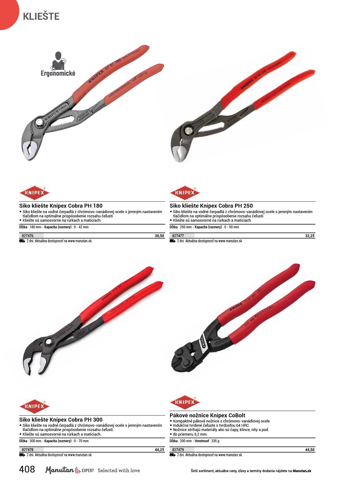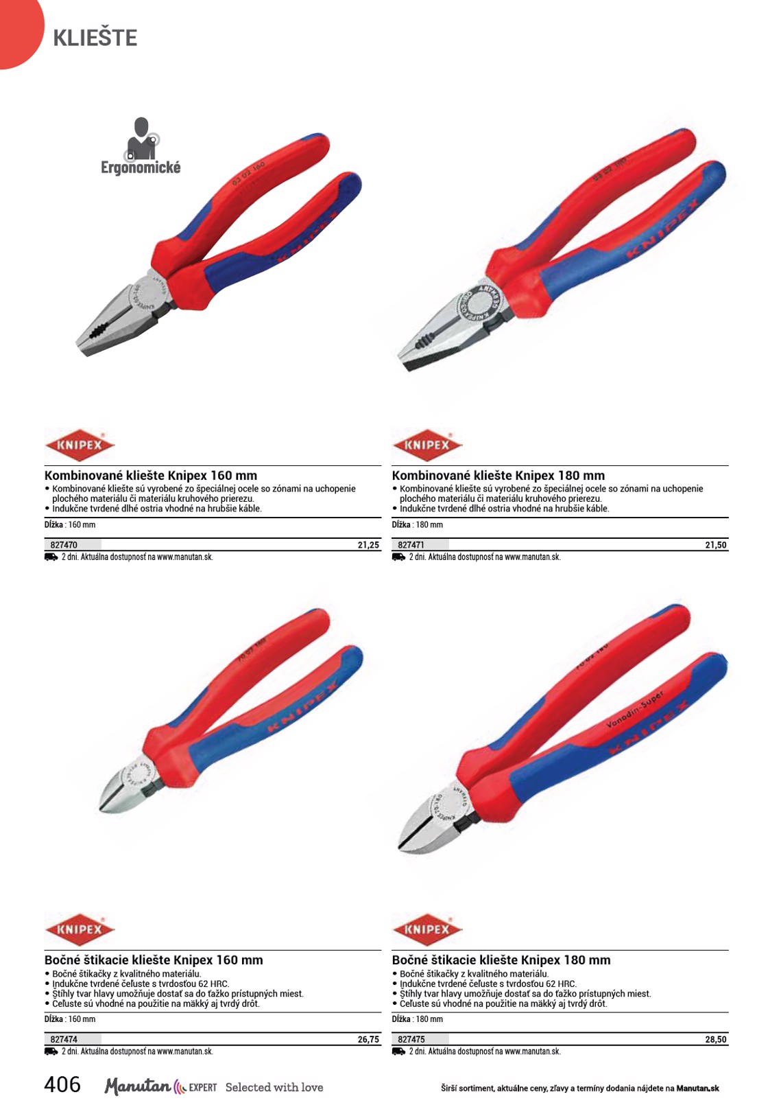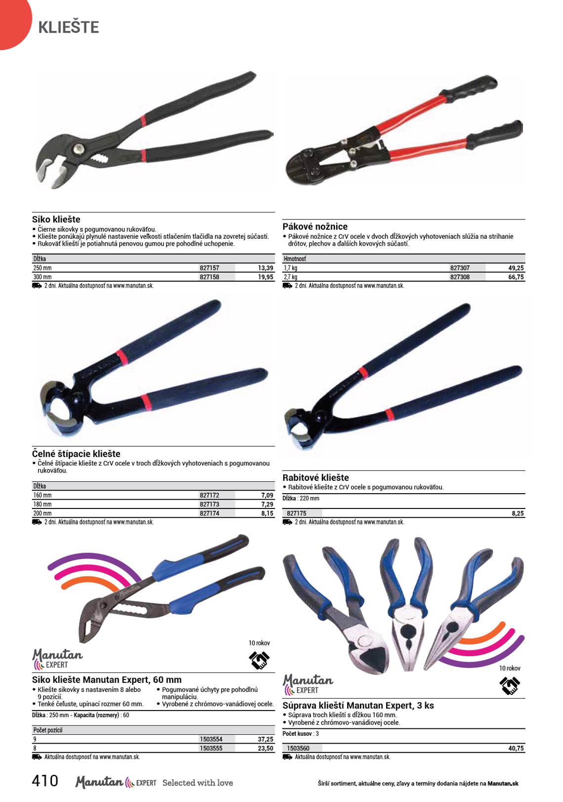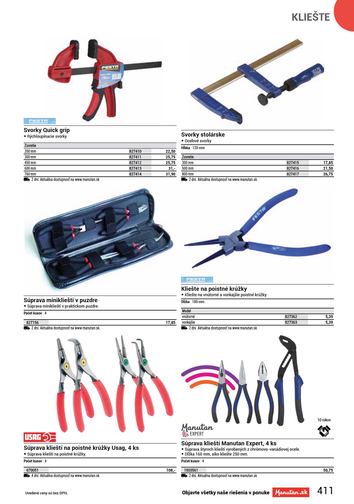 KLIEŠTE Svorky Quick grip • Rýchloupínacie svorky Zovretie 200 mm 300 mm 450 mm 600 mm 760 mm 2 dni. Aktuálna dostupnosť na www.manutan.sk. 827410 827411 827412 827413 827414 22,50 25,75 25,75 31,- 31,90 Svorky stolárske • Oceľové svorky Hĺbka : 120 mm Zovretie 300 mm 500 mm 800 mm 2 dni. Aktuálna dostupnosť na www.manutan.sk. 827415 827416 827417 17,85 21,50 26,75 Súprava miniklieští v puzdre • Súprava miniklieští v praktickom puzdre. Počet kusov : 4 827156 2 dni. Aktuálna dostupnosť na www.manutan.sk. Kliešte na poistné krúžky • Kliešte na vnútorné a vonkajšie poistné krúžky. Dĺžka : 180 mm Model vnútorné 827362 5,39 17,85 vonkajšie 827363 5,39 2 dni. Aktuálna dostupnosť na www.manutan.sk. Súprava klieští na poistné krúžky Usag, 4 ks • Súprava klieští na poistné krúžky. Počet kusov : 4 670051 4 dni. Aktuálna dostupnosť na www.manutan.sk. 10 rokov 108,- Súprava klieští Manutan Expert, 4 ks • Súprava štyroch klieští vyrobených z chrómovo-vanádiovej ocele. • Dĺžka 160 mm, siko kliešte 250 mm. Počet kusov : 4 1503561 2 dni. Aktuálna dostupnosť na www.manutan.sk. 50,75 411