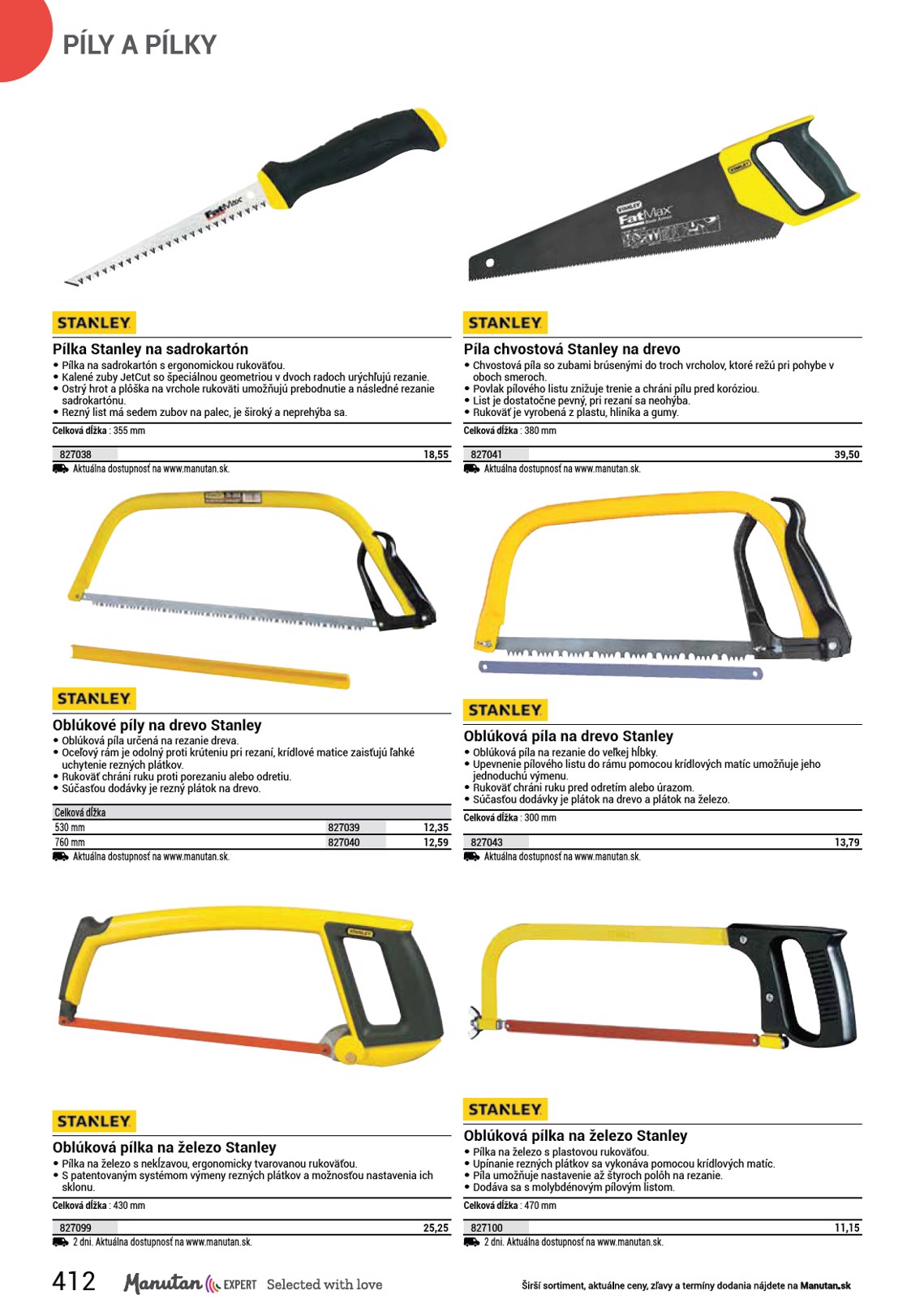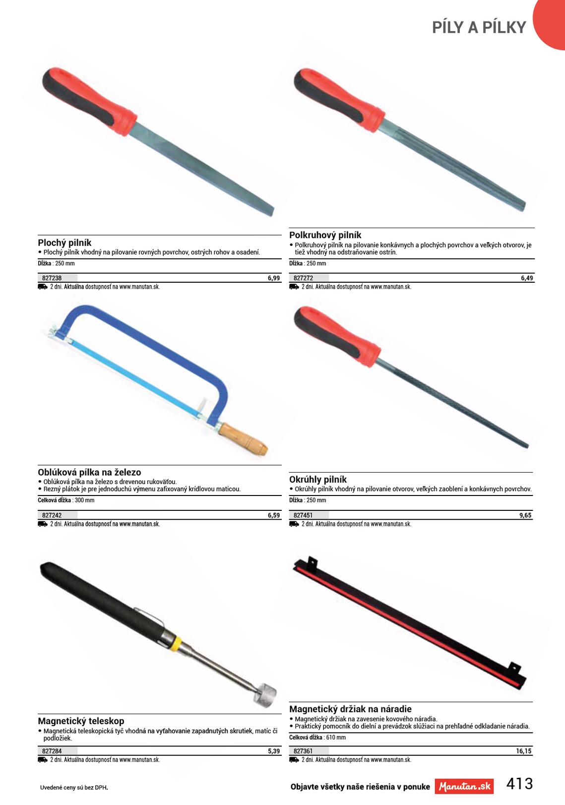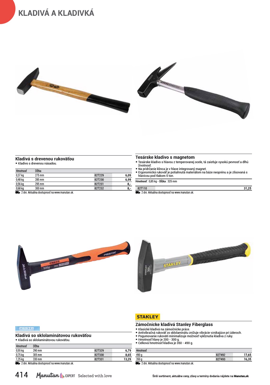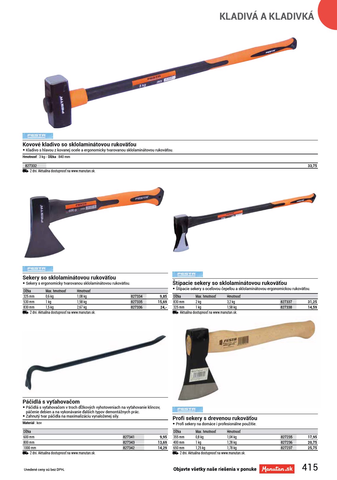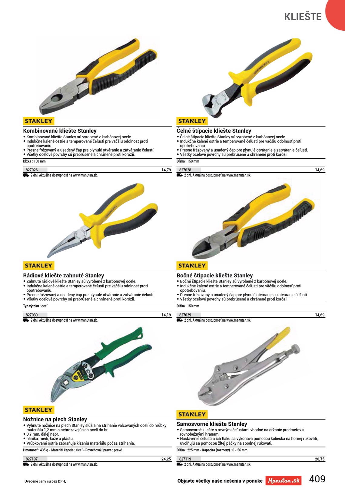 KLIEŠTE Svorky Quick grip • Rýchloupínacie svorky Zovretie 200 mm 300 mm 450 mm 600 mm 760 mm 2 dni. Aktuálna dostupnosť na www.manutan.sk. 827410 827411 827412 827413 827414 22,50 25,75 25,75 31,- 31,90 Svorky stolárske • Oceľové svorky Hĺbka : 120 mm Zovretie 300 mm 500 mm 800 mm 2 dni. Aktuálna dostupnosť na www.manutan.sk. 827415 827416 827417 17,85 21,50 26,75 Súprava miniklieští v puzdre • Súprava miniklieští v praktickom puzdre. Počet kusov : 4 827156 2 dni. Aktuálna dostupnosť na www.manutan.sk. Kliešte na poistné krúžky • Kliešte na vnútorné a vonkajšie poistné krúžky. Dĺžka : 180 mm Model vnútorné 827362 5,39 17,85 vonkajšie 827363 5,39 2 dni. Aktuálna dostupnosť na www.manutan.sk. Súprava klieští na poistné krúžky Usag, 4 ks • Súprava klieští na poistné krúžky. Počet kusov : 4 670051 4 dni. Aktuálna dostupnosť na www.manutan.sk. 10 rokov 108,- Súprava klieští Manutan Expert, 4 ks • Súprava štyroch klieští vyrobených z chrómovo-vanádiovej ocele. • Dĺžka 160 mm, siko kliešte 250 mm. Počet kusov : 4 1503561 2 dni. Aktuálna dostupnosť na www.manutan.sk. 50,75 411