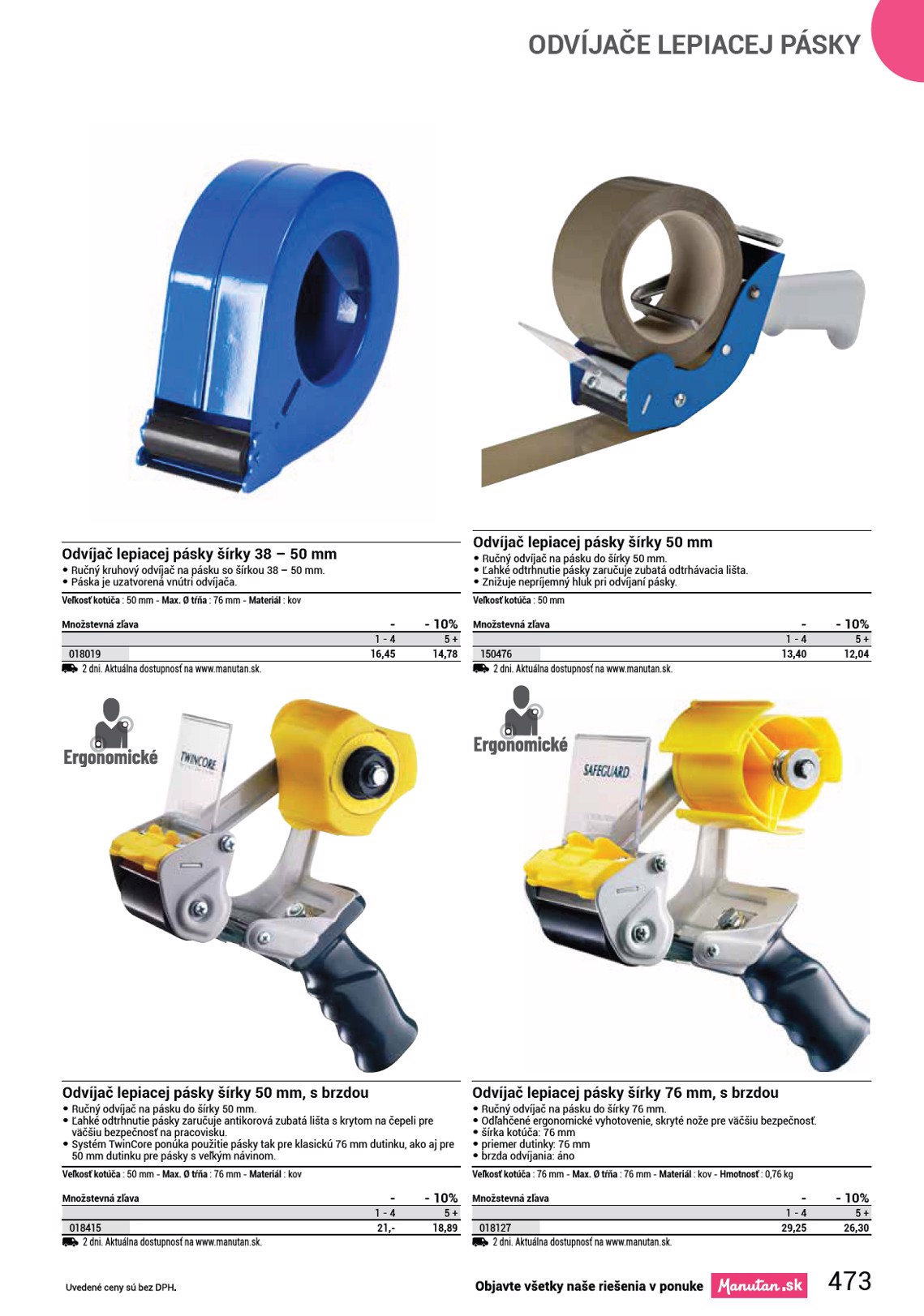 BEZPEČNOSTNÉ A ODLAMOVACIE NOŽE Odlamovací nôž Manutan Expert Multi • Multifunkčný odlamovací nôž na jedno použitie. Celková dĺžka : 150 mm Množstevná zľava 150877 2 dni. Aktuálna dostupnosť na www.manutan.sk. - 1 - 4 4,10 - 5% 5 - 14 3,89 - 16% 15 + 3,46 širší sortiment Odlamovací nôž Cup • Multifunkčný odlamovací nôž s ochrannou kovovou hlavicou pre väčšiu bezpečnosť. • Anti-oxidačná čepeľ. Celková dĺžka : 180 mm Množstevná zľava 150878 2 dni. Aktuálna dostupnosť na www.manutan.sk. - 1 - 4 10,60 - 5% 5 - 14 10,05 - 15% 15 + 9,01 Rozrezávač fólií a kartónov Sofiac • Bezpečnostný rezák s pocínovanou skrytou čepeľou a špičkou na prepichovanie pások. • Navrhnutý na rezanie pások a fólií. • Vhodný pre pravákov i ľavákov. • V zadnej časti plastového puzdra sa nachádza otvor na zavesenie. Celková dĺžka : 178 mm Množstevná zľava 1651933 2 dni. Aktuálna dostupnosť na www.manutan.sk. - 1 - 4 17,75 - 5% 5 - 14 16,84 - 15% 15 + 15,06 Rozrezávače fólií a kartónov GR8 Dispo, 10 ks • Nôž na rezanie fólií a kartónov s s jednorazovým ostrím. • Zakrytá čepeľ bez ostrých špíc poskytuje maximálnu bezpečnosť pre používateľov aj tovar. • Praktický otvor na zavesenie noža. OO Dodáva sa v balení 10 ks. Vysúvacia čepeľ : nie - Celková dĺžka : 154 mm - Materiál tela : plast Farba Červená Žltá Modrá Čierna 2 dni. Aktuálna dostupnosť na www.manutan.sk. 1731001 1731003 1731004 1731005 68,50 68,50 68,50 62,75 Jednorazový rozrezávač fólií a kartónov Dispo Lite, 25 ks • Jednorazový nôž na rezanie fólií a kartónov bez možnosti výmeny čepele. • Vhodný pre bezpečnostné zložky na rozrezanie bezpečnostných pásov. • Zakrytá čepeľ bez ostrých špíc poskytuje maximálnu bezpečnosť pre používateľov aj tovar. • Praktický otvor na zavesenie noža. OO Dodáva sa v balení 25 ks. Vysúvacia čepeľ : nie - Celková dĺžka : 166 mm - Materiál tela : plast - Farba : Žltá 1731000 2 dni. Aktuálna dostupnosť na www.manutan.sk. 68,50 477