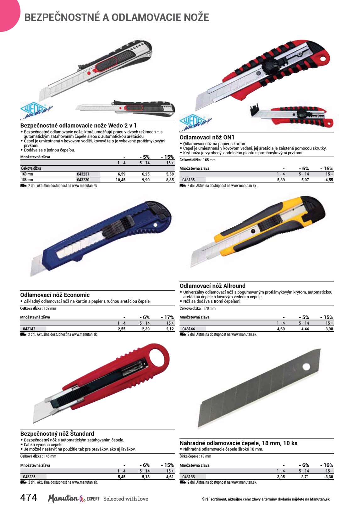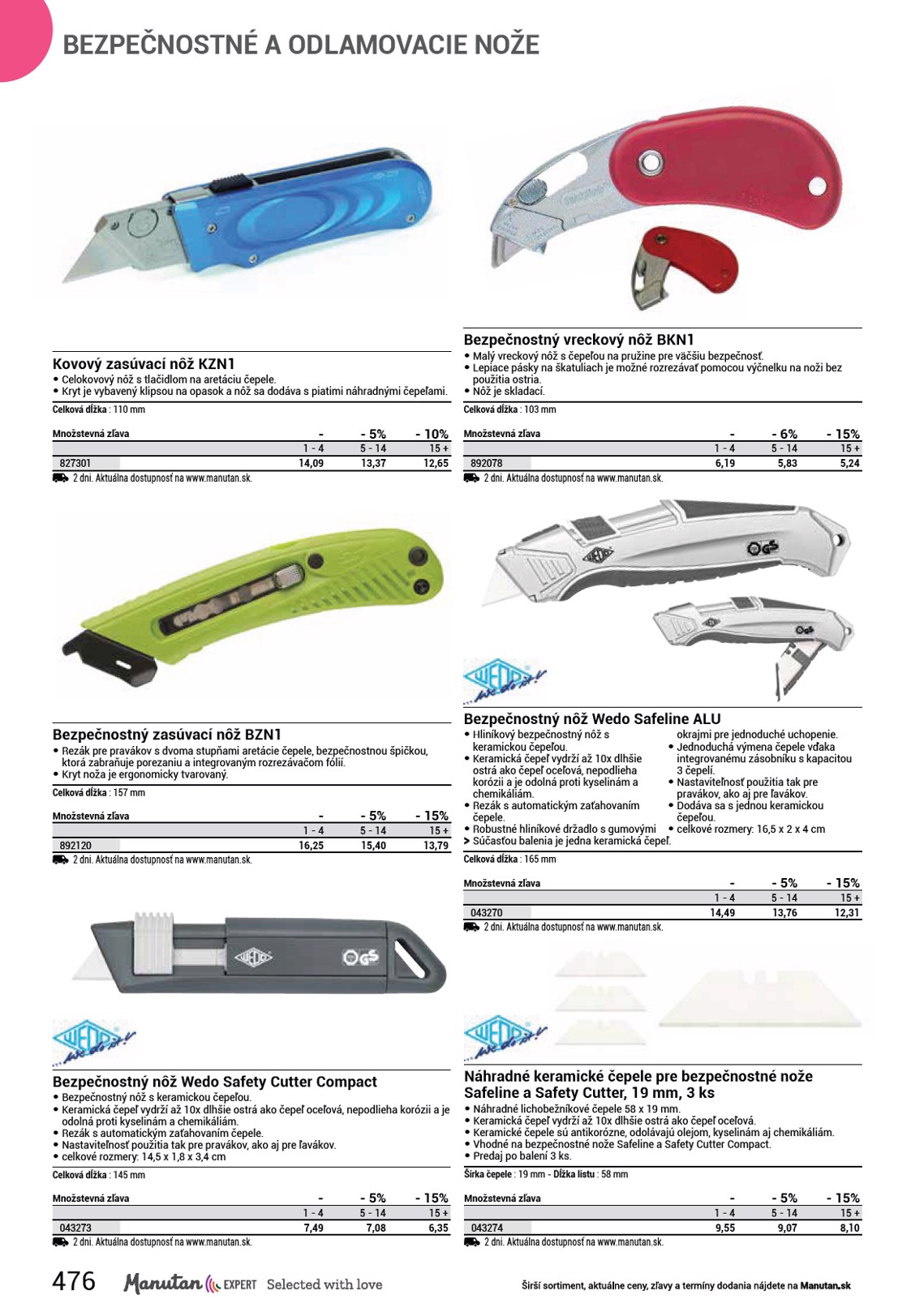 BEZPEČNOSTNÉ A ODLAMOVACIE NOŽE Kovový zasúvací nôž KZN1 • Celokovový nôž s tlačidlom na aretáciu čepele. • Kryt je vybavený klipsou na opasok a nôž sa dodáva s piatimi náhradnými čepeľami. Celková dĺžka : 110 mm Množstevná zľava 827301 2 dni. Aktuálna dostupnosť na www.manutan.sk. - 1 - 4 14,09 - 5% 5 - 14 13,37 - 10% 15 + 12,65 Bezpečnostný vreckový nôž BKN1 • Malý vreckový nôž s čepeľou na pružine pre väčšiu bezpečnosť. • Lepiace pásky na škatuliach je možné rozrezávať pomocou výčnelku na noži bez použitia ostria. • Nôž je skladací. Celková dĺžka : 103 mm Množstevná zľava 892078 2 dni. Aktuálna dostupnosť na www.manutan.sk. - - 6% - 15% 1 - 4 5 - 14 15 + 6,19 5,83 5,24 Bezpečnostný zasúvací nôž BZN1 • Rezák pre pravákov s dvoma stupňami aretácie čepele, bezpečnostnou špičkou, ktorá zabraňuje porezaniu a integrovaným rozrezávačom fólií. • Kryt noža je ergonomicky tvarovaný. Celková dĺžka : 157 mm Množstevná zľava 892120 2 dni. Aktuálna dostupnosť na www.manutan.sk. - 1 - 4 16,25 - 5% 5 - 14 15,40 - 15% 15 + 13,79 Bezpečnostný nôž Wedo Safeline ALU • Hliníkový bezpečnostný nôž s okrajmi pre jednoduché uchopenie. keramickou čepeľou. • Jednoduchá výmena čepele vďaka • Keramická čepeľ vydrží až 10x dlhšie integrovanému zásobníku s kapacitou ostrá ako čepeľ oceľová, nepodlieha 3 čepelí. korózii a je odolná proti kyselinám a • Nastaviteľnosť použitia tak pre chemikáliám. pravákov, ako aj pre ľavákov. • Rezák s automatickým zaťahovaním • Dodáva sa s jednou keramickou čepele. čepeľou. • Robustné hliníkové držadlo s gumovými • celkové rozmery: 16,5 x 2 x 4 cm OO Súčasťou balenia je jedna keramická čepeľ. Celková dĺžka : 165 mm Množstevná zľava 043270 2 dni. Aktuálna dostupnosť na www.manutan.sk. - 1 - 4 14,49 - 5% 5 - 14 13,76 - 15% 15 + 12,31 Bezpečnostný nôž Wedo Safety Cutter Compact • Bezpečnostný nôž s keramickou čepeľou. • Keramická čepeľ vydrží až 10x dlhšie ostrá ako čepeľ oceľová, nepodlieha korózii a je odolná proti kyselinám a chemikáliám. • Rezák s automatickým zaťahovaním čepele. • Nastaviteľnosť použitia tak pre pravákov, ako aj pre ľavákov. • celkové rozmery: 14,5 x 1,8 x 3,4 cm Celková dĺžka : 145 mm Množstevná zľava 043273 2 dni. Aktuálna dostupnosť na www.manutan.sk. - - 5% - 15% 1 - 4 5 - 14 15 + 7,49 7,08 6,35 Náhradné keramické čepele pre bezpečnostné nože Safeline a Safety Cutter, 19 mm, 3 ks • Náhradné lichobežníkové čepele 58 x 19 mm. • Keramická čepeľ vydrží až 10x dlhšie ostrá ako čepeľ oceľová. • Keramické čepele sú antikorózne, odolávajú olejom, kyselinám aj chemikáliám. • Vhodné na bezpečnostné nože Safeline a Safety Cutter Compact. • Predaj po balení 3 ks. Šírka čepele : 19 mm - Dĺžka listu : 58 mm Množstevná zľava 043274 2 dni. Aktuálna dostupnosť na www.manutan.sk. - - 5% - 15% 1 - 4 5 - 14 15 + 9,55 9,07 8,10 476