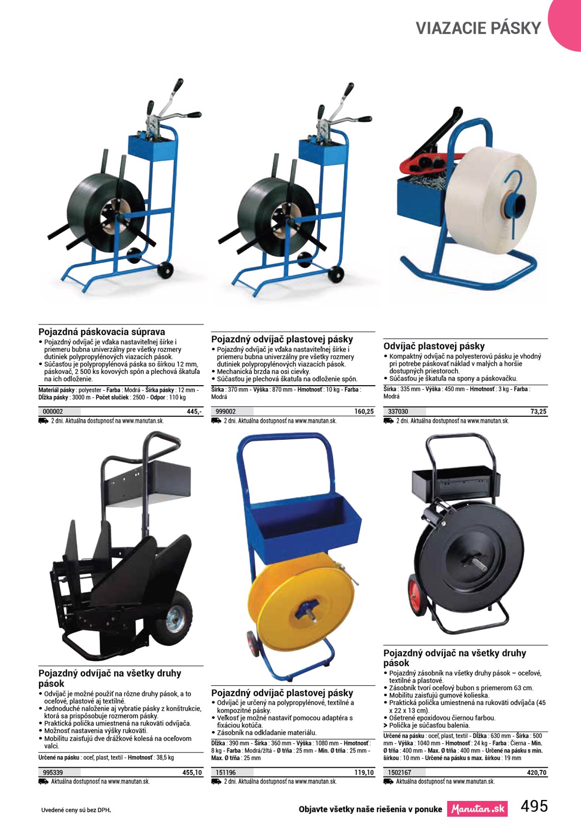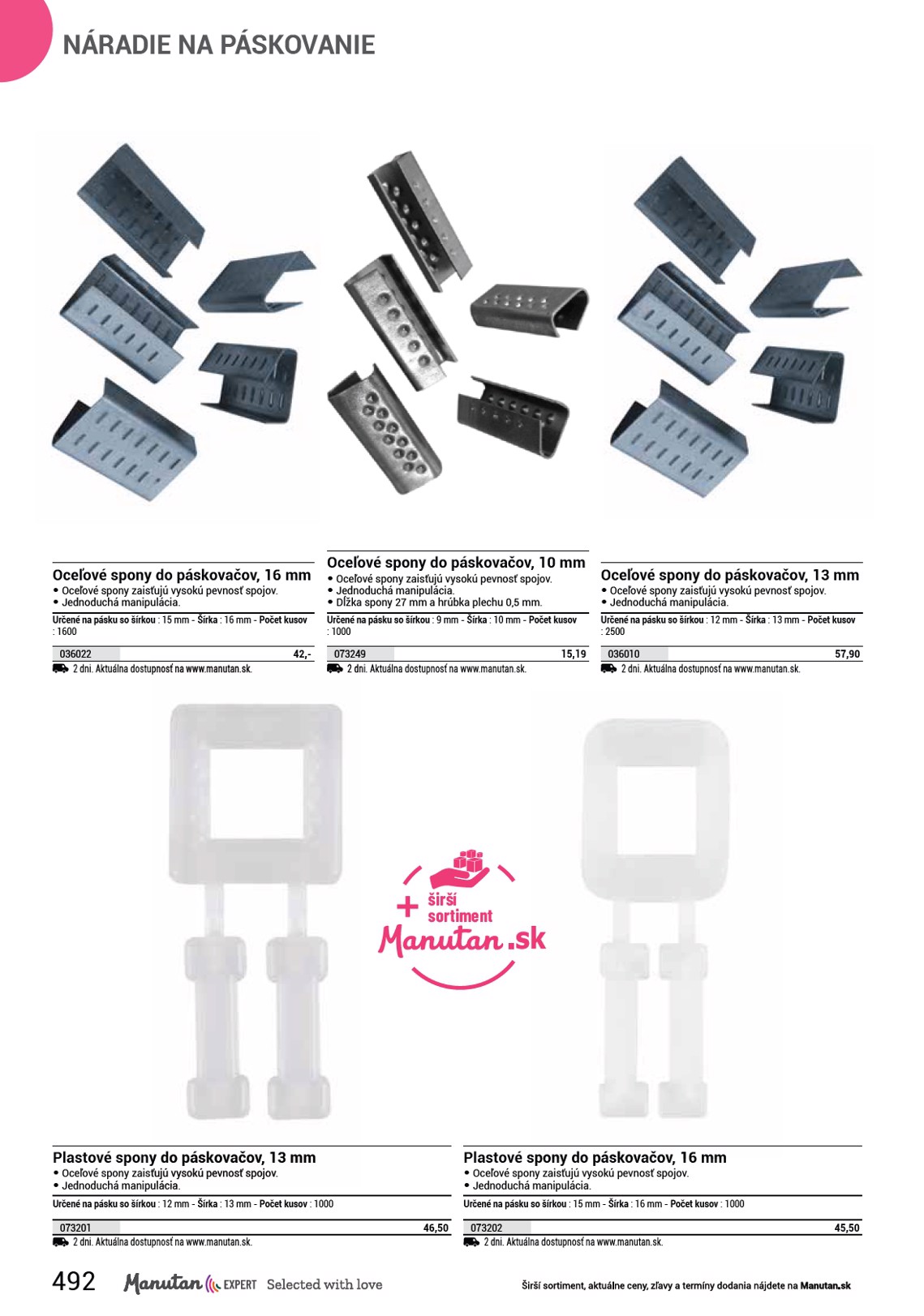 NÁRADIE NA PÁSKOVANIE Akumulátorový páskovač OR-T 260, pre pásku 12 - 13 mm • Ručný akumulátorový páskovač na spájanie polypropylénových a polyesterových viazacích pások. • Akumulátorový páskovač pomocou elektromotora pásku napína a následne vďaka treciemu mechanizmu pásku spojí zvarom. • Ide o ideálne riešenie páskovania tam, kde nie je stály prívod el. energie, alebo ako náhrada ťažkých pneumatických páskovačiek. Určené na pásku : polypropylén, polyester - Určené na pásku s min. šírkou : 12 mm - Určené na pásku s max. šírkou : 13 mm - Určené na pásku s min. hrúbkou : 0,5 mm - Určené na pásku s max. hrúbkou : 1 mm - Hmotnosť : 3,8 kg 041030 6 dní. Aktuálna dostupnosť na www.manutan.sk. 3 969,30 Akumulátorový páskovač OR-T 450, pre pásku 15 - 16 mm • Ručný akumulátorový páskovač na spájanie polypropylénových a polyesterových viazacích pások. • Akumulátorový páskovač pomocou elektromotora pásku napína a následne vďaka treciemu mechanizmu pásku spojí zvarom. • Páskovač je vhodný predovšetkým na páskovanie paliet, betonárskych, oceliarskych a iných nadmerných produktov. Určené na pásku : polypropylén, polyester - Určené na pásku s min. šírkou : 15 mm - Určené na pásku s max. šírkou : 16 mm - Určené na pásku s min. hrúbkou : 0,8 mm - Určené na pásku s max. hrúbkou : 1,3 mm - Hmotnosť : 4,3 kg 041031 6 dní. Aktuálna dostupnosť na www.manutan.sk. 4 424,10 491
