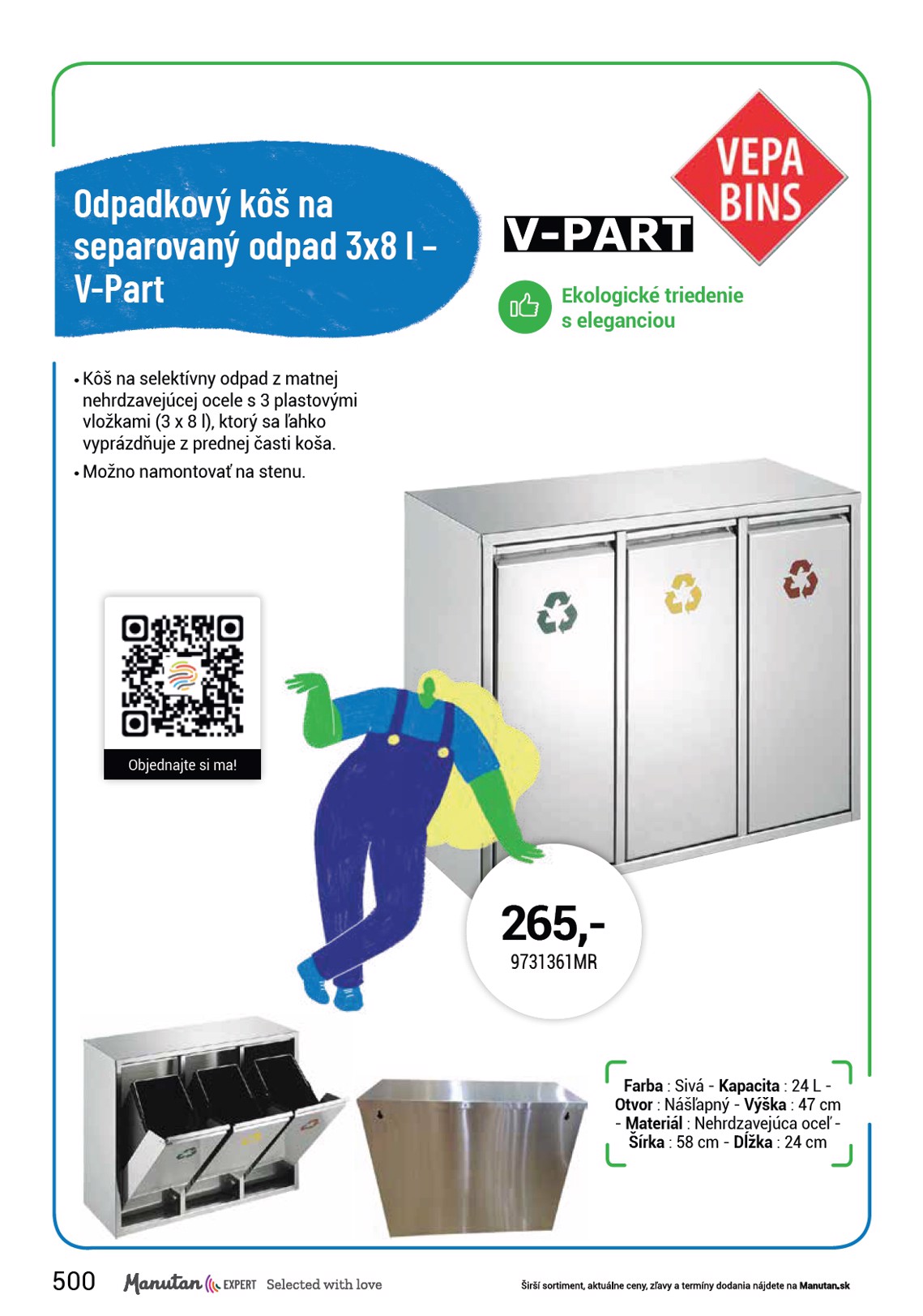 Odpadkový kôš na separovaný odpad 3x8 l – V-Part • Kôš na selektívny odpad z matnej nehrdzavejúcej ocele s 3 plastovými vložkami (3 x 8 l), ktorý sa ľahko vyprázdňuje z prednej časti koša. • Možno namontovať na stenu. Ekologické triedenie s eleganciou Objednajte si ma! 500 265,- 9731361MR Farba : Sivá - Kapacita : 24 L - Otvor : Nášľapný - Výška : 47 cm - Materiál : Nehrdzavejúca oceľ - Šírka : 58 cm - Dĺžka : 24 cm