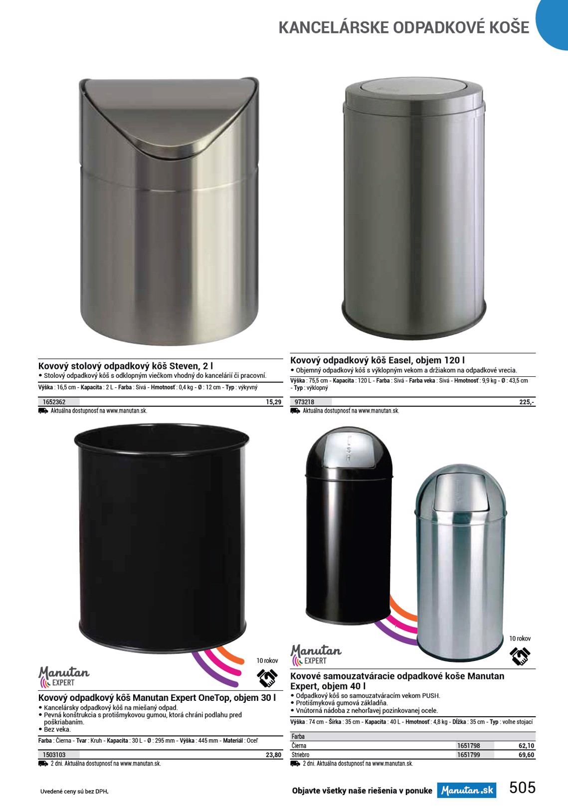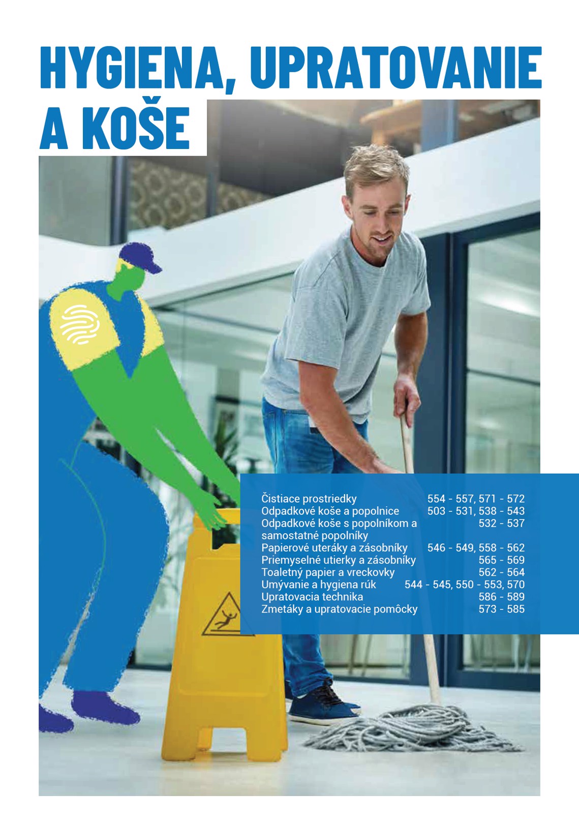 HYGIENA, UPRATOVANIE A KOŠE Čistiace prostriedky 554 - 557, 571 - 572 Odpadkové koše a popolnice 503 - 531, 538 - 543 Odpadkové koše s popolníkom a 532 - 537 samostatné popolníky Papierové uteráky a zásobníky 546 - 549, 558 - 562 Priemyselné utierky a zásobníky 565 - 569 Toaletný papier a vreckovky 562 - 564 Umývanie a hygiena rúk 544 - 545, 550 - 553, 570 Upratovacia technika 586 - 589 Zmetáky a upratovacie pomôcky 573 - 585