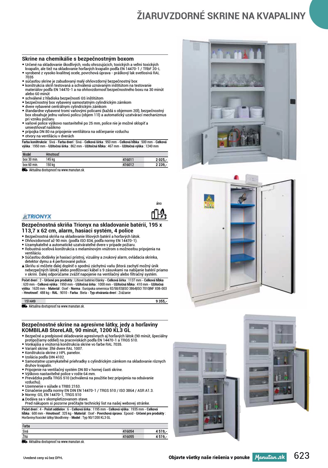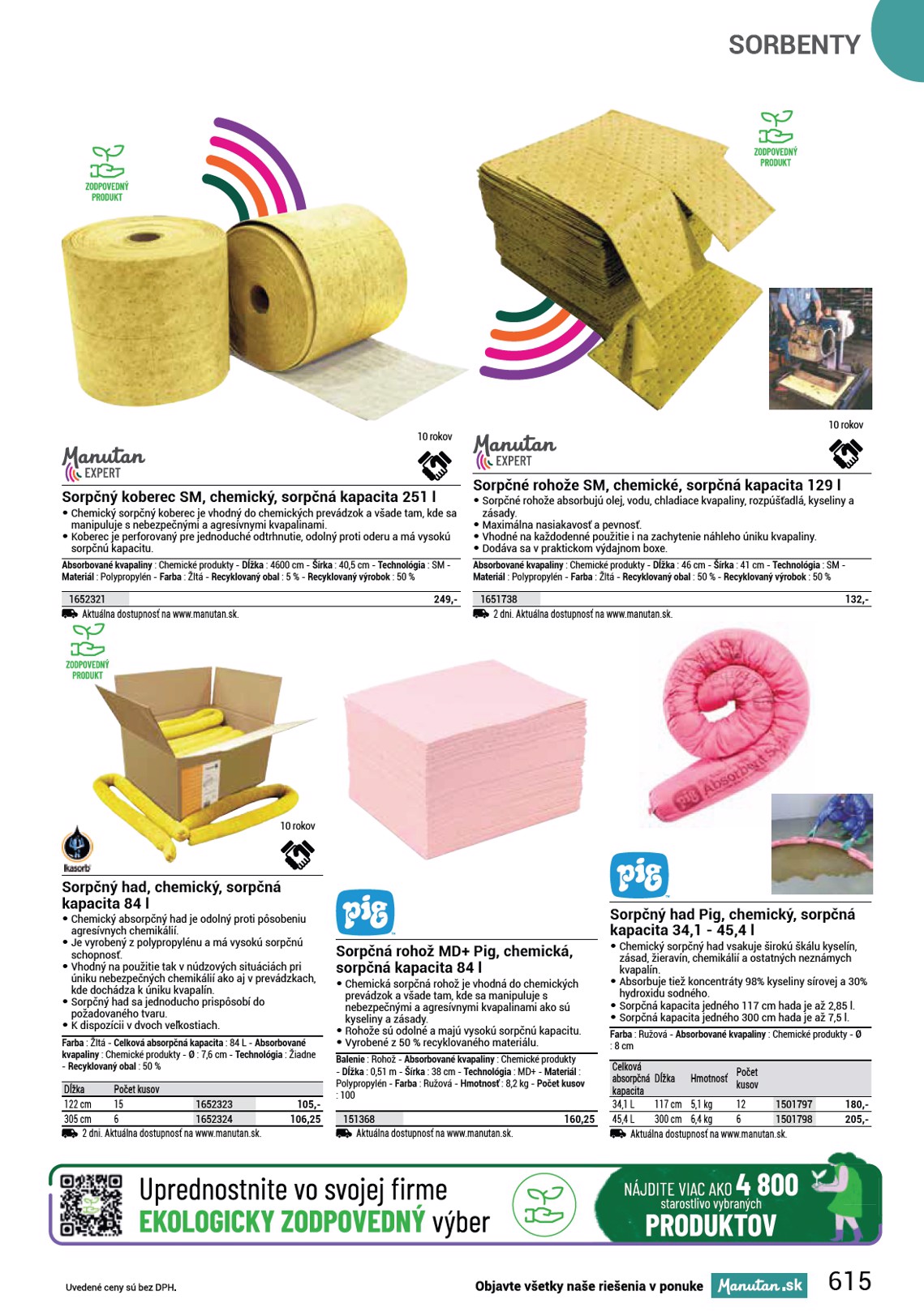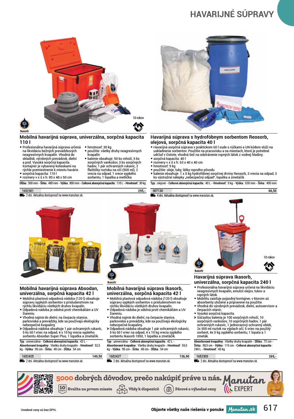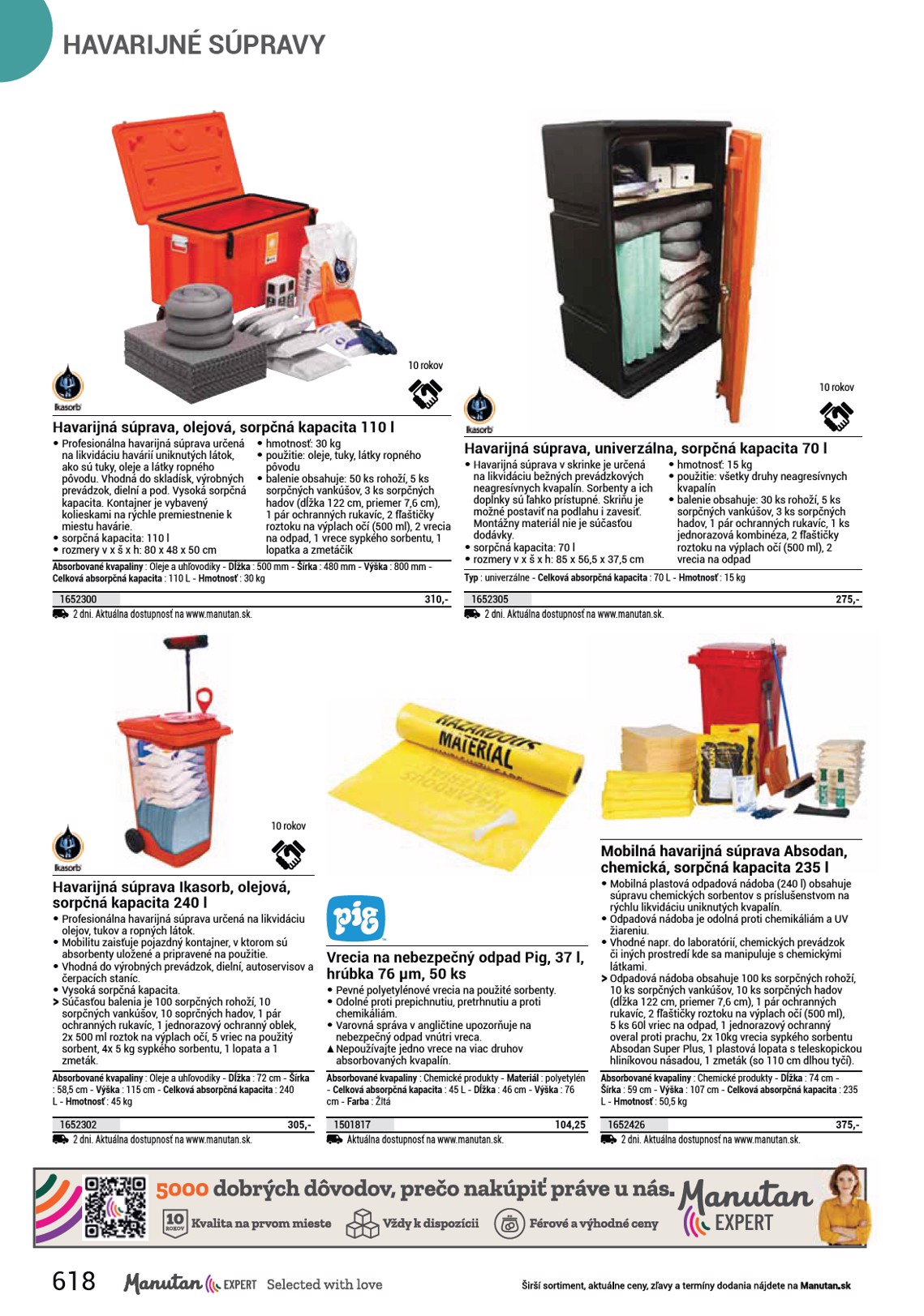 HAVARIJNÉ SÚPRAVY 10 rokov 10 rokov Havarijná súprava, olejová, sorpčná kapacita 110 l • Profesionálna havarijná súprava určená • hmotnosť: 30 kg na likvidáciu havárií uniknutých látok, • použitie: oleje, tuky, látky ropného ako sú tuky, oleje a látky ropného pôvodu pôvodu. Vhodná do skladísk, výrobných • balenie obsahuje: 50 ks rohoží, 5 ks prevádzok, dielní a pod. Vysoká sorpčná sorpčných vankúšov, 3 ks sorpčných kapacita. Kontajner je vybavený hadov (dĺžka 122 cm, priemer 7,6 cm), kolieskami na rýchle premiestnenie k 1 pár ochranných rukavíc, 2 fľaštičky miestu havárie. roztoku na výplach očí (500 ml), 2 vrecia • sorpčná kapacita: 110 l na odpad, 1 vrece sypkého sorbentu, 1 • rozmery v x š x h: 80 x 48 x 50 cm lopatka a zmetáčik Absorbované kvapaliny : Oleje a uhľovodíky - Dĺžka : 500 mm - Šírka : 480 mm - Výška : 800 mm - Celková absorpčná kapacita : 110 L - Hmotnosť : 30 kg 1652300 2 dni. Aktuálna dostupnosť na www.manutan.sk. 310,- Havarijná súprava, univerzálna, sorpčná kapacita 70 l • Havarijná súprava v skrinke je určená • hmotnosť: 15 kg na likvidáciu bežných prevádzkových • použitie: všetky druhy neagresívnych neagresívnych kvapalín. Sorbenty a ich kvapalín doplnky sú ľahko prístupné. Skriňu je • balenie obsahuje: 30 ks rohoží, 5 ks možné postaviť na podlahu i zavesiť. sorpčných vankúšov, 3 ks sorpčných Montážny materiál nie je súčasťou hadov, 1 pár ochranných rukavíc, 1 ks dodávky. jednorazová kombinéza, 2 fľaštičky • sorpčná kapacita: 70 l roztoku na výplach očí (500 ml), 2 • rozmery v x š x h: 85 x 56,5 x 37,5 cm vrecia na odpad Typ : univerzálne - Celková absorpčná kapacita : 70 L - Hmotnosť : 15 kg 1652305 2 dni. Aktuálna dostupnosť na www.manutan.sk. 275,- 10 rokov Havarijná súprava Ikasorb, olejová, sorpčná kapacita 240 l • Profesionálna havarijná súprava určená na likvidáciu olejov, tukov a ropných látok. • Mobilitu zaisťuje pojazdný kontajner, v ktorom sú absorbenty uložené a pripravené na použitie. • Vhodná do výrobných prevádzok, dielní, autoservisov a čerpacích staníc. • Vysoká sorpčná kapacita. OO Súčasťou balenia je 100 sorpčných rohoží, 10 sorpčných vankúšov, 10 soprčných hadov, 1 pár ochranných rukavíc, 1 jednorazový ochranný oblek, 2x 500 ml roztok na výplach očí, 5 vriec na použitý sorbent, 4x 5 kg sypkého sorbentu, 1 lopata a 1 zmeták. Absorbované kvapaliny : Oleje a uhľovodíky - Dĺžka : 72 cm - Šírka : 58,5 cm - Výška : 115 cm - Celková absorpčná kapacita : 240 L - Hmotnosť : 45 kg 1652302 2 dni. Aktuálna dostupnosť na www.manutan.sk. 305,- Vrecia na nebezpečný odpad Pig, 37 l, hrúbka 76 μm, 50 ks • Pevné polyetylénové vrecia na použité sorbenty. • Odolné proti prepichnutiu, pretrhnutiu a proti chemikáliám. • Varovná správa v angličtine upozorňuje na nebezpečný odpad vnútri vreca. SS Nepoužívajte jedno vrece na viac druhov absorbovaných kvapalín. Absorbované kvapaliny : Chemické produkty - Materiál : polyetylén - Celková absorpčná kapacita : 45 L - Dĺžka : 46 cm - Výška : 76 cm - Farba : Žltá 1501817 Aktuálna dostupnosť na www.manutan.sk. 104,25 Mobilná havarijná súprava Absodan, chemická, sorpčná kapacita 235 l • Mobilná plastová odpadová nádoba (240 l) obsahuje súpravu chemických sorbentov s príslušenstvom na rýchlu likvidáciu uniknutých kvapalín. • Odpadová nádoba je odolná proti chemikáliám a UV žiareniu. • Vhodné napr. do laboratórií, chemických prevádzok či iných prostredí kde sa manipuluje s chemickými látkami. OO Odpadová nádoba obsahuje 100 ks sorpčných rohoží, 10 ks sorpčných vankúšov, 10 ks sorpčných hadov (dĺžka 122 cm, priemer 7,6 cm), 1 pár ochranných rukavíc, 2 fľaštičky roztoku na výplach očí (500 ml), 5 ks 60l vriec na odpad, 1 jednorazový ochranný overal proti prachu, 2x 10kg vrecia sypkého sorbentu Absodan Super Plus, 1 plastová lopata s teleskopickou hliníkovou násadou, 1 zmeták (so 110 cm dlhou tyčí). Absorbované kvapaliny : Chemické produkty - Dĺžka : 74 cm - Šírka : 59 cm - Výška : 107 cm - Celková absorpčná kapacita : 235 L - Hmotnosť : 50,5 kg 1652426 2 dni. Aktuálna dostupnosť na www.manutan.sk. 375,- 618