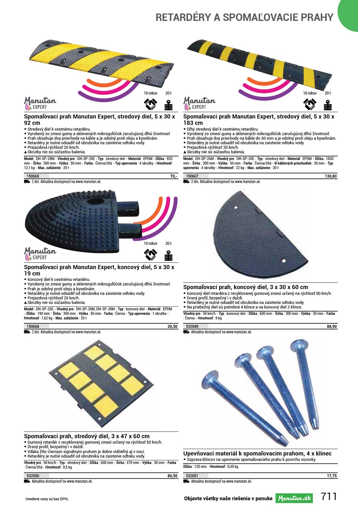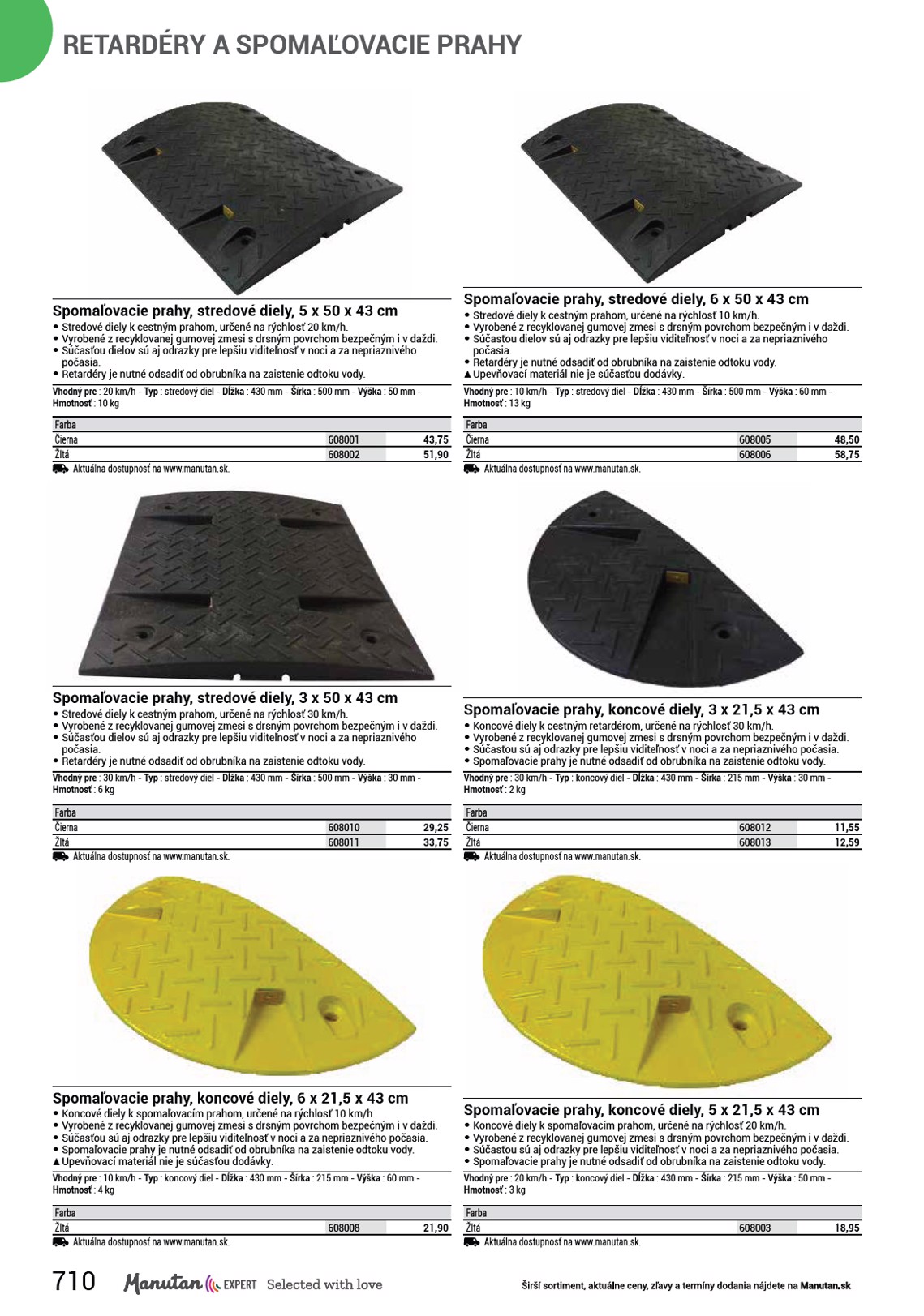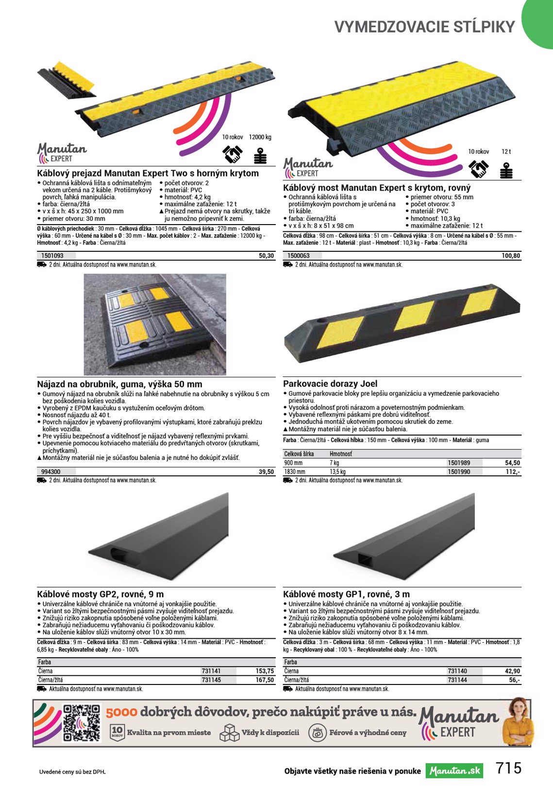 VYMEDZOVACIE STĹPIKY 10 rokov 12000 kg 10 rokov 12 t Káblový prejazd Manutan Expert Two s horným krytom • Ochranná káblová lišta s odnímateľným • počet otvorov: 2 vekom určená na 2 káble. Protišmykový • materiál: PVC povrch, ľahká manipulácia. • hmotnosť: 4,2 kg • farba: čierna/žltá • maximálne zaťaženie: 12 t • v x š x h: 45 x 250 x 1000 mm SS Prejazd nemá otvory na skrutky, takže • priemer otvoru: 30 mm ju nemožno pripevniť k zemi. Ø káblových priechodiek : 30 mm - Celková dĺžka : 1045 mm - Celková šírka : 270 mm - Celková výška : 60 mm - Určené na kábel s Ø : 30 mm - Max. počet káblov : 2 - Max. zaťaženie : 12000 kg - Hmotnosť : 4,2 kg - Farba : Čierna/žltá 1501093 2 dni. Aktuálna dostupnosť na www.manutan.sk. 50,30 Káblový most Manutan Expert s krytom, rovný • Ochranná káblová lišta s • priemer otvoru: 55 mm protišmykovým povrchom je určená na • počet otvorov: 3 tri káble. • materiál: PVC • farba: čierna/žltá • hmotnosť: 10,3 kg • v x š x h: 8 x 51 x 98 cm • maximálne zaťaženie: 12 t Celková dĺžka : 98 cm - Celková šírka : 51 cm - Celková výška : 8 cm - Určené na kábel s Ø : 55 mm - Max. zaťaženie : 12 t - Materiál : plast - Hmotnosť : 10,3 kg - Farba : Čierna/žltá 1500063 2 dni. Aktuálna dostupnosť na www.manutan.sk. 100,80 Nájazd na obrubník, guma, výška 50 mm • Gumový nájazd na obrubník slúži na ľahké nabehnutie na obrubníky s výškou 5 cm bez poškodenia kolies vozidla. • Vyrobený z EPDM kaučuku s vystužením oceľovým drôtom. • Nosnosť nájazdu až 40 t. • Povrch nájazdov je vybavený profilovanými výstupkami, ktoré zabraňujú preklzu kolies vozidla. • Pre vyššiu bezpečnosť a viditeľnosť je nájazd vybavený reflexnými prvkami. • Upevnenie pomocou kotviaceho materiálu do predvŕtaných otvorov (skrutkami, príchytkami). SS Montážny materiál nie je súčasťou balenia a je nutné ho dokúpiť zvlášť. 994300 2 dni. Aktuálna dostupnosť na www.manutan.sk. 39,50 Parkovacie dorazy Joel • Gumové parkovacie bloky pre lepšiu organizáciu a vymedzenie parkovacieho priestoru. • Vysoká odolnosť proti nárazom a poveternostným podmienkam. • Vybavené reflexnými páskami pre dobrú viditeľnosť. • Jednoduchá montáž ukotvením pomocou skrutiek do zeme. SS Montážny materiál nie je súčasťou balenia. Farba : Čierna/žltá - Celková hĺbka : 150 mm - Celková výška : 100 mm - Materiál : guma Celková šírka Hmotnosť 900 mm 7 kg 1830 mm 13,5 kg 2 dni. Aktuálna dostupnosť na www.manutan.sk. 1501989 1501990 54,50 112,- Káblové mosty GP2, rovné, 9 m • Univerzálne káblové chrániče na vnútorné aj vonkajšie použitie. • Variant so žltými bezpečnostnými pásmi zvyšuje viditeľnosť prejazdu. • Znižujú riziko zakopnutia spôsobené voľne položenými káblami. • Zabraňujú nežiaducemu vyťahovaniu či poškodzovaniu káblov. • Na uloženie káblov slúži vnútorný otvor 10 x 30 mm. Celková dĺžka : 9 m - Celková šírka : 83 mm - Celková výška : 14 mm - Materiál : PVC - Hmotnosť : 6,85 kg - Recyklovateľné obaly : Áno - 100% Farba Čierna Čierna/žltá Aktuálna dostupnosť na www.manutan.sk. 731141 731145 153,75 167,50 Káblové mosty GP1, rovné, 3 m • Univerzálne káblové chrániče na vnútorné aj vonkajšie použitie. • Variant so žltými bezpečnostnými pásmi zvyšuje viditeľnosť prejazdu. • Znižujú riziko zakopnutia spôsobené voľne položenými káblami. • Zabraňujú nežiaducemu vyťahovaniu či poškodzovaniu káblov. • Na uloženie káblov slúži vnútorný otvor 8 x 14 mm. Celková dĺžka : 3 m - Celková šírka : 68 mm - Celková výška : 11 mm - Materiál : PVC - Hmotnosť : 1,8 kg - Recyklovaný obal : 100 % - Recyklovateľné obaly : Áno - 100% Farba Čierna Čierna/žltá Aktuálna dostupnosť na www.manutan.sk. 731140 731144 42,90 56,- 715