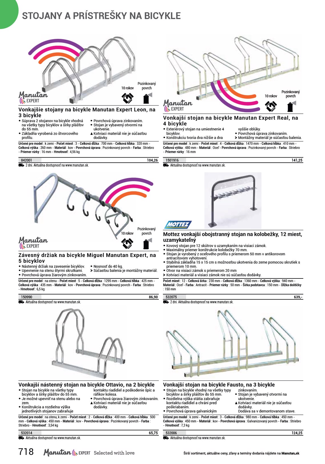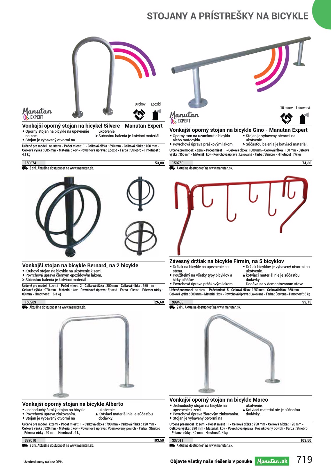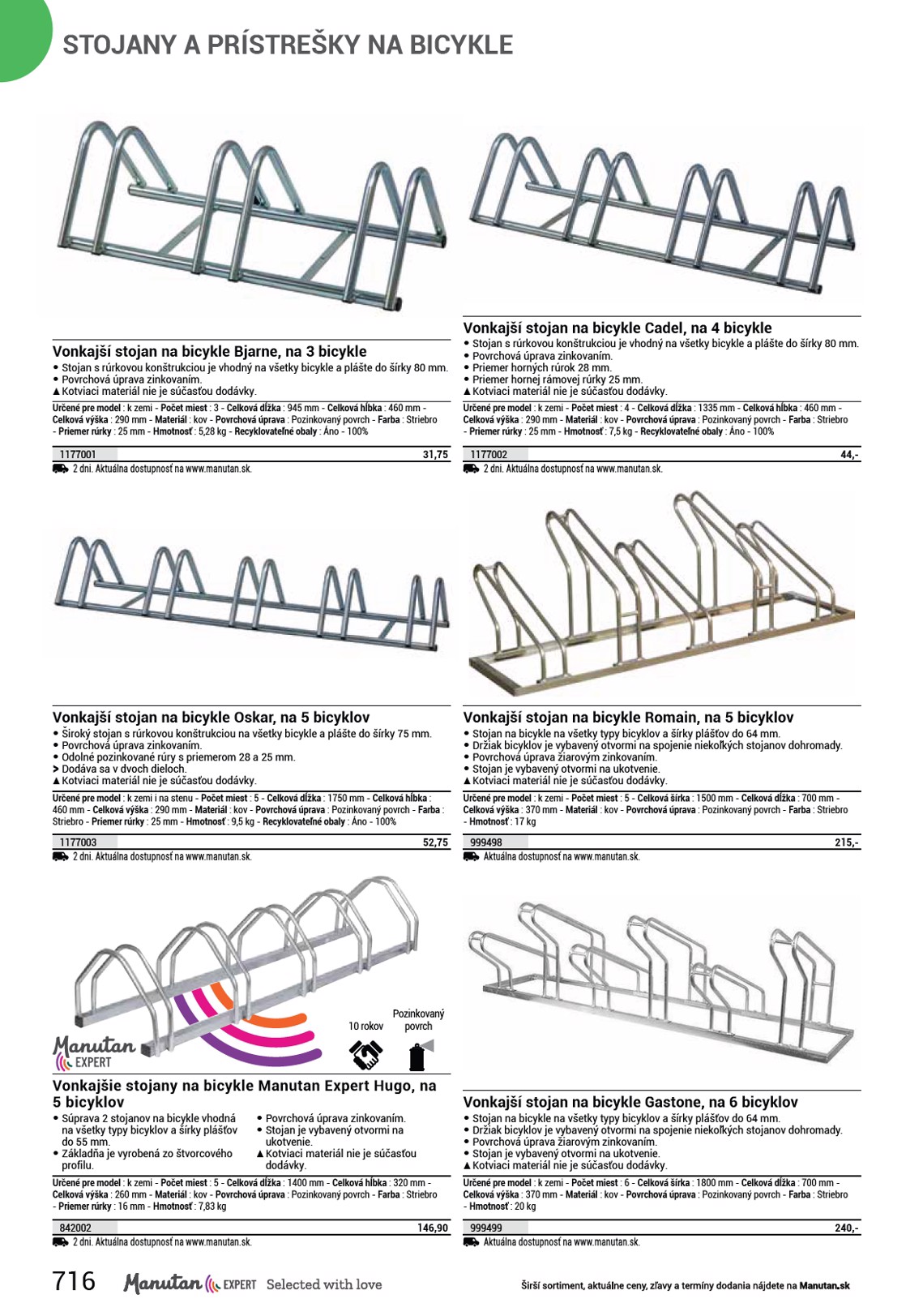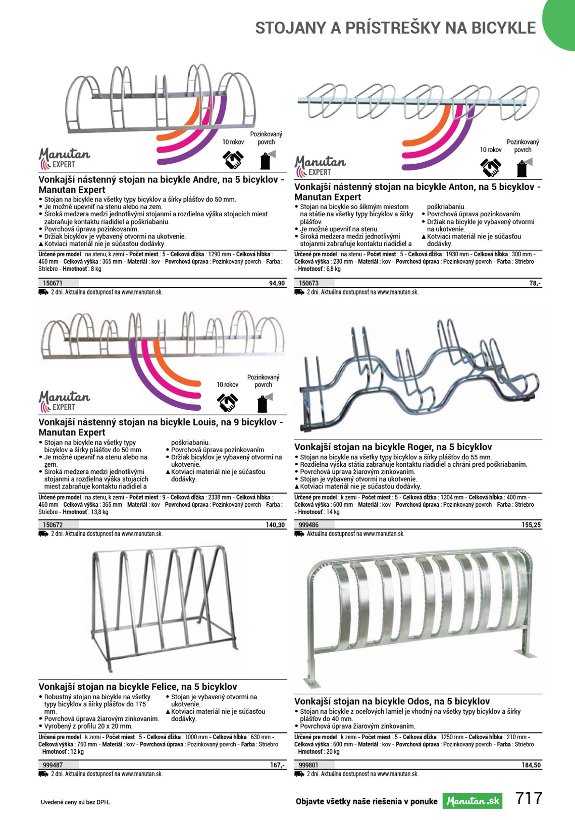 STOJANY A PRÍSTREŠKY NA BICYKLE Vonkajší stojan na bicykle Bjarne, na 3 bicykle • Stojan s rúrkovou konštrukciou je vhodný na všetky bicykle a plášte do šírky 80 mm. • Povrchová úprava zinkovaním. SS Kotviaci materiál nie je súčasťou dodávky. Určené pre model : k zemi - Počet miest : 3 - Celková dĺžka : 945 mm - Celková hĺbka : 460 mm - Celková výška : 290 mm - Materiál : kov - Povrchová úprava : Pozinkovaný povrch - Farba : Striebro - Priemer rúrky : 25 mm - Hmotnosť : 5,28 kg - Recyklovateľné obaly : Áno - 100% 1177001 2 dni. Aktuálna dostupnosť na www.manutan.sk. 31,75 Vonkajší stojan na bicykle Cadel, na 4 bicykle • Stojan s rúrkovou konštrukciou je vhodný na všetky bicykle a plášte do šírky 80 mm. • Povrchová úprava zinkovaním. • Priemer horných rúrok 28 mm. • Priemer hornej rámovej rúrky 25 mm. SS Kotviaci materiál nie je súčasťou dodávky. Určené pre model : k zemi - Počet miest : 4 - Celková dĺžka : 1335 mm - Celková hĺbka : 460 mm - Celková výška : 290 mm - Materiál : kov - Povrchová úprava : Pozinkovaný povrch - Farba : Striebro - Priemer rúrky : 25 mm - Hmotnosť : 7,5 kg - Recyklovateľné obaly : Áno - 100% 1177002 44,- 2 dni. Aktuálna dostupnosť na www.manutan.sk. Vonkajší stojan na bicykle Oskar, na 5 bicyklov • Široký stojan s rúrkovou konštrukciou na všetky bicykle a plášte do šírky 75 mm. • Povrchová úprava zinkovaním. • Odolné pozinkované rúry s priemerom 28 a 25 mm. OO Dodáva sa v dvoch dieloch. SS Kotviaci materiál nie je súčasťou dodávky. Určené pre model : k zemi i na stenu - Počet miest : 5 - Celková dĺžka : 1750 mm - Celková hĺbka : 460 mm - Celková výška : 290 mm - Materiál : kov - Povrchová úprava : Pozinkovaný povrch - Farba : Striebro - Priemer rúrky : 25 mm - Hmotnosť : 9,5 kg - Recyklovateľné obaly : Áno - 100% 1177003 2 dni. Aktuálna dostupnosť na www.manutan.sk. 52,75 Vonkajší stojan na bicykle Romain, na 5 bicyklov • Stojan na bicykle na všetky typy bicyklov a šírky plášťov do 64 mm. • Držiak bicyklov je vybavený otvormi na spojenie niekoľkých stojanov dohromady. • Povrchová úprava žiarovým zinkovaním. • Stojan je vybavený otvormi na ukotvenie. SS Kotviaci materiál nie je súčasťou dodávky. Určené pre model : k zemi - Počet miest : 5 - Celková šírka : 1500 mm - Celková dĺžka : 700 mm - Celková výška : 370 mm - Materiál : kov - Povrchová úprava : Pozinkovaný povrch - Farba : Striebro - Hmotnosť : 17 kg 999498 Aktuálna dostupnosť na www.manutan.sk. 215,- Pozinkovaný 10 rokov povrch Vonkajšie stojany na bicykle Manutan Expert Hugo, na 5 bicyklov • Súprava 2 stojanov na bicykle vhodná • Povrchová úprava zinkovaním. na všetky typy bicyklov a šírky plášťov • Stojan je vybavený otvormi na do 55 mm. ukotvenie. • Základňa je vyrobená zo štvorcového SS Kotviaci materiál nie je súčasťou profilu. dodávky. Určené pre model : k zemi - Počet miest : 5 - Celková dĺžka : 1400 mm - Celková hĺbka : 320 mm - Celková výška : 260 mm - Materiál : kov - Povrchová úprava : Pozinkovaný povrch - Farba : Striebro - Priemer rúrky : 16 mm - Hmotnosť : 7,83 kg 842002 2 dni. Aktuálna dostupnosť na www.manutan.sk. 146,90 Vonkajší stojan na bicykle Gastone, na 6 bicyklov • Stojan na bicykle na všetky typy bicyklov a šírky plášťov do 64 mm. • Držiak bicyklov je vybavený otvormi na spojenie niekoľkých stojanov dohromady. • Povrchová úprava žiarovým zinkovaním. • Stojan je vybavený otvormi na ukotvenie. SS Kotviaci materiál nie je súčasťou dodávky. Určené pre model : k zemi - Počet miest : 6 - Celková šírka : 1800 mm - Celková dĺžka : 700 mm - Celková výška : 370 mm - Materiál : kov - Povrchová úprava : Pozinkovaný povrch - Farba : Striebro - Hmotnosť : 20 kg 999499 Aktuálna dostupnosť na www.manutan.sk. 240,- 716