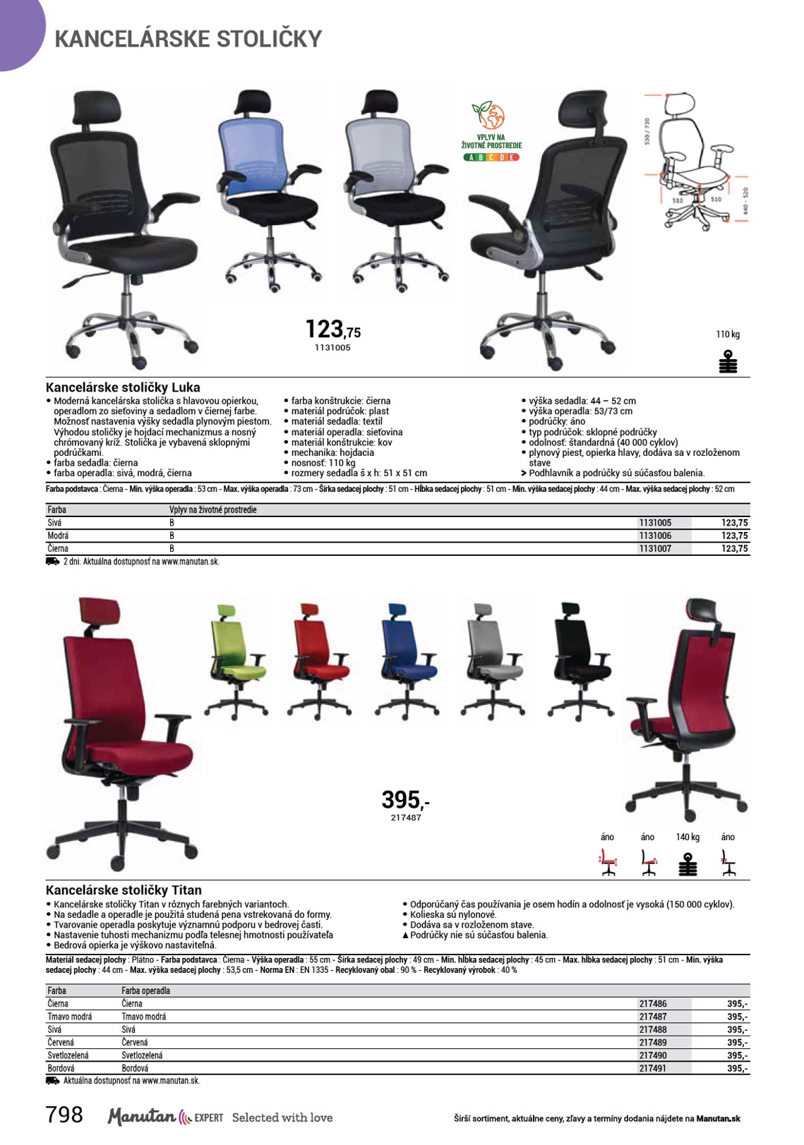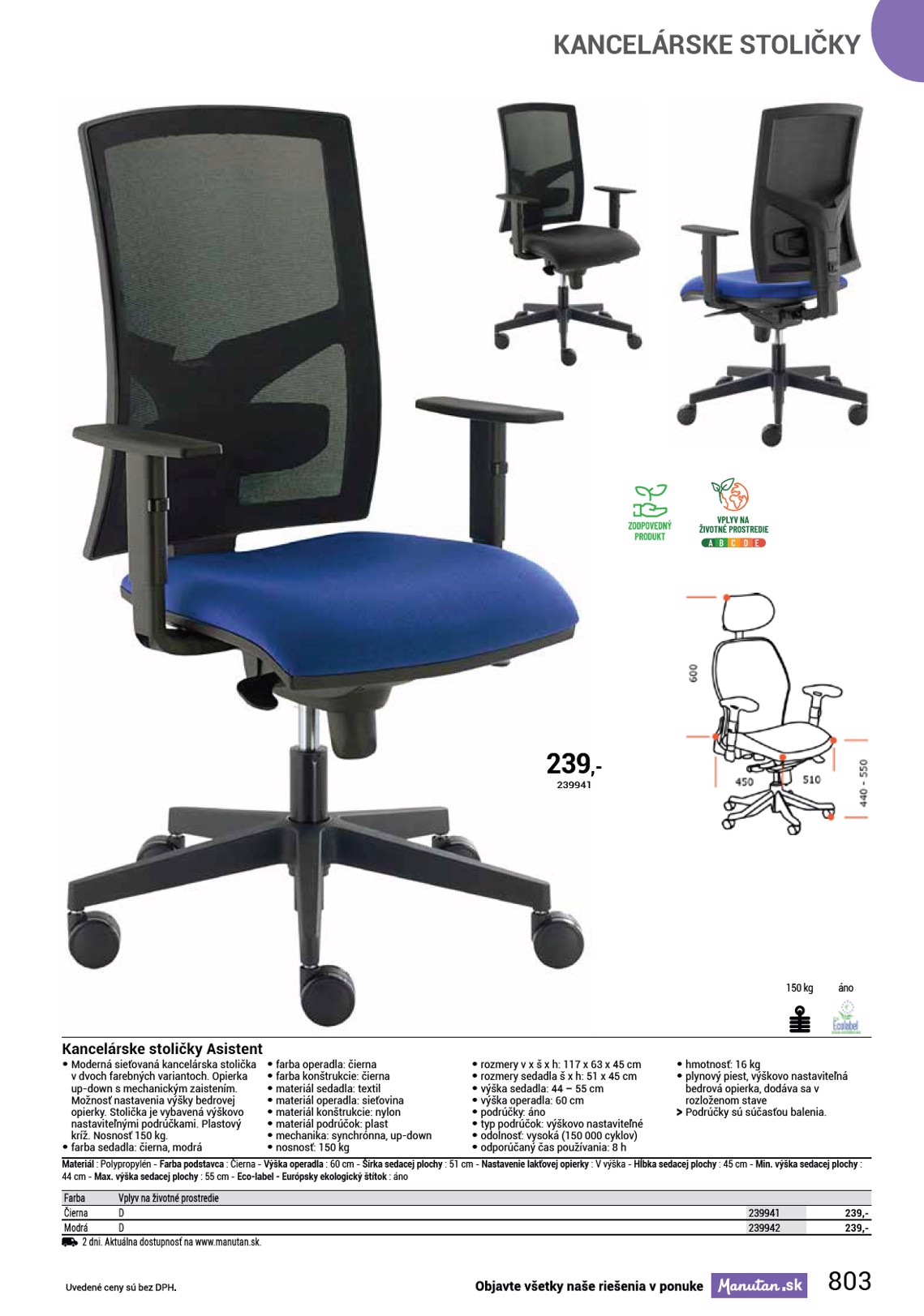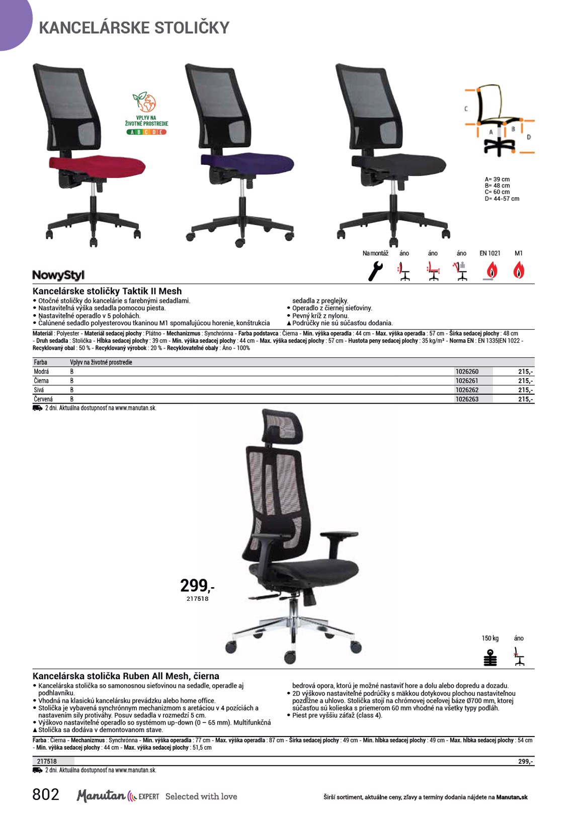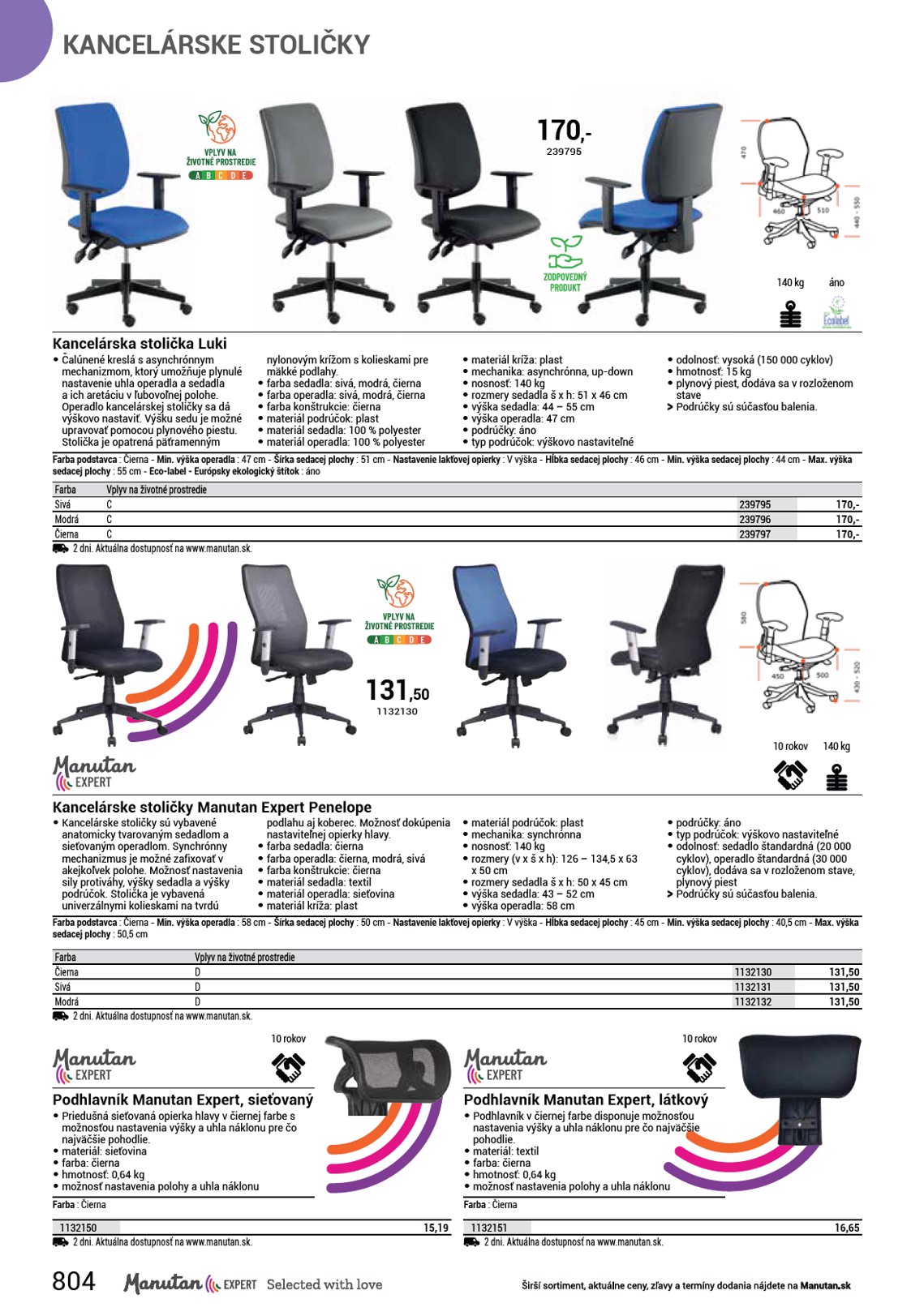 KANCELÁRSKE STOLIČKY 170 ,- 239795 140 kg áno Kancelárska stolička Luki • Čalúnené kreslá s asynchrónnym mechanizmom, ktorý umožňuje plynulé nastavenie uhla operadla a sedadla a ich aretáciu v ľubovoľnej polohe. Operadlo kancelárskej stoličky sa dá výškovo nastaviť. Výšku sedu je možné upravovať pomocou plynového piestu. Stolička je opatrená päťramenným nylonovým krížom s kolieskami pre mäkké podlahy. • farba sedadla: sivá, modrá, čierna • farba operadla: sivá, modrá, čierna • farba konštrukcie: čierna • materiál podrúčok: plast • materiál sedadla: 100 % polyester • materiál operadla: 100 % polyester • materiál kríža: plast • mechanika: asynchrónna, up-down • nosnosť: 140 kg • rozmery sedadla š x h: 51 x 46 cm • výška sedadla: 44 – 55 cm • výška operadla: 47 cm • podrúčky: áno • typ podrúčok: výškovo nastaviteľné • odolnosť: vysoká (150 000 cyklov) • hmotnosť: 15 kg • plynový piest, dodáva sa v rozloženom stave OO Podrúčky sú súčasťou balenia. Farba podstavca : Čierna - Min. výška operadla : 47 cm - Šírka sedacej plochy : 51 cm - Nastavenie lakťovej opierky : V výška - Hĺbka sedacej plochy : 46 cm - Min. výška sedacej plochy : 44 cm - Max. výška sedacej plochy : 55 cm - Eco-label - Európsky ekologický štítok : áno Farba Vplyv na životné prostredie Sivá C Modrá C Čierna C 2 dni. Aktuálna dostupnosť na www.manutan.sk. 239795 239796 239797 170,- 170,- 170,- 131 ,50 1132130 10 rokov 140 kg Kancelárske stoličky Manutan Expert Penelope • Kancelárske stoličky sú vybavené podlahu aj koberec. Možnosť dokúpenia anatomicky tvarovaným sedadlom a nastaviteľnej opierky hlavy. sieťovaným operadlom. Synchrónny • farba sedadla: čierna mechanizmus je možné zafixovať v • farba operadla: čierna, modrá, sivá akejkoľvek polohe. Možnosť nastavenia • farba konštrukcie: čierna sily protiváhy, výšky sedadla a výšky • materiál sedadla: textil podrúčok. Stolička je vybavená • materiál operadla: sieťovina univerzálnymi kolieskami na tvrdú • materiál kríža: plast • materiál podrúčok: plast • mechanika: synchrónna • nosnosť: 140 kg • rozmery (v x š x h): 126 – 134,5 x 63 x 50 cm • rozmery sedadla š x h: 50 x 45 cm • výška sedadla: 43 – 52 cm • výška operadla: 58 cm • podrúčky: áno • typ podrúčok: výškovo nastaviteľné • odolnosť: sedadlo štandardná (20 000 cyklov), operadlo štandardná (30 000 cyklov), dodáva sa v rozloženom stave, plynový piest OO Podrúčky sú súčasťou balenia. Farba podstavca : Čierna - Min. výška operadla : 58 cm - Šírka sedacej plochy : 50 cm - Nastavenie lakťovej opierky : V výška - Hĺbka sedacej plochy : 45 cm - Min. výška sedacej plochy : 40,5 cm - Max. výška sedacej plochy : 50,5 cm Farba Vplyv na životné prostredie Čierna D Sivá D Modrá D 2 dni. Aktuálna dostupnosť na www.manutan.sk. 1132130 1132131 1132132 131,50 131,50 131,50 10 rokov 10 rokov Podhlavník Manutan Expert, sieťovaný • Priedušná sieťovaná opierka hlavy v čiernej farbe s možnosťou nastavenia výšky a uhla náklonu pre čo najväčšie pohodlie. • materiál: sieťovina • farba: čierna • hmotnosť: 0,64 kg • možnosť nastavenia polohy a uhla náklonu Farba : Čierna 1132150 2 dni. Aktuálna dostupnosť na www.manutan.sk. 804 15,19 Podhlavník Manutan Expert, látkový • Podhlavník v čiernej farbe disponuje možnosťou nastavenia výšky a uhla náklonu pre čo najväčšie pohodlie. • materiál: textil • farba: čierna • hmotnosť: 0,64 kg • možnosť nastavenia polohy a uhla náklonu Farba : Čierna 1132151 2 dni. Aktuálna dostupnosť na www.manutan.sk. 16,65