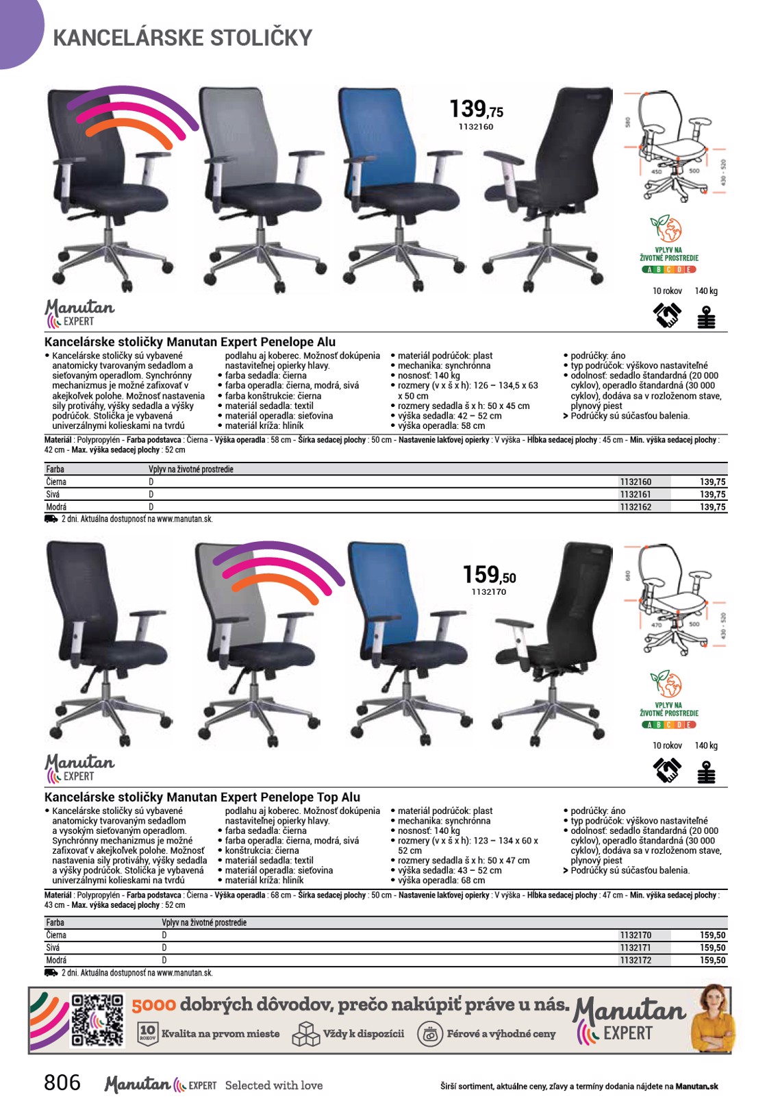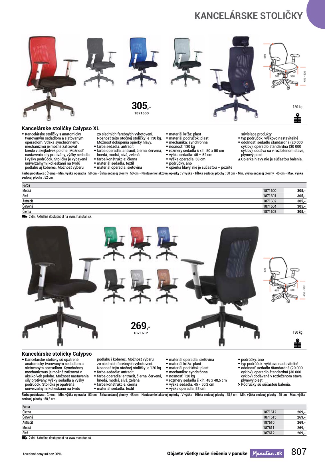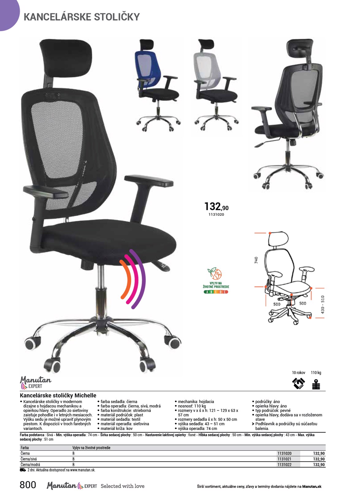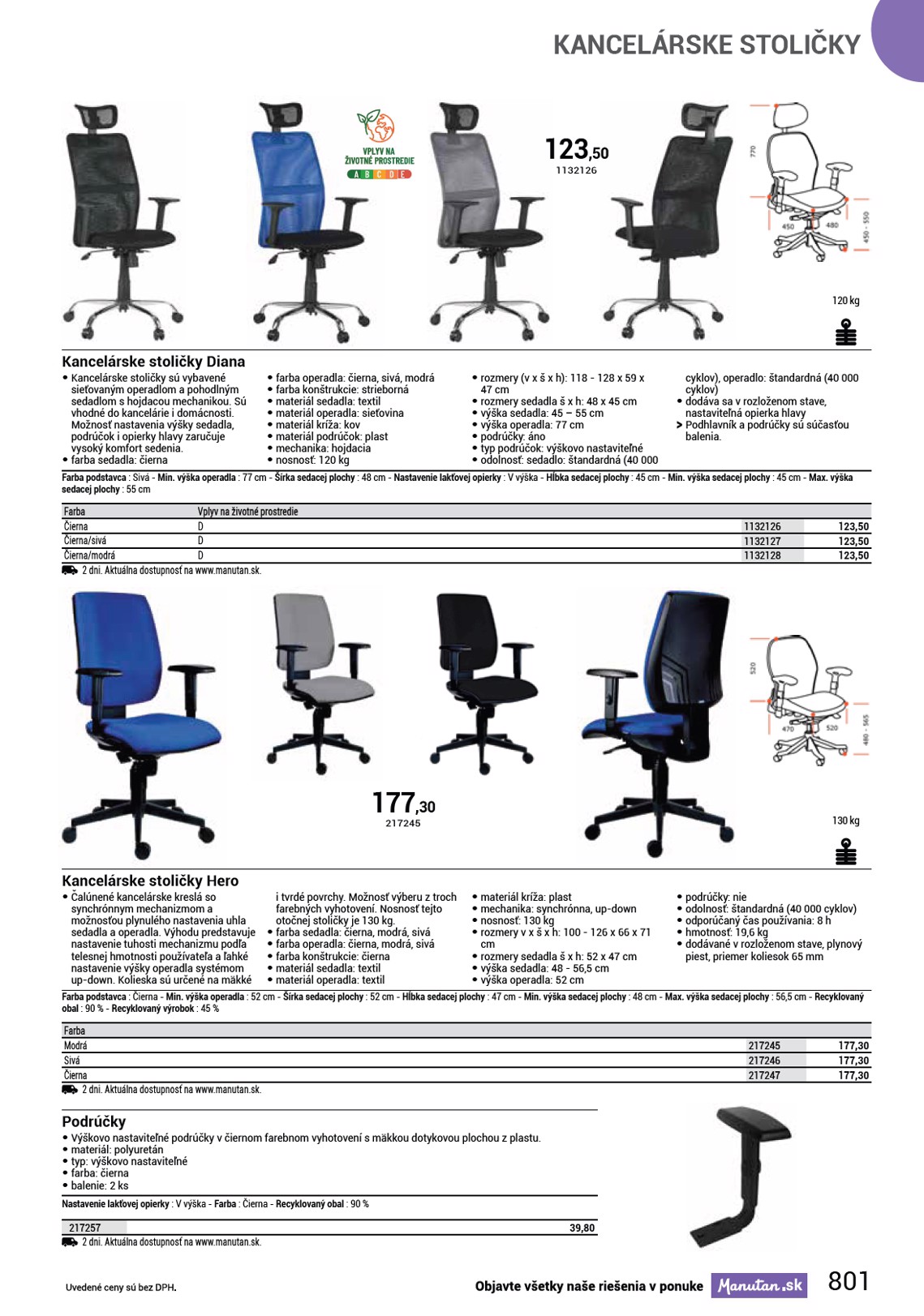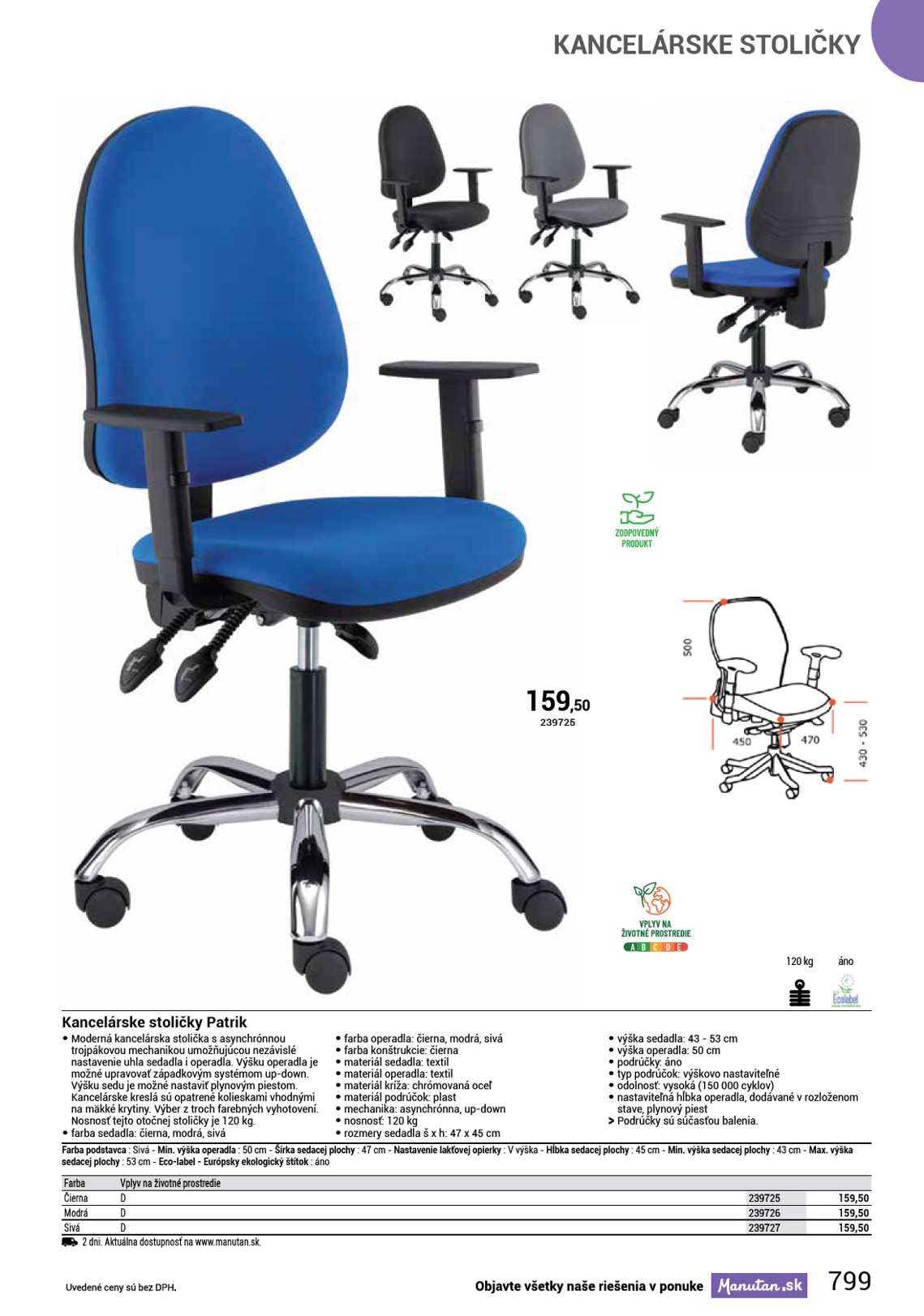 KANCELÁRSKE STOLIČKY 170 ,- 239795 140 kg áno Kancelárska stolička Luki • Čalúnené kreslá s asynchrónnym mechanizmom, ktorý umožňuje plynulé nastavenie uhla operadla a sedadla a ich aretáciu v ľubovoľnej polohe. Operadlo kancelárskej stoličky sa dá výškovo nastaviť. Výšku sedu je možné upravovať pomocou plynového piestu. Stolička je opatrená päťramenným nylonovým krížom s kolieskami pre mäkké podlahy. • farba sedadla: sivá, modrá, čierna • farba operadla: sivá, modrá, čierna • farba konštrukcie: čierna • materiál podrúčok: plast • materiál sedadla: 100 % polyester • materiál operadla: 100 % polyester • materiál kríža: plast • mechanika: asynchrónna, up-down • nosnosť: 140 kg • rozmery sedadla š x h: 51 x 46 cm • výška sedadla: 44 – 55 cm • výška operadla: 47 cm • podrúčky: áno • typ podrúčok: výškovo nastaviteľné • odolnosť: vysoká (150 000 cyklov) • hmotnosť: 15 kg • plynový piest, dodáva sa v rozloženom stave OO Podrúčky sú súčasťou balenia. Farba podstavca : Čierna - Min. výška operadla : 47 cm - Šírka sedacej plochy : 51 cm - Nastavenie lakťovej opierky : V výška - Hĺbka sedacej plochy : 46 cm - Min. výška sedacej plochy : 44 cm - Max. výška sedacej plochy : 55 cm - Eco-label - Európsky ekologický štítok : áno Farba Vplyv na životné prostredie Sivá C Modrá C Čierna C 2 dni. Aktuálna dostupnosť na www.manutan.sk. 239795 239796 239797 170,- 170,- 170,- 131 ,50 1132130 10 rokov 140 kg Kancelárske stoličky Manutan Expert Penelope • Kancelárske stoličky sú vybavené podlahu aj koberec. Možnosť dokúpenia anatomicky tvarovaným sedadlom a nastaviteľnej opierky hlavy. sieťovaným operadlom. Synchrónny • farba sedadla: čierna mechanizmus je možné zafixovať v • farba operadla: čierna, modrá, sivá akejkoľvek polohe. Možnosť nastavenia • farba konštrukcie: čierna sily protiváhy, výšky sedadla a výšky • materiál sedadla: textil podrúčok. Stolička je vybavená • materiál operadla: sieťovina univerzálnymi kolieskami na tvrdú • materiál kríža: plast • materiál podrúčok: plast • mechanika: synchrónna • nosnosť: 140 kg • rozmery (v x š x h): 126 – 134,5 x 63 x 50 cm • rozmery sedadla š x h: 50 x 45 cm • výška sedadla: 43 – 52 cm • výška operadla: 58 cm • podrúčky: áno • typ podrúčok: výškovo nastaviteľné • odolnosť: sedadlo štandardná (20 000 cyklov), operadlo štandardná (30 000 cyklov), dodáva sa v rozloženom stave, plynový piest OO Podrúčky sú súčasťou balenia. Farba podstavca : Čierna - Min. výška operadla : 58 cm - Šírka sedacej plochy : 50 cm - Nastavenie lakťovej opierky : V výška - Hĺbka sedacej plochy : 45 cm - Min. výška sedacej plochy : 40,5 cm - Max. výška sedacej plochy : 50,5 cm Farba Vplyv na životné prostredie Čierna D Sivá D Modrá D 2 dni. Aktuálna dostupnosť na www.manutan.sk. 1132130 1132131 1132132 131,50 131,50 131,50 10 rokov 10 rokov Podhlavník Manutan Expert, sieťovaný • Priedušná sieťovaná opierka hlavy v čiernej farbe s možnosťou nastavenia výšky a uhla náklonu pre čo najväčšie pohodlie. • materiál: sieťovina • farba: čierna • hmotnosť: 0,64 kg • možnosť nastavenia polohy a uhla náklonu Farba : Čierna 1132150 2 dni. Aktuálna dostupnosť na www.manutan.sk. 804 15,19 Podhlavník Manutan Expert, látkový • Podhlavník v čiernej farbe disponuje možnosťou nastavenia výšky a uhla náklonu pre čo najväčšie pohodlie. • materiál: textil • farba: čierna • hmotnosť: 0,64 kg • možnosť nastavenia polohy a uhla náklonu Farba : Čierna 1132151 2 dni. Aktuálna dostupnosť na www.manutan.sk. 16,65