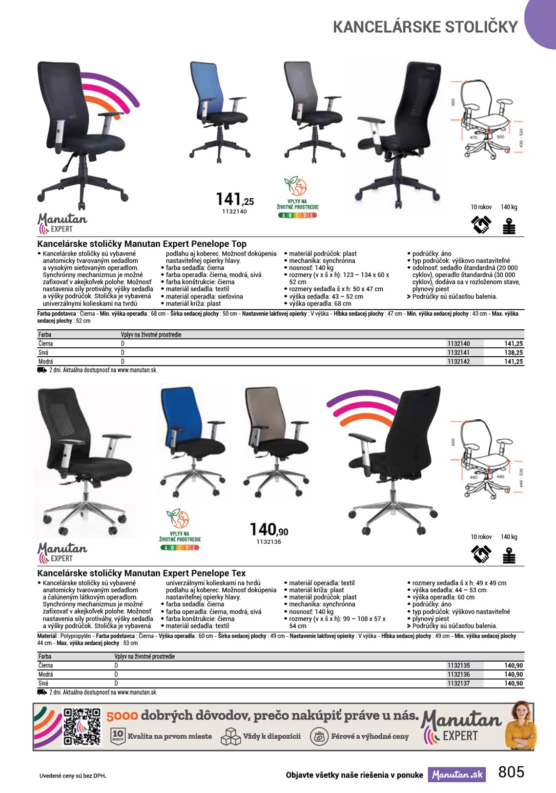 KANCELÁRSKE STOLIČKY 141 ,25 1132140 10 rokov 140 kg Kancelárske stoličky Manutan Expert Penelope Top • Kancelárske stoličky sú vybavené podlahu aj koberec. Možnosť dokúpenia anatomicky tvarovaným sedadlom nastaviteľnej opierky hlavy. a vysokým sieťovaným operadlom. • farba sedadla: čierna Synchrónny mechanizmus je možné • farba operadla: čierna, modrá, sivá zafixovať v akejkoľvek polohe. Možnosť • farba konštrukcie: čierna nastavenia sily protiváhy, výšky sedadla • materiál sedadla: textil a výšky podrúčok. Stolička je vybavená • materiál operadla: sieťovina univerzálnymi kolieskami na tvrdú • materiál kríža: plast • materiál podrúčok: plast • mechanika: synchrónna • nosnosť: 140 kg • rozmery (v x š x h): 123 – 134 x 60 x 52 cm • rozmery sedadla š x h: 50 x 47 cm • výška sedadla: 43 – 52 cm • výška operadla: 68 cm • podrúčky: áno • typ podrúčok: výškovo nastaviteľné • odolnosť: sedadlo štandardná (20 000 cyklov), operadlo štandardná (30 000 cyklov), dodáva sa v rozloženom stave, plynový piest OO Podrúčky sú súčasťou balenia. Farba podstavca : Čierna - Min. výška operadla : 68 cm - Šírka sedacej plochy : 50 cm - Nastavenie lakťovej opierky : V výška - Hĺbka sedacej plochy : 47 cm - Min. výška sedacej plochy : 43 cm - Max. výška sedacej plochy : 52 cm Farba Vplyv na životné prostredie Čierna D Sivá D Modrá D 2 dni. Aktuálna dostupnosť na www.manutan.sk. 1132140 1132141 1132142 141,25 138,25 141,25 140 ,90 1132135 10 rokov 140 kg Kancelárske stoličky Manutan Expert Penelope Tex • Kancelárske stoličky sú vybavené univerzálnymi kolieskami na tvrdú anatomicky tvarovaným sedadlom podlahu aj koberec. Možnosť dokúpenia a čalúneným látkovým operadlom. nastaviteľnej opierky hlavy. Synchrónny mechanizmus je možné • farba sedadla: čierna zafixovať v akejkoľvek polohe. Možnosť • farba operadla: čierna, modrá, sivá nastavenia sily protiváhy, výšky sedadla • farba konštrukcie: čierna a výšky podrúčok. Stolička je vybavená • materiál sedadla: textil • materiál operadla: textil • materiál kríža: plast • materiál podrúčok: plast • mechanika: synchrónna • nosnosť: 140 kg • rozmery (v x š x h): 99 – 108 x 57 x 54 cm • rozmery sedadla š x h: 49 x 49 cm • výška sedadla: 44 – 53 cm • výška operadla: 60 cm • podrúčky: áno • typ podrúčok: výškovo nastaviteľné • plynový piest OO Podrúčky sú súčasťou balenia. Materiál : Polypropylén - Farba podstavca : Čierna - Výška operadla : 60 cm - Šírka sedacej plochy : 49 cm - Nastavenie lakťovej opierky : V výška - Hĺbka sedacej plochy : 49 cm - Min. výška sedacej plochy : 44 cm - Max. výška sedacej plochy : 53 cm Farba Vplyv na životné prostredie Čierna D Modrá D Sivá D 2 dni. Aktuálna dostupnosť na www.manutan.sk. 1132135 1132136 1132137 140,90 140,90 140,90 805