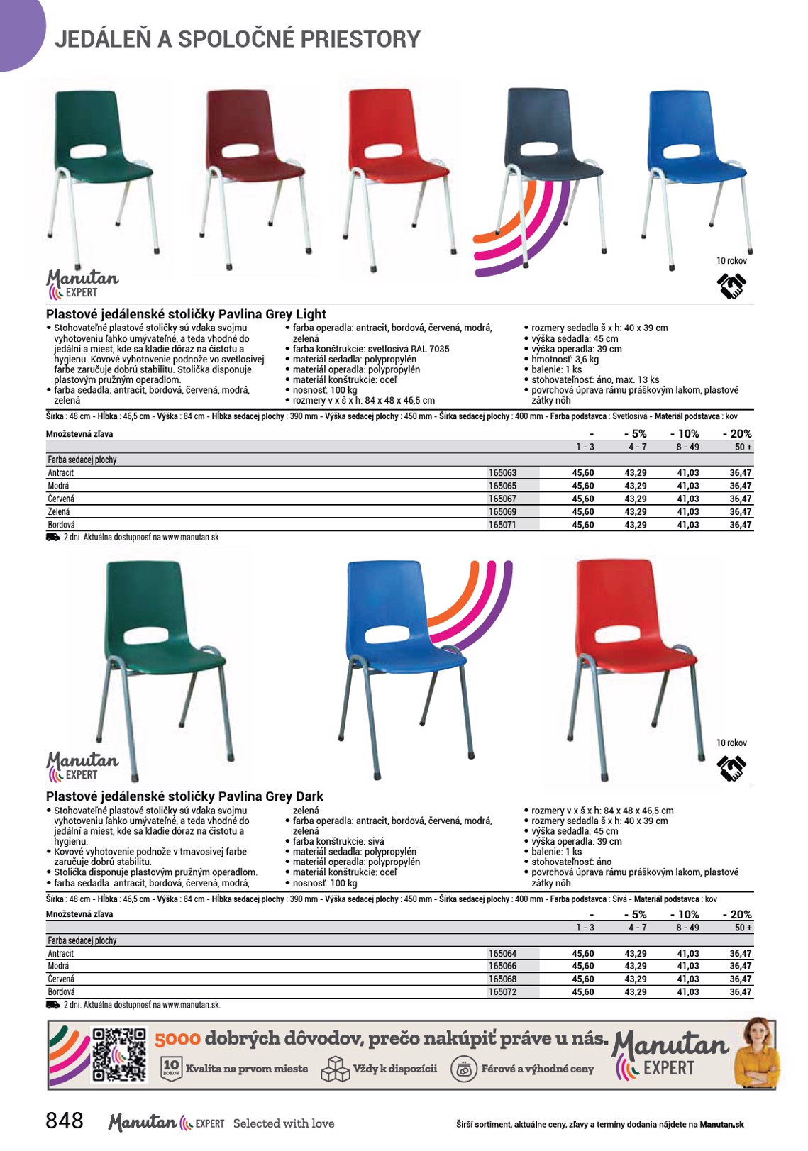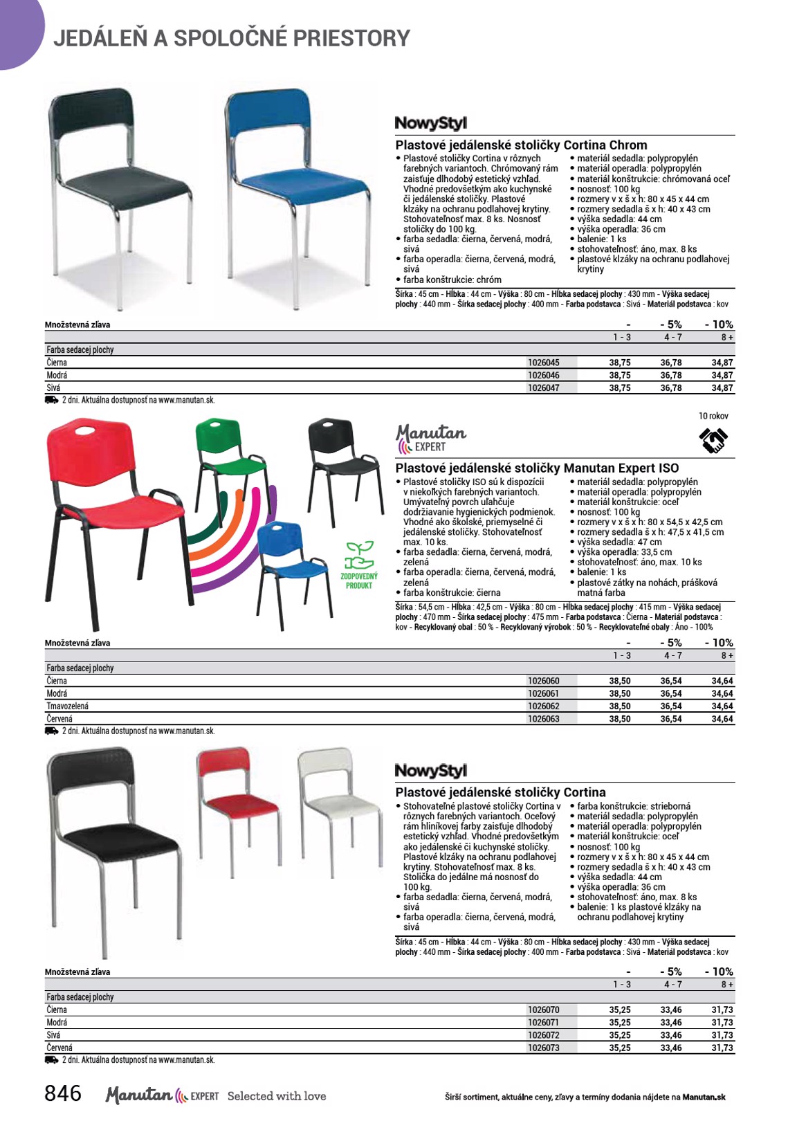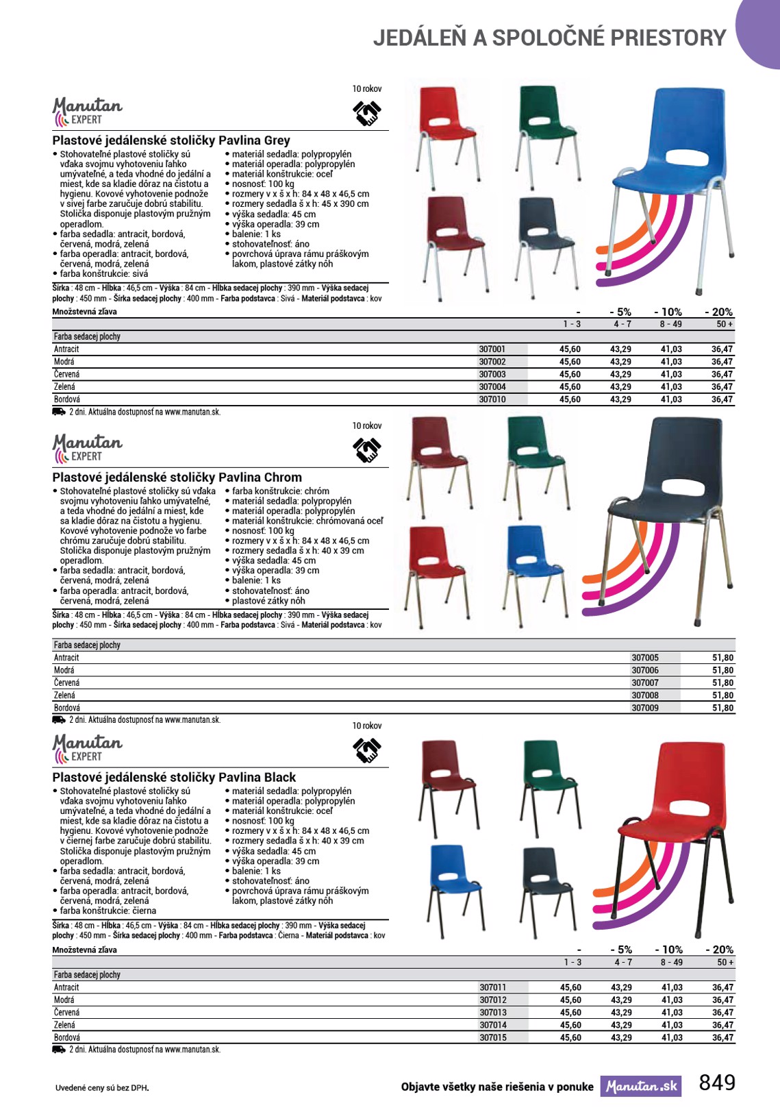 JEDÁLEŇ A SPOLOČNÉ PRIESTORY 10 rokov Plastové jedálenské stoličky • Stohovateľné plastové stoličky sú vďaka svojmu vyhotoveniu ľahko umývateľné, a teda vhodné do jedální a miest, kde sa kladie dôraz na čistotu a hygienu. Kovové vyhotovenie podnože v sivej farbe zaručuje dobrú stabilitu. Stolička disponuje plastovým pružným operadlom. • farba sedadla: antracit, bordová, červená, modrá, zelená • farba operadla: antracit, bordová, červená, modrá, zelená • farba konštrukcie: sivá Pavlina Grey • materiál sedadla: polypropylén • materiál operadla: polypropylén • materiál konštrukcie: oceľ • nosnosť: 100 kg • rozmery v x š x h: 84 x 48 x 46,5 cm • rozmery sedadla š x h: 45 x 390 cm • výška sedadla: 45 cm • výška operadla: 39 cm • balenie: 1 ks • stohovateľnosť: áno • povrchová úprava rámu práškovým lakom, plastové zátky nôh Šírka : 48 cm - Hĺbka : 46,5 cm - Výška : 84 cm - Hĺbka sedacej plochy : 390 mm - Výška sedacej plochy : 450 mm - Šírka sedacej plochy : 400 mm - Farba podstavca : Sivá - Materiál podstavca : kov Množstevná zľava Farba sedacej plochy Antracit Modrá Červená Zelená Bordová 2 dni. Aktuálna dostupnosť na www.manutan.sk. 10 rokov 307001 307002 307003 307004 307010 - 1 - 3 45,60 45,60 45,60 45,60 45,60 - 5% 4 - 7 43,29 43,29 43,29 43,29 43,29 - 10% 8 - 49 41,03 41,03 41,03 41,03 41,03 - 20% 50 + 36,47 36,47 36,47 36,47 36,47 Plastové jedálenské stoličky • Stohovateľné plastové stoličky sú vďaka svojmu vyhotoveniu ľahko umývateľné, a teda vhodné do jedální a miest, kde sa kladie dôraz na čistotu a hygienu. Kovové vyhotovenie podnože vo farbe chrómu zaručuje dobrú stabilitu. Stolička disponuje plastovým pružným operadlom. • farba sedadla: antracit, bordová, červená, modrá, zelená • farba operadla: antracit, bordová, červená, modrá, zelená Pavlina Chrom • farba konštrukcie: chróm • materiál sedadla: polypropylén • materiál operadla: polypropylén • materiál konštrukcie: chrómovaná oceľ • nosnosť: 100 kg • rozmery v x š x h: 84 x 48 x 46,5 cm • rozmery sedadla š x h: 40 x 39 cm • výška sedadla: 45 cm • výška operadla: 39 cm • balenie: 1 ks • stohovateľnosť: áno • plastové zátky nôh Šírka : 48 cm - Hĺbka : 46,5 cm - Výška : 84 cm - Hĺbka sedacej plochy : 390 mm - Výška sedacej plochy : 450 mm - Šírka sedacej plochy : 400 mm - Farba podstavca : Sivá - Materiál podstavca : kov Farba sedacej plochy Antracit Modrá Červená Zelená Bordová 2 dni. Aktuálna dostupnosť na www.manutan.sk. 10 rokov 307005 307006 307007 307008 307009 51,80 51,80 51,80 51,80 51,80 Plastové jedálenské stoličky • Stohovateľné plastové stoličky sú vďaka svojmu vyhotoveniu ľahko umývateľné, a teda vhodné do jedální a miest, kde sa kladie dôraz na čistotu a hygienu. Kovové vyhotovenie podnože v čiernej farbe zaručuje dobrú stabilitu. Stolička disponuje plastovým pružným operadlom. • farba sedadla: antracit, bordová, červená, modrá, zelená • farba operadla: antracit, bordová, červená, modrá, zelená • farba konštrukcie: čierna Pavlina Black • materiál sedadla: polypropylén • materiál operadla: polypropylén • materiál konštrukcie: oceľ • nosnosť: 100 kg • rozmery v x š x h: 84 x 48 x 46,5 cm • rozmery sedadla š x h: 40 x 39 cm • výška sedadla: 45 cm • výška operadla: 39 cm • balenie: 1 ks • stohovateľnosť: áno • povrchová úprava rámu práškovým lakom, plastové zátky nôh Šírka : 48 cm - Hĺbka : 46,5 cm - Výška : 84 cm - Hĺbka sedacej plochy : 390 mm - Výška sedacej plochy : 450 mm - Šírka sedacej plochy : 400 mm - Farba podstavca : Čierna - Materiál podstavca : kov Množstevná zľava Farba sedacej plochy Antracit Modrá Červená Zelená Bordová 2 dni. Aktuálna dostupnosť na www.manutan.sk. 307011 307012 307013 307014 307015 - 1 - 3 45,60 45,60 45,60 45,60 45,60 - 5% 4 - 7 43,29 43,29 43,29 43,29 43,29 - 10% 8 - 49 41,03 41,03 41,03 41,03 41,03 - 20% 50 + 36,47 36,47 36,47 36,47 36,47 849