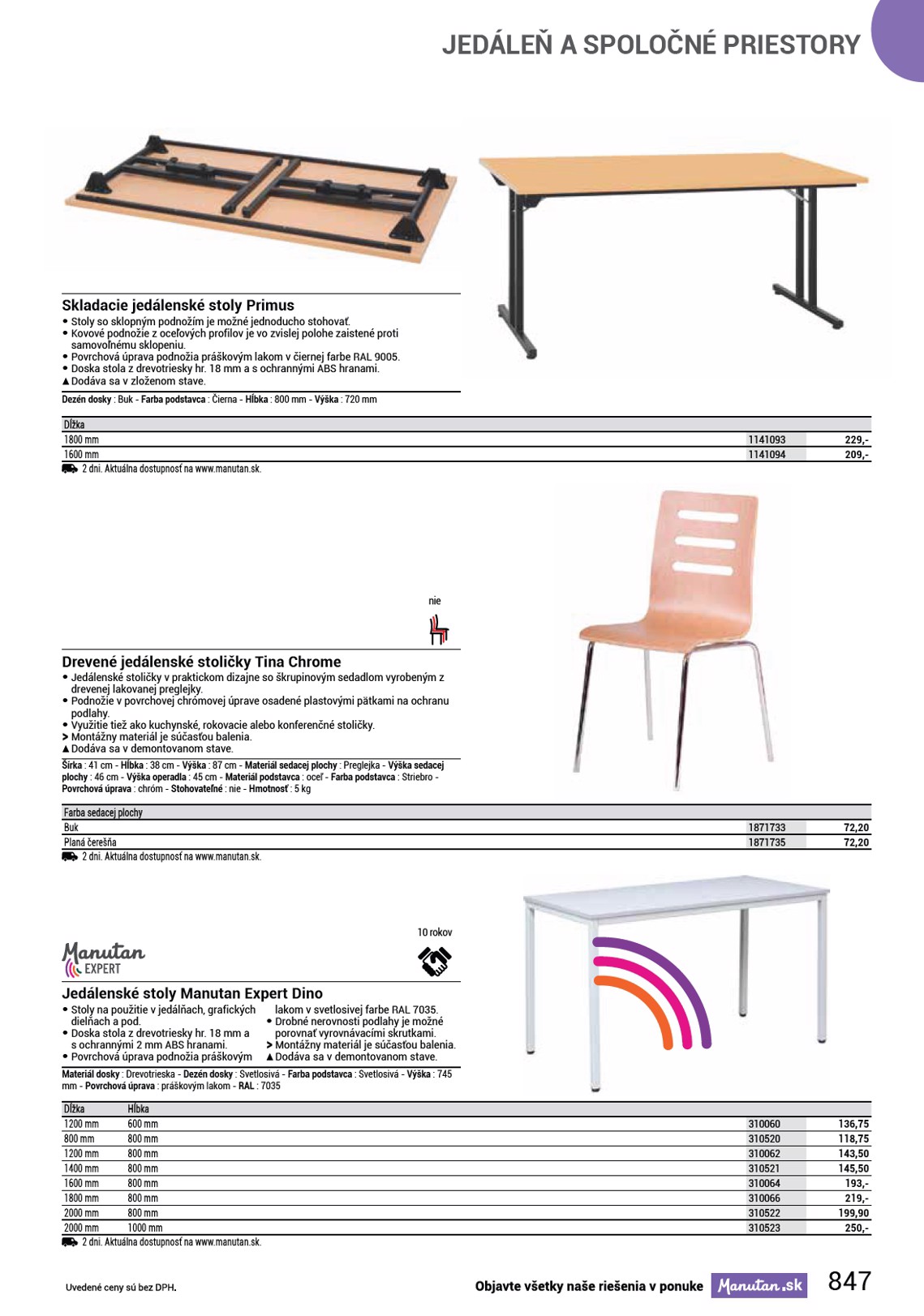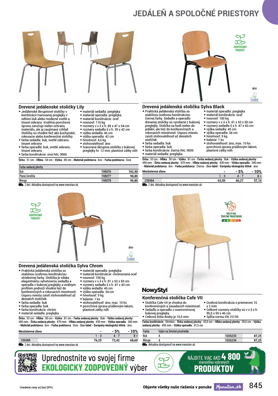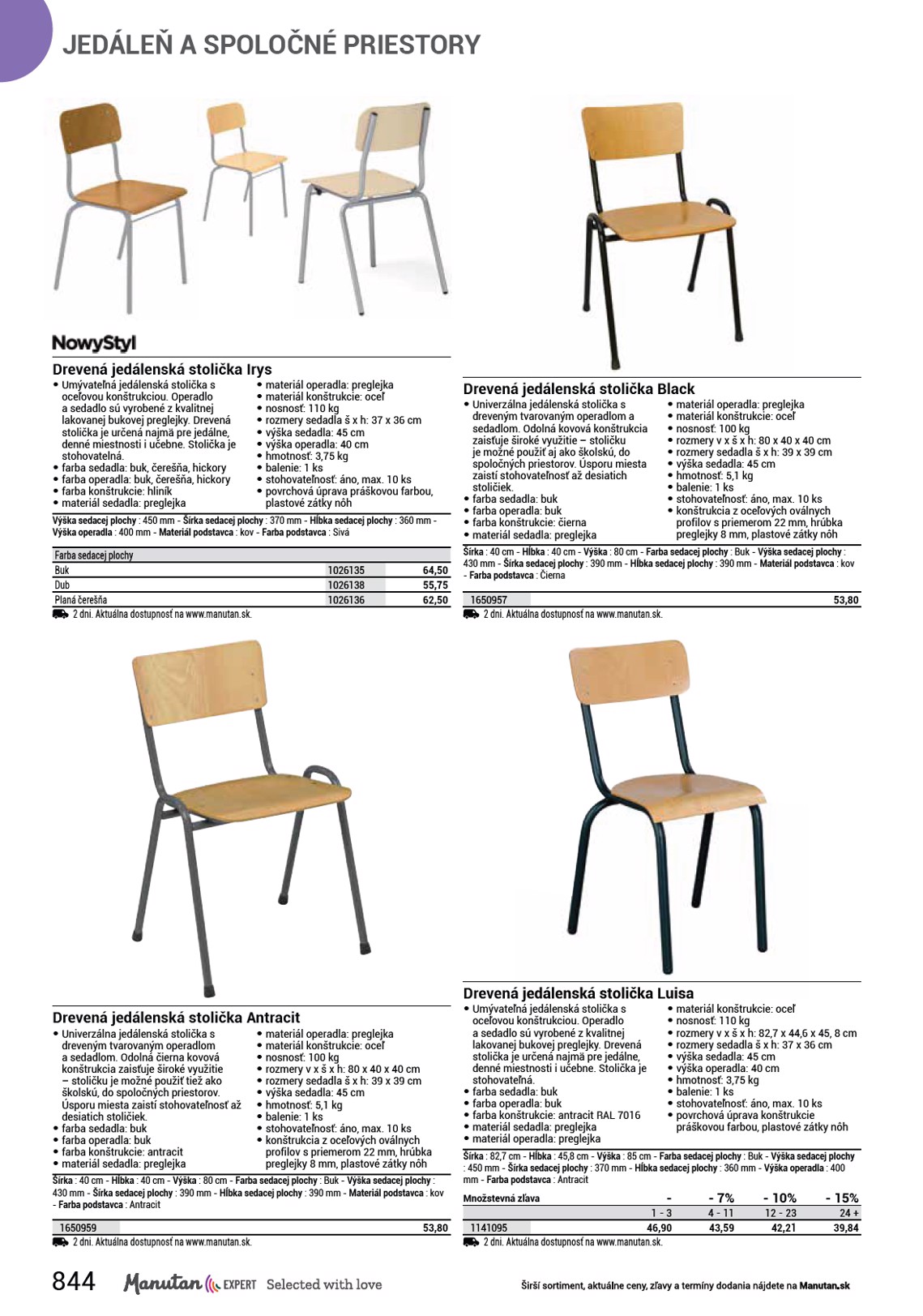 JEDÁLEŇ A SPOLOČNÉ PRIESTORY 10 rokov Plastové jedálenské stoličky • Stohovateľné plastové stoličky sú vďaka svojmu vyhotoveniu ľahko umývateľné, a teda vhodné do jedální a miest, kde sa kladie dôraz na čistotu a hygienu. Kovové vyhotovenie podnože v sivej farbe zaručuje dobrú stabilitu. Stolička disponuje plastovým pružným operadlom. • farba sedadla: antracit, bordová, červená, modrá, zelená • farba operadla: antracit, bordová, červená, modrá, zelená • farba konštrukcie: sivá Pavlina Grey • materiál sedadla: polypropylén • materiál operadla: polypropylén • materiál konštrukcie: oceľ • nosnosť: 100 kg • rozmery v x š x h: 84 x 48 x 46,5 cm • rozmery sedadla š x h: 45 x 390 cm • výška sedadla: 45 cm • výška operadla: 39 cm • balenie: 1 ks • stohovateľnosť: áno • povrchová úprava rámu práškovým lakom, plastové zátky nôh Šírka : 48 cm - Hĺbka : 46,5 cm - Výška : 84 cm - Hĺbka sedacej plochy : 390 mm - Výška sedacej plochy : 450 mm - Šírka sedacej plochy : 400 mm - Farba podstavca : Sivá - Materiál podstavca : kov Množstevná zľava Farba sedacej plochy Antracit Modrá Červená Zelená Bordová 2 dni. Aktuálna dostupnosť na www.manutan.sk. 10 rokov 307001 307002 307003 307004 307010 - 1 - 3 45,60 45,60 45,60 45,60 45,60 - 5% 4 - 7 43,29 43,29 43,29 43,29 43,29 - 10% 8 - 49 41,03 41,03 41,03 41,03 41,03 - 20% 50 + 36,47 36,47 36,47 36,47 36,47 Plastové jedálenské stoličky • Stohovateľné plastové stoličky sú vďaka svojmu vyhotoveniu ľahko umývateľné, a teda vhodné do jedální a miest, kde sa kladie dôraz na čistotu a hygienu. Kovové vyhotovenie podnože vo farbe chrómu zaručuje dobrú stabilitu. Stolička disponuje plastovým pružným operadlom. • farba sedadla: antracit, bordová, červená, modrá, zelená • farba operadla: antracit, bordová, červená, modrá, zelená Pavlina Chrom • farba konštrukcie: chróm • materiál sedadla: polypropylén • materiál operadla: polypropylén • materiál konštrukcie: chrómovaná oceľ • nosnosť: 100 kg • rozmery v x š x h: 84 x 48 x 46,5 cm • rozmery sedadla š x h: 40 x 39 cm • výška sedadla: 45 cm • výška operadla: 39 cm • balenie: 1 ks • stohovateľnosť: áno • plastové zátky nôh Šírka : 48 cm - Hĺbka : 46,5 cm - Výška : 84 cm - Hĺbka sedacej plochy : 390 mm - Výška sedacej plochy : 450 mm - Šírka sedacej plochy : 400 mm - Farba podstavca : Sivá - Materiál podstavca : kov Farba sedacej plochy Antracit Modrá Červená Zelená Bordová 2 dni. Aktuálna dostupnosť na www.manutan.sk. 10 rokov 307005 307006 307007 307008 307009 51,80 51,80 51,80 51,80 51,80 Plastové jedálenské stoličky • Stohovateľné plastové stoličky sú vďaka svojmu vyhotoveniu ľahko umývateľné, a teda vhodné do jedální a miest, kde sa kladie dôraz na čistotu a hygienu. Kovové vyhotovenie podnože v čiernej farbe zaručuje dobrú stabilitu. Stolička disponuje plastovým pružným operadlom. • farba sedadla: antracit, bordová, červená, modrá, zelená • farba operadla: antracit, bordová, červená, modrá, zelená • farba konštrukcie: čierna Pavlina Black • materiál sedadla: polypropylén • materiál operadla: polypropylén • materiál konštrukcie: oceľ • nosnosť: 100 kg • rozmery v x š x h: 84 x 48 x 46,5 cm • rozmery sedadla š x h: 40 x 39 cm • výška sedadla: 45 cm • výška operadla: 39 cm • balenie: 1 ks • stohovateľnosť: áno • povrchová úprava rámu práškovým lakom, plastové zátky nôh Šírka : 48 cm - Hĺbka : 46,5 cm - Výška : 84 cm - Hĺbka sedacej plochy : 390 mm - Výška sedacej plochy : 450 mm - Šírka sedacej plochy : 400 mm - Farba podstavca : Čierna - Materiál podstavca : kov Množstevná zľava Farba sedacej plochy Antracit Modrá Červená Zelená Bordová 2 dni. Aktuálna dostupnosť na www.manutan.sk. 307011 307012 307013 307014 307015 - 1 - 3 45,60 45,60 45,60 45,60 45,60 - 5% 4 - 7 43,29 43,29 43,29 43,29 43,29 - 10% 8 - 49 41,03 41,03 41,03 41,03 41,03 - 20% 50 + 36,47 36,47 36,47 36,47 36,47 849