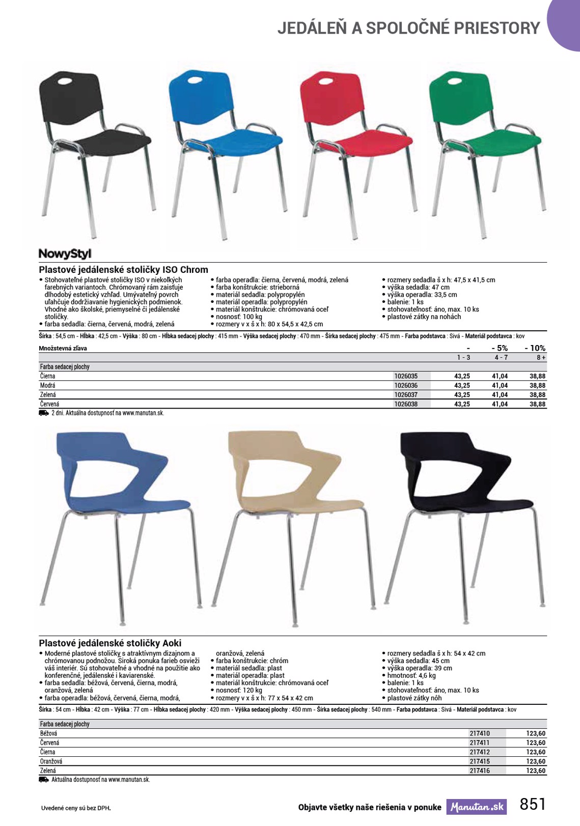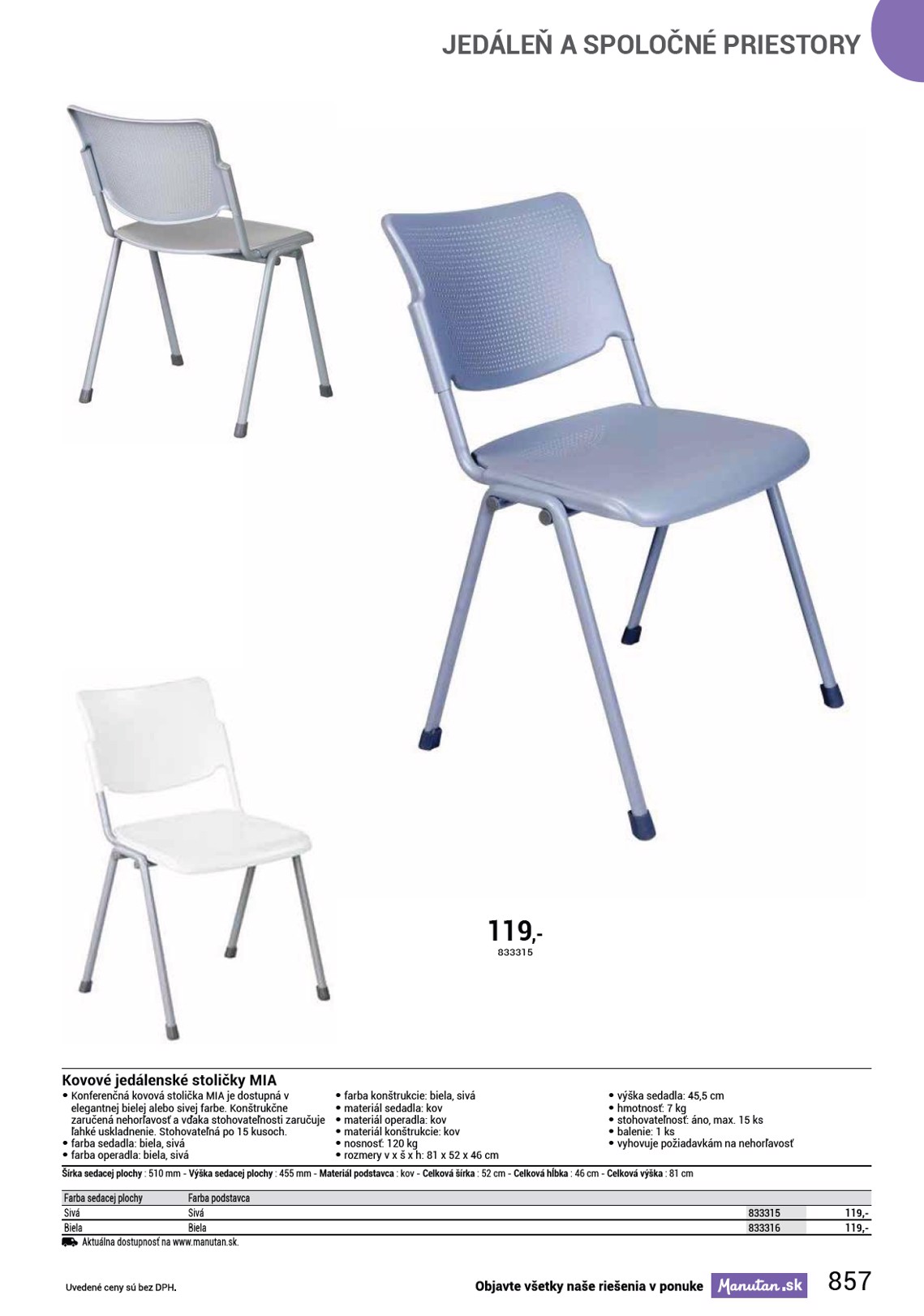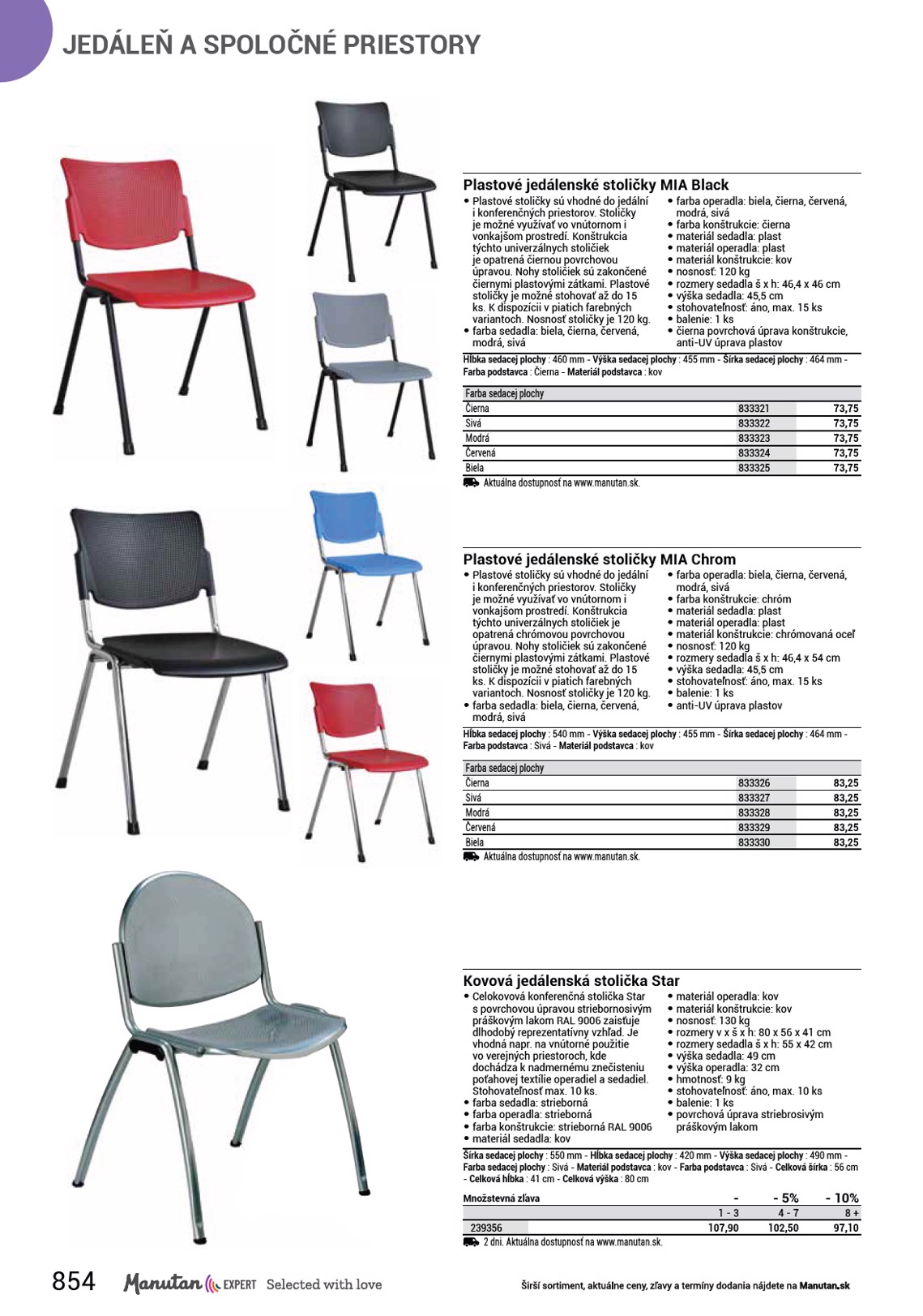 JEDÁLEŇ A SPOLOČNÉ PRIESTORY 854 Plastové jedálenské stoličky • Plastové stoličky sú vhodné do jedální i konferenčných priestorov. Stoličky je možné využívať vo vnútornom i vonkajšom prostredí. Konštrukcia týchto univerzálnych stoličiek je opatrená čiernou povrchovou úpravou. Nohy stoličiek sú zakončené čiernymi plastovými zátkami. Plastové stoličky je možné stohovať až do 15 ks. K dispozícii v piatich farebných variantoch. Nosnosť stoličky je 120 kg. • farba sedadla: biela, čierna, červená, modrá, sivá MIA Black • farba operadla: biela, čierna, červená, modrá, sivá • farba konštrukcie: čierna • materiál sedadla: plast • materiál operadla: plast • materiál konštrukcie: kov • nosnosť: 120 kg • rozmery sedadla š x h: 46,4 x 46 cm • výška sedadla: 45,5 cm • stohovateľnosť: áno, max. 15 ks • balenie: 1 ks • čierna povrchová úprava konštrukcie, anti-UV úprava plastov Hĺbka sedacej plochy : 460 mm - Výška sedacej plochy : 455 mm - Šírka sedacej plochy : 464 mm - Farba podstavca : Čierna - Materiál podstavca : kov Farba sedacej plochy Čierna Sivá Modrá Červená Biela Aktuálna dostupnosť na www.manutan.sk. 833321 833322 833323 833324 833325 73,75 73,75 73,75 73,75 73,75 Plastové jedálenské stoličky • Plastové stoličky sú vhodné do jedální i konferenčných priestorov. Stoličky je možné využívať vo vnútornom i vonkajšom prostredí. Konštrukcia týchto univerzálnych stoličiek je opatrená chrómovou povrchovou úpravou. Nohy stoličiek sú zakončené čiernymi plastovými zátkami. Plastové stoličky je možné stohovať až do 15 ks. K dispozícii v piatich farebných variantoch. Nosnosť stoličky je 120 kg. • farba sedadla: biela, čierna, červená, modrá, sivá MIA Chrom • farba operadla: biela, čierna, červená, modrá, sivá • farba konštrukcie: chróm • materiál sedadla: plast • materiál operadla: plast • materiál konštrukcie: chrómovaná oceľ • nosnosť: 120 kg • rozmery sedadla š x h: 46,4 x 54 cm • výška sedadla: 45,5 cm • stohovateľnosť: áno, max. 15 ks • balenie: 1 ks • anti-UV úprava plastov Hĺbka sedacej plochy : 540 mm - Výška sedacej plochy : 455 mm - Šírka sedacej plochy : 464 mm - Farba podstavca : Sivá - Materiál podstavca : kov Farba sedacej plochy Čierna Sivá Modrá Červená Biela Aktuálna dostupnosť na www.manutan.sk. 833326 833327 833328 833329 833330 83,25 83,25 83,25 83,25 83,25 Kovová jedálenská stolička Star • Celokovová konferenčná stolička Star • materiál operadla: kov s povrchovou úpravou striebornosivým • materiál konštrukcie: kov práškovým lakom RAL 9006 zaisťuje • nosnosť: 130 kg dlhodobý reprezentatívny vzhľad. Je • rozmery v x š x h: 80 x 56 x 41 cm vhodná napr. na vnútorné použitie • rozmery sedadla š x h: 55 x 42 cm vo verejných priestoroch, kde • výška sedadla: 49 cm dochádza k nadmernému znečisteniu • výška operadla: 32 cm poťahovej textílie operadiel a sedadiel. • hmotnosť: 9 kg Stohovateľnosť max. 10 ks. • stohovateľnosť: áno, max. 10 ks • farba sedadla: strieborná • balenie: 1 ks • farba operadla: strieborná • povrchová úprava striebrosivým • farba konštrukcie: strieborná RAL 9006 práškovým lakom • materiál sedadla: kov Šírka sedacej plochy : 550 mm - Hĺbka sedacej plochy : 420 mm - Výška sedacej plochy : 490 mm - Farba sedacej plochy : Sivá - Materiál podstavca : kov - Farba podstavca : Sivá - Celková šírka : 56 cm - Celková hĺbka : 41 cm - Celková výška : 80 cm Množstevná zľava 239356 2 dni. Aktuálna dostupnosť na www.manutan.sk. - 1 - 3 107,90 - 5% 4 - 7 102,50 - 10% 8 + 97,10