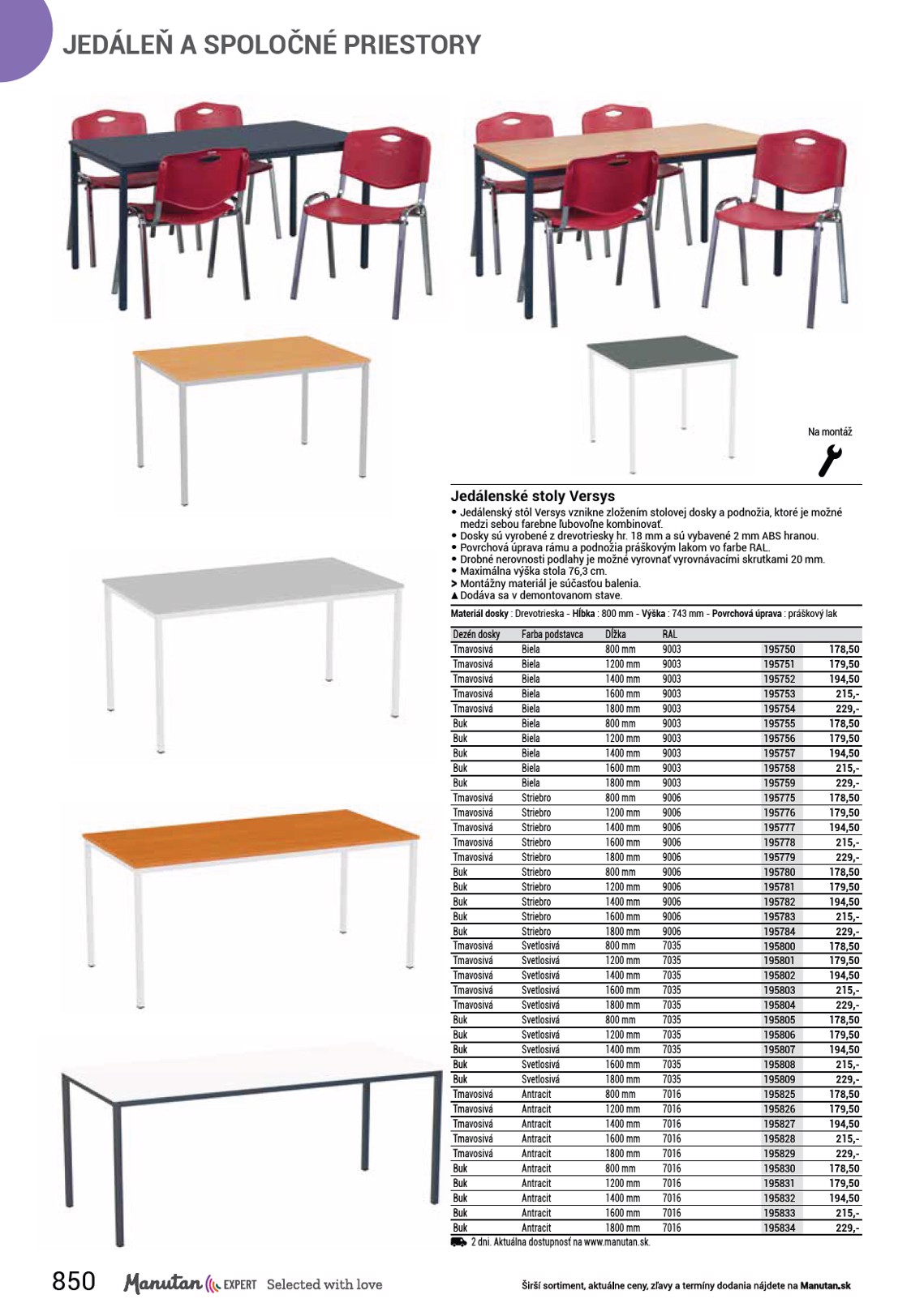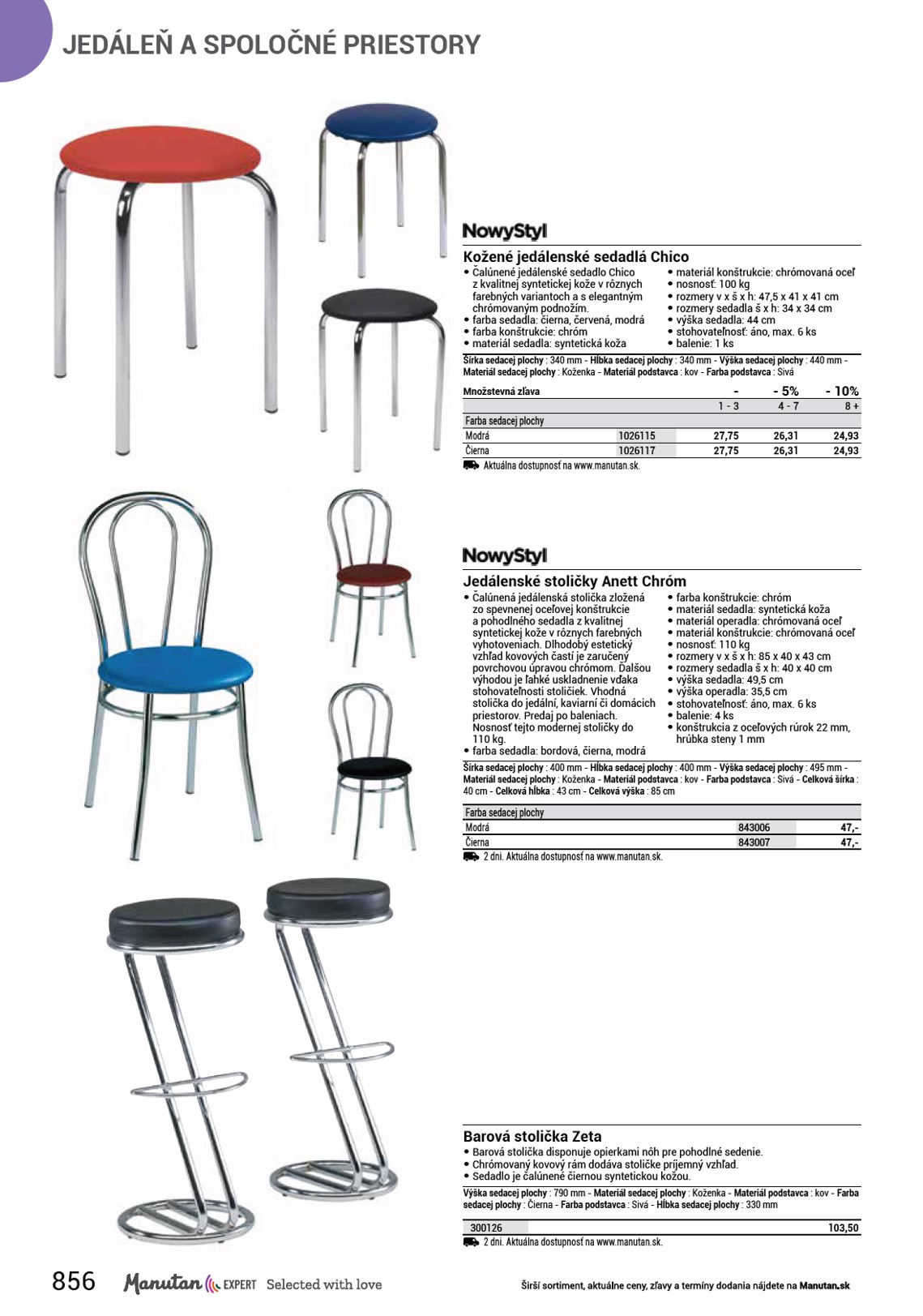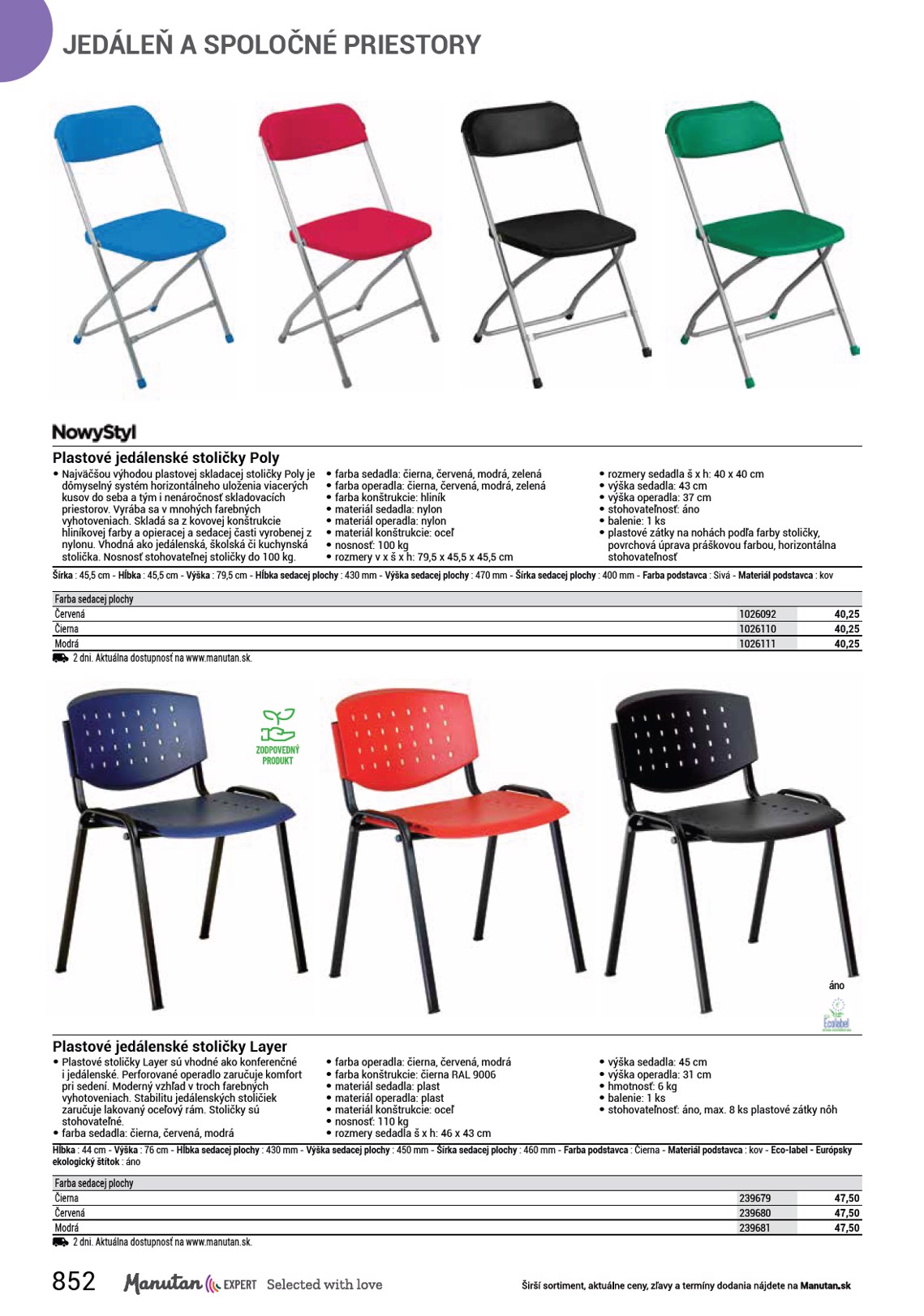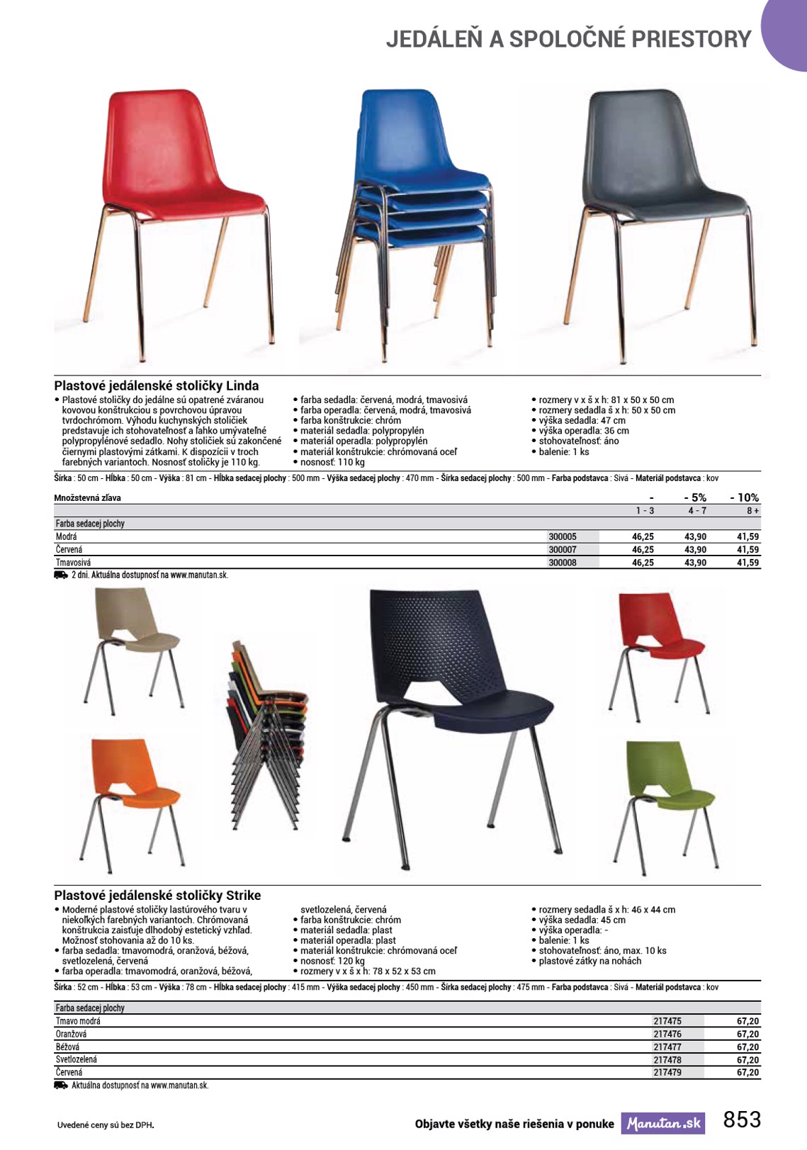 JEDÁLEŇ A SPOLOČNÉ PRIESTORY 854 Plastové jedálenské stoličky • Plastové stoličky sú vhodné do jedální i konferenčných priestorov. Stoličky je možné využívať vo vnútornom i vonkajšom prostredí. Konštrukcia týchto univerzálnych stoličiek je opatrená čiernou povrchovou úpravou. Nohy stoličiek sú zakončené čiernymi plastovými zátkami. Plastové stoličky je možné stohovať až do 15 ks. K dispozícii v piatich farebných variantoch. Nosnosť stoličky je 120 kg. • farba sedadla: biela, čierna, červená, modrá, sivá MIA Black • farba operadla: biela, čierna, červená, modrá, sivá • farba konštrukcie: čierna • materiál sedadla: plast • materiál operadla: plast • materiál konštrukcie: kov • nosnosť: 120 kg • rozmery sedadla š x h: 46,4 x 46 cm • výška sedadla: 45,5 cm • stohovateľnosť: áno, max. 15 ks • balenie: 1 ks • čierna povrchová úprava konštrukcie, anti-UV úprava plastov Hĺbka sedacej plochy : 460 mm - Výška sedacej plochy : 455 mm - Šírka sedacej plochy : 464 mm - Farba podstavca : Čierna - Materiál podstavca : kov Farba sedacej plochy Čierna Sivá Modrá Červená Biela Aktuálna dostupnosť na www.manutan.sk. 833321 833322 833323 833324 833325 73,75 73,75 73,75 73,75 73,75 Plastové jedálenské stoličky • Plastové stoličky sú vhodné do jedální i konferenčných priestorov. Stoličky je možné využívať vo vnútornom i vonkajšom prostredí. Konštrukcia týchto univerzálnych stoličiek je opatrená chrómovou povrchovou úpravou. Nohy stoličiek sú zakončené čiernymi plastovými zátkami. Plastové stoličky je možné stohovať až do 15 ks. K dispozícii v piatich farebných variantoch. Nosnosť stoličky je 120 kg. • farba sedadla: biela, čierna, červená, modrá, sivá MIA Chrom • farba operadla: biela, čierna, červená, modrá, sivá • farba konštrukcie: chróm • materiál sedadla: plast • materiál operadla: plast • materiál konštrukcie: chrómovaná oceľ • nosnosť: 120 kg • rozmery sedadla š x h: 46,4 x 54 cm • výška sedadla: 45,5 cm • stohovateľnosť: áno, max. 15 ks • balenie: 1 ks • anti-UV úprava plastov Hĺbka sedacej plochy : 540 mm - Výška sedacej plochy : 455 mm - Šírka sedacej plochy : 464 mm - Farba podstavca : Sivá - Materiál podstavca : kov Farba sedacej plochy Čierna Sivá Modrá Červená Biela Aktuálna dostupnosť na www.manutan.sk. 833326 833327 833328 833329 833330 83,25 83,25 83,25 83,25 83,25 Kovová jedálenská stolička Star • Celokovová konferenčná stolička Star • materiál operadla: kov s povrchovou úpravou striebornosivým • materiál konštrukcie: kov práškovým lakom RAL 9006 zaisťuje • nosnosť: 130 kg dlhodobý reprezentatívny vzhľad. Je • rozmery v x š x h: 80 x 56 x 41 cm vhodná napr. na vnútorné použitie • rozmery sedadla š x h: 55 x 42 cm vo verejných priestoroch, kde • výška sedadla: 49 cm dochádza k nadmernému znečisteniu • výška operadla: 32 cm poťahovej textílie operadiel a sedadiel. • hmotnosť: 9 kg Stohovateľnosť max. 10 ks. • stohovateľnosť: áno, max. 10 ks • farba sedadla: strieborná • balenie: 1 ks • farba operadla: strieborná • povrchová úprava striebrosivým • farba konštrukcie: strieborná RAL 9006 práškovým lakom • materiál sedadla: kov Šírka sedacej plochy : 550 mm - Hĺbka sedacej plochy : 420 mm - Výška sedacej plochy : 490 mm - Farba sedacej plochy : Sivá - Materiál podstavca : kov - Farba podstavca : Sivá - Celková šírka : 56 cm - Celková hĺbka : 41 cm - Celková výška : 80 cm Množstevná zľava 239356 2 dni. Aktuálna dostupnosť na www.manutan.sk. - 1 - 3 107,90 - 5% 4 - 7 102,50 - 10% 8 + 97,10