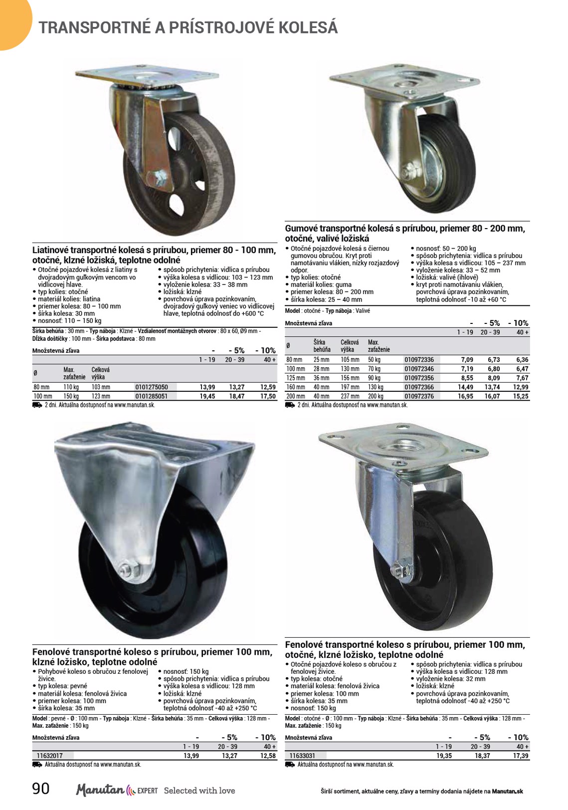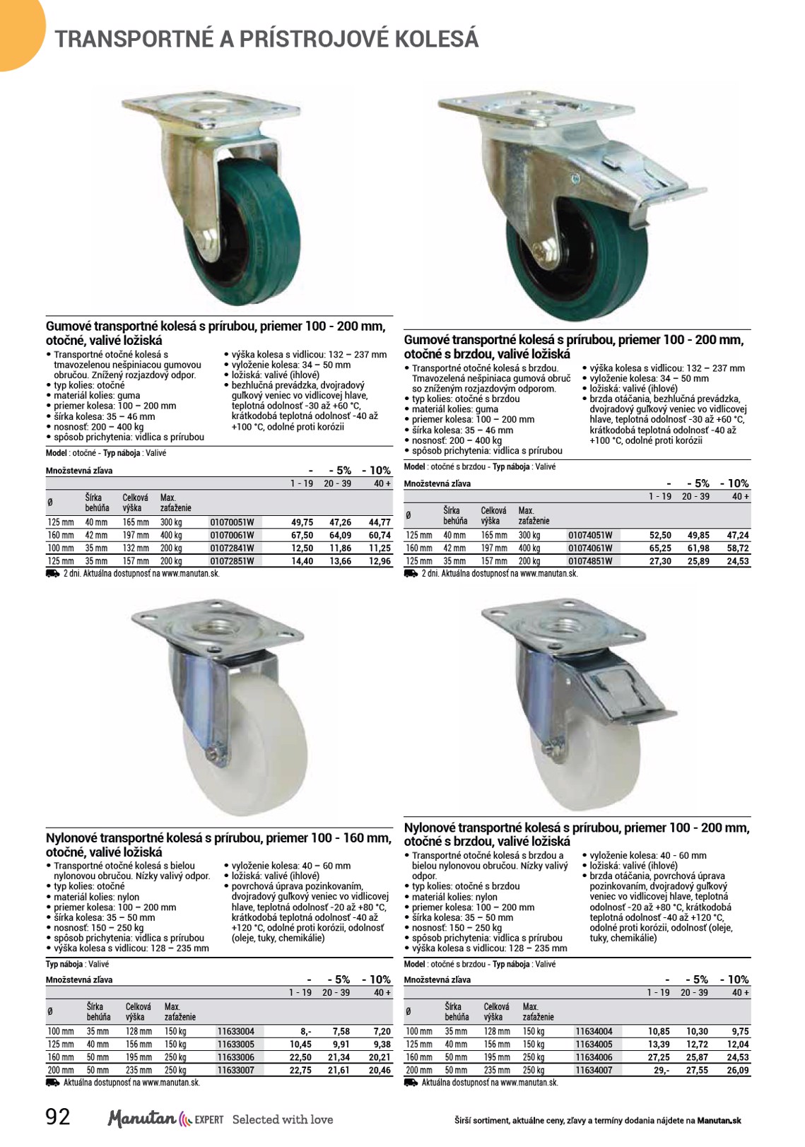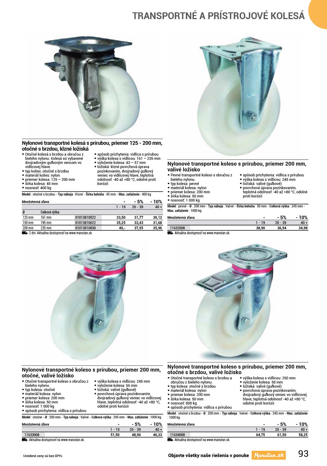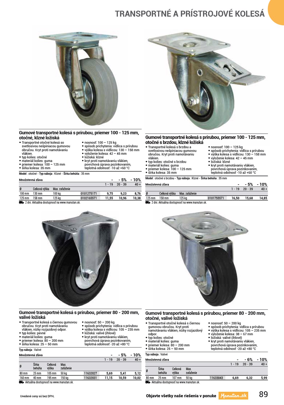 TRANSPORTNÉ A PRÍSTROJOVÉ KOLESÁ Liatinové transportné kolesá s prírubou, priemer 80 - 100 mm, otočné, klzné ložiská, teplotne odolné • Otočné pojazdové kolesá z liatiny s • spôsob prichytenia: vidlica s prírubou dvojradovým guľkovým vencom vo • výška kolesa s vidlicou: 103 – 123 mm vidlicovej hlave. • vyloženie kolesa: 33 – 38 mm • typ kolies: otočné • ložiská: klzné • materiál kolies: liatina • povrchová úprava pozinkovaním, • priemer kolesa: 80 – 100 mm dvojradový guľkový veniec vo vidlicovej • šírka kolesa: 30 mm hlave, teplotná odolnosť do +600 °C • nosnosť: 110 – 150 kg Šírka behúňa : 30 mm - Typ náboja : Klzné - Vzdialenosť montážnych otvorov : 80 x 60, Ø9 mm - Dĺžka doštičky : 100 mm - Šírka podstavca : 80 mm Množstevná zľava Ø Max. Celková zaťaženie výška 80 mm 110 kg 103 mm 0101275050 100 mm 150 kg 123 mm 0101285051 2 dni. Aktuálna dostupnosť na www.manutan.sk. - 1 - 19 - 5% 20 - 39 - 10% 40 + 13,99 19,45 13,27 18,47 12,59 17,50 Gumové transportné kolesá s otočné, valivé ložiská • Otočné pojazdové kolesá s čiernou gumovou obručou. Kryt proti namotávaniu vlákien, nízky rozjazdový odpor. • typ kolies: otočné • materiál kolies: guma • priemer kolesa: 80 – 200 mm • šírka kolesa: 25 – 40 mm prírubou, priemer 80 - 200 mm, • nosnosť: 50 – 200 kg • spôsob prichytenia: vidlica s prírubou • výška kolesa s vidlicou: 105 – 237 mm • vyloženie kolesa: 33 – 52 mm • ložiská: valivé (ihlové) • kryt proti namotávaniu vlákien, povrchová úprava pozinkovaním, teplotná odolnosť -10 až +60 °C Model : otočné - Typ náboja : Valivé Množstevná zľava Ø Šírka Celková Max. behúňa výška zaťaženie 80 mm 25 mm 105 mm 50 kg 010972336 100 mm 28 mm 130 mm 70 kg 010972346 125 mm 36 mm 156 mm 90 kg 010972356 160 mm 40 mm 197 mm 130 kg 010972366 200 mm 40 mm 237 mm 200 kg 010972376 2 dni. Aktuálna dostupnosť na www.manutan.sk. - - 5% - 10% 1 - 19 20 - 39 40 + 7,09 7,19 8,55 14,49 16,95 6,73 6,80 8,09 13,74 16,07 6,36 6,47 7,67 12,99 15,25 Fenolové transportné koleso s prírubou, priemer 100 mm, klzné ložisko, teplotne odolné • Pohybové koleso s obručou z fenolovej • nosnosť: 150 kg živice. • spôsob prichytenia: vidlica s prírubou • typ kolesa: pevné • výška kolesa s vidlicou: 128 mm • materiál kolesa: fenolová živica • ložiská: klzné • priemer kolesa: 100 mm • povrchová úprava pozinkovaním, • šírka kolesa: 35 mm teplotná odolnosť -40 až +250 °C Model : pevné - Ø : 100 mm - Typ náboja : Klzné - Šírka behúňa : 35 mm - Celková výška : 128 mm - Max. zaťaženie : 150 kg Množstevná zľava 11632017 Aktuálna dostupnosť na www.manutan.sk. - 1 - 19 13,99 - 5% 20 - 39 13,27 - 10% 40 + 12,58 Fenolové transportné koleso s prírubou, priemer 100 mm, otočné, klzné ložisko, teplotne odolné • Otočné pojazdové koleso s obručou z • spôsob prichytenia: vidlica s prírubou fenolovej živice. • výška kolesa s vidlicou: 128 mm • typ kolesa: otočné • vyloženie kolesa: 32 mm • materiál kolesa: fenolová živica • ložiská: klzné • priemer kolesa: 100 mm • povrchová úprava pozinkovaním, • šírka kolesa: 35 mm teplotná odolnosť -40 až +250 °C • nosnosť: 150 kg Model : otočné - Ø : 100 mm - Typ náboja : Klzné - Šírka behúňa : 35 mm - Celková výška : 128 mm - Max. zaťaženie : 150 kg Množstevná zľava 11633031 Aktuálna dostupnosť na www.manutan.sk. - 1 - 19 19,35 - 5% 20 - 39 18,37 - 10% 40 + 17,39 90