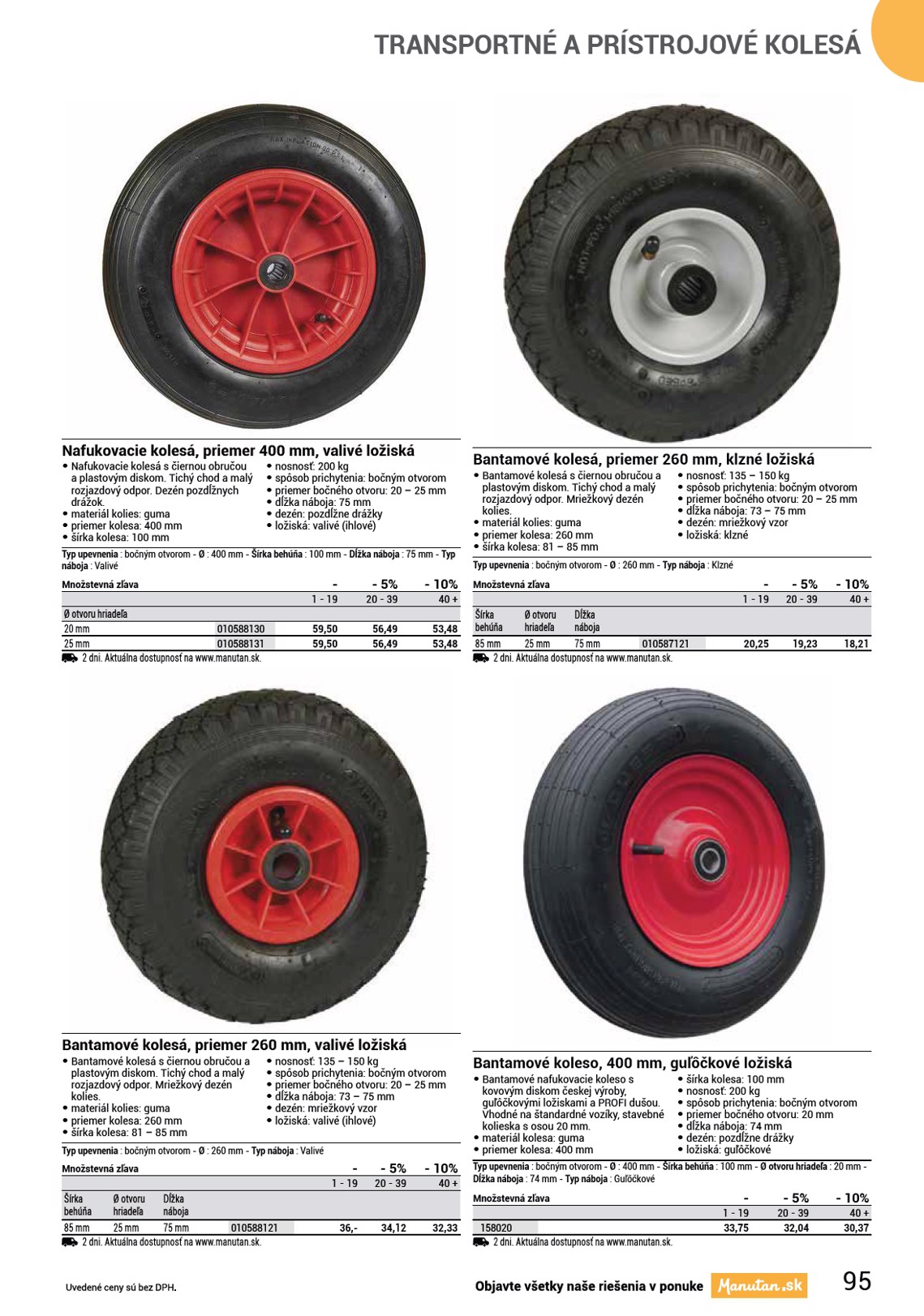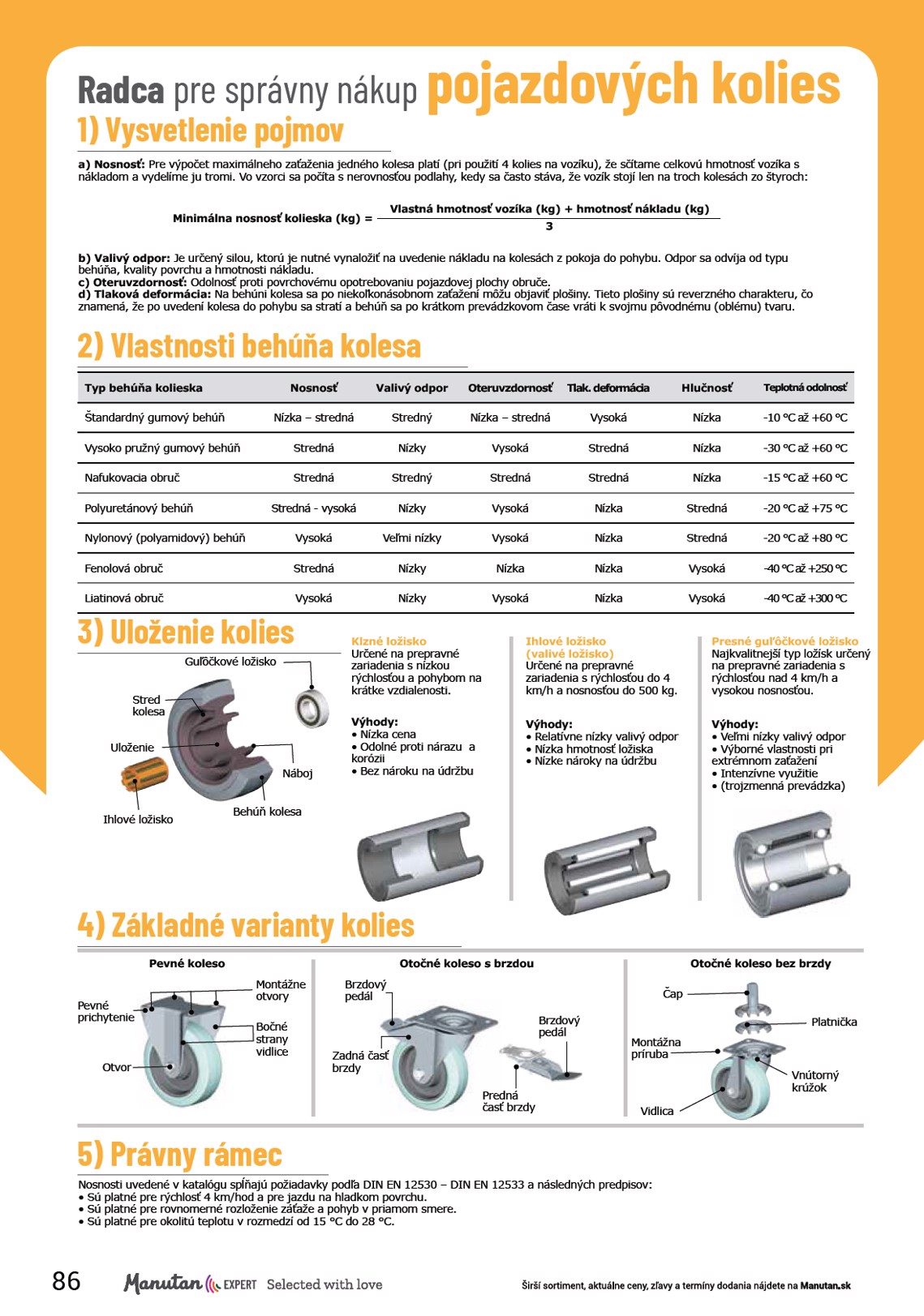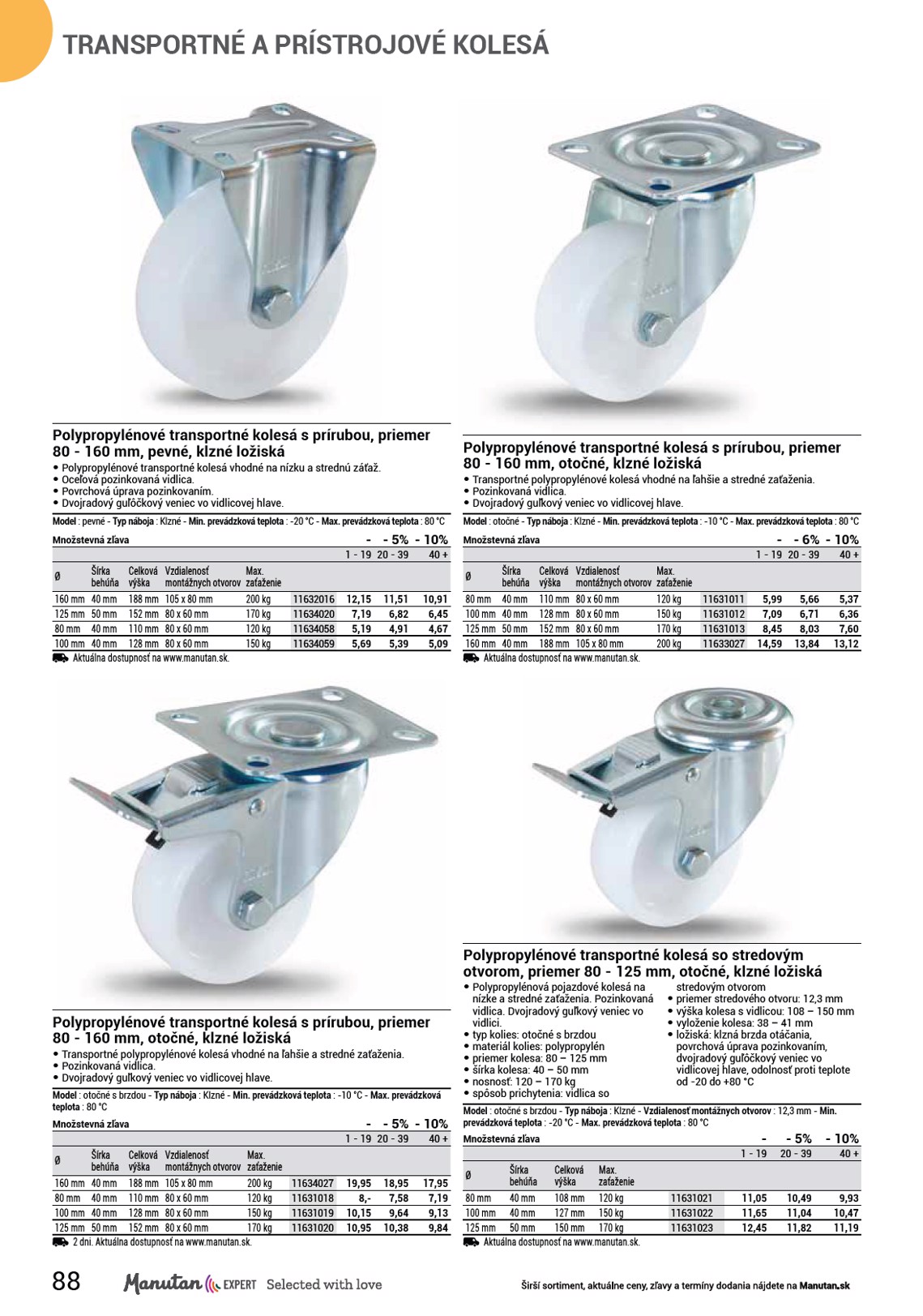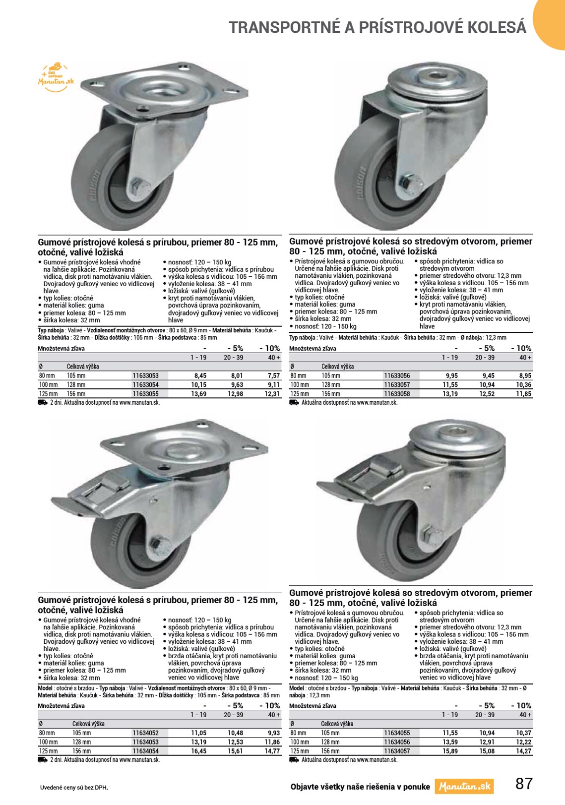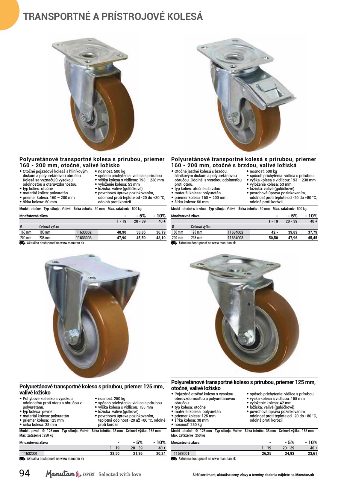 TRANSPORTNÉ A PRÍSTROJOVÉ KOLESÁ Liatinové transportné kolesá s prírubou, priemer 80 - 100 mm, otočné, klzné ložiská, teplotne odolné • Otočné pojazdové kolesá z liatiny s • spôsob prichytenia: vidlica s prírubou dvojradovým guľkovým vencom vo • výška kolesa s vidlicou: 103 – 123 mm vidlicovej hlave. • vyloženie kolesa: 33 – 38 mm • typ kolies: otočné • ložiská: klzné • materiál kolies: liatina • povrchová úprava pozinkovaním, • priemer kolesa: 80 – 100 mm dvojradový guľkový veniec vo vidlicovej • šírka kolesa: 30 mm hlave, teplotná odolnosť do +600 °C • nosnosť: 110 – 150 kg Šírka behúňa : 30 mm - Typ náboja : Klzné - Vzdialenosť montážnych otvorov : 80 x 60, Ø9 mm - Dĺžka doštičky : 100 mm - Šírka podstavca : 80 mm Množstevná zľava Ø Max. Celková zaťaženie výška 80 mm 110 kg 103 mm 0101275050 100 mm 150 kg 123 mm 0101285051 2 dni. Aktuálna dostupnosť na www.manutan.sk. - 1 - 19 - 5% 20 - 39 - 10% 40 + 13,99 19,45 13,27 18,47 12,59 17,50 Gumové transportné kolesá s otočné, valivé ložiská • Otočné pojazdové kolesá s čiernou gumovou obručou. Kryt proti namotávaniu vlákien, nízky rozjazdový odpor. • typ kolies: otočné • materiál kolies: guma • priemer kolesa: 80 – 200 mm • šírka kolesa: 25 – 40 mm prírubou, priemer 80 - 200 mm, • nosnosť: 50 – 200 kg • spôsob prichytenia: vidlica s prírubou • výška kolesa s vidlicou: 105 – 237 mm • vyloženie kolesa: 33 – 52 mm • ložiská: valivé (ihlové) • kryt proti namotávaniu vlákien, povrchová úprava pozinkovaním, teplotná odolnosť -10 až +60 °C Model : otočné - Typ náboja : Valivé Množstevná zľava Ø Šírka Celková Max. behúňa výška zaťaženie 80 mm 25 mm 105 mm 50 kg 010972336 100 mm 28 mm 130 mm 70 kg 010972346 125 mm 36 mm 156 mm 90 kg 010972356 160 mm 40 mm 197 mm 130 kg 010972366 200 mm 40 mm 237 mm 200 kg 010972376 2 dni. Aktuálna dostupnosť na www.manutan.sk. - - 5% - 10% 1 - 19 20 - 39 40 + 7,09 7,19 8,55 14,49 16,95 6,73 6,80 8,09 13,74 16,07 6,36 6,47 7,67 12,99 15,25 Fenolové transportné koleso s prírubou, priemer 100 mm, klzné ložisko, teplotne odolné • Pohybové koleso s obručou z fenolovej • nosnosť: 150 kg živice. • spôsob prichytenia: vidlica s prírubou • typ kolesa: pevné • výška kolesa s vidlicou: 128 mm • materiál kolesa: fenolová živica • ložiská: klzné • priemer kolesa: 100 mm • povrchová úprava pozinkovaním, • šírka kolesa: 35 mm teplotná odolnosť -40 až +250 °C Model : pevné - Ø : 100 mm - Typ náboja : Klzné - Šírka behúňa : 35 mm - Celková výška : 128 mm - Max. zaťaženie : 150 kg Množstevná zľava 11632017 Aktuálna dostupnosť na www.manutan.sk. - 1 - 19 13,99 - 5% 20 - 39 13,27 - 10% 40 + 12,58 Fenolové transportné koleso s prírubou, priemer 100 mm, otočné, klzné ložisko, teplotne odolné • Otočné pojazdové koleso s obručou z • spôsob prichytenia: vidlica s prírubou fenolovej živice. • výška kolesa s vidlicou: 128 mm • typ kolesa: otočné • vyloženie kolesa: 32 mm • materiál kolesa: fenolová živica • ložiská: klzné • priemer kolesa: 100 mm • povrchová úprava pozinkovaním, • šírka kolesa: 35 mm teplotná odolnosť -40 až +250 °C • nosnosť: 150 kg Model : otočné - Ø : 100 mm - Typ náboja : Klzné - Šírka behúňa : 35 mm - Celková výška : 128 mm - Max. zaťaženie : 150 kg Množstevná zľava 11633031 Aktuálna dostupnosť na www.manutan.sk. - 1 - 19 19,35 - 5% 20 - 39 18,37 - 10% 40 + 17,39 90