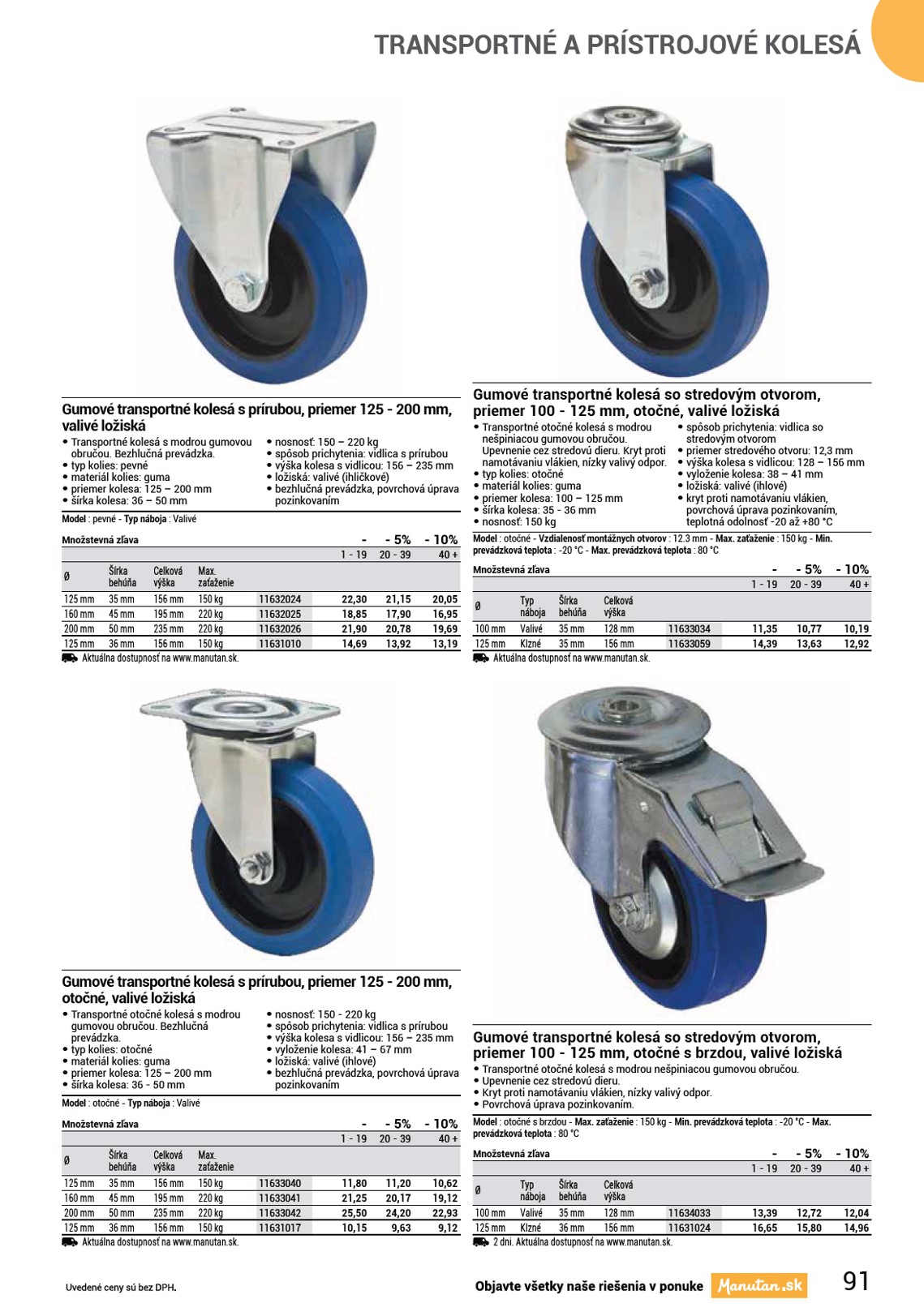 TRANSPORTNÉ A PRÍSTROJOVÉ KOLESÁ Gumové transportné kolesá s prírubou, priemer 125 - 200 mm, valivé ložiská • Transportné kolesá s modrou gumovou • nosnosť: 150 – 220 kg obručou. Bezhlučná prevádzka. • spôsob prichytenia: vidlica s prírubou • typ kolies: pevné • výška kolesa s vidlicou: 156 – 235 mm • materiál kolies: guma • ložiská: valivé (ihličkové) • priemer kolesa: 125 – 200 mm • bezhlučná prevádzka, povrchová úprava • šírka kolesa: 36 – 50 mm pozinkovaním Model : pevné - Typ náboja : Valivé Množstevná zľava Ø Šírka Celková Max. behúňa výška zaťaženie 125 mm 35 mm 156 mm 150 kg 160 mm 45 mm 195 mm 220 kg 200 mm 50 mm 235 mm 220 kg 125 mm 36 mm 156 mm 150 kg Aktuálna dostupnosť na www.manutan.sk. 11632024 11632025 11632026 11631010 - - 5% - 10% 1 - 19 20 - 39 40 + 22,30 18,85 21,90 14,69 21,15 17,90 20,78 13,92 20,05 16,95 19,69 13,19 Gumové transportné kolesá so stredovým otvorom, priemer 100 - 125 mm, otočné, valivé ložiská • Transportné otočné kolesá s modrou • spôsob prichytenia: vidlica so nešpiniacou gumovou obručou. stredovým otvorom Upevnenie cez stredovú dieru. Kryt proti • priemer stredového otvoru: 12,3 mm namotávaniu vlákien, nízky valivý odpor. • výška kolesa s vidlicou: 128 – 156 mm • typ kolies: otočné • vyloženie kolesa: 38 – 41 mm • materiál kolies: guma • ložiská: valivé (ihlové) • priemer kolesa: 100 – 125 mm • kryt proti namotávaniu vlákien, • šírka kolesa: 35 - 36 mm povrchová úprava pozinkovaním, • nosnosť: 150 kg teplotná odolnosť -20 až +80 °C Model : otočné - Vzdialenosť montážnych otvorov : 12.3 mm - Max. zaťaženie : 150 kg - Min. prevádzková teplota : -20 °C - Max. prevádzková teplota : 80 °C Množstevná zľava - - 5% - 10% 1 - 19 20 - 39 40 + Ø Typ Šírka Celková náboja behúňa výška 100 mm Valivé 35 mm 128 mm 125 mm Klzné 35 mm 156 mm Aktuálna dostupnosť na www.manutan.sk. 11633034 11633059 11,35 14,39 10,77 13,63 10,19 12,92 Gumové transportné kolesá s prírubou, priemer 125 - 200 mm, otočné, valivé ložiská • Transportné otočné kolesá s modrou • nosnosť: 150 - 220 kg gumovou obručou. Bezhlučná • spôsob prichytenia: vidlica s prírubou prevádzka. • výška kolesa s vidlicou: 156 – 235 mm • typ kolies: otočné • vyloženie kolesa: 41 – 67 mm • materiál kolies: guma • ložiská: valivé (ihlové) • priemer kolesa: 125 – 200 mm • bezhlučná prevádzka, povrchová úprava • šírka kolesa: 36 - 50 mm pozinkovaním Model : otočné - Typ náboja : Valivé Množstevná zľava Ø Šírka Celková Max. behúňa výška zaťaženie 125 mm 35 mm 156 mm 150 kg 160 mm 45 mm 195 mm 220 kg 200 mm 50 mm 235 mm 220 kg 125 mm 36 mm 156 mm 150 kg Aktuálna dostupnosť na www.manutan.sk. 11633040 11633041 11633042 11631017 - - 5% - 10% 1 - 19 20 - 39 40 + 11,80 21,25 25,50 10,15 11,20 20,17 24,20 9,63 10,62 19,12 22,93 9,12 Gumové transportné kolesá so stredovým otvorom, priemer 100 - 125 mm, otočné s brzdou, valivé ložiská • Transportné otočné kolesá s modrou nešpiniacou gumovou obručou. • Upevnenie cez stredovú dieru. • Kryt proti namotávaniu vlákien, nízky valivý odpor. • Povrchová úprava pozinkovaním. Model : otočné s brzdou - Max. zaťaženie : 150 kg - Min. prevádzková teplota : -20 °C - Max. prevádzková teplota : 80 °C Množstevná zľava Ø Typ Šírka Celková náboja behúňa výška 100 mm Valivé 35 mm 128 mm 11634033 125 mm Klzné 36 mm 156 mm 11631024 2 dni. Aktuálna dostupnosť na www.manutan.sk. - - 5% - 10% 1 - 19 20 - 39 40 + 13,39 16,65 12,72 15,80 12,04 14,96 91