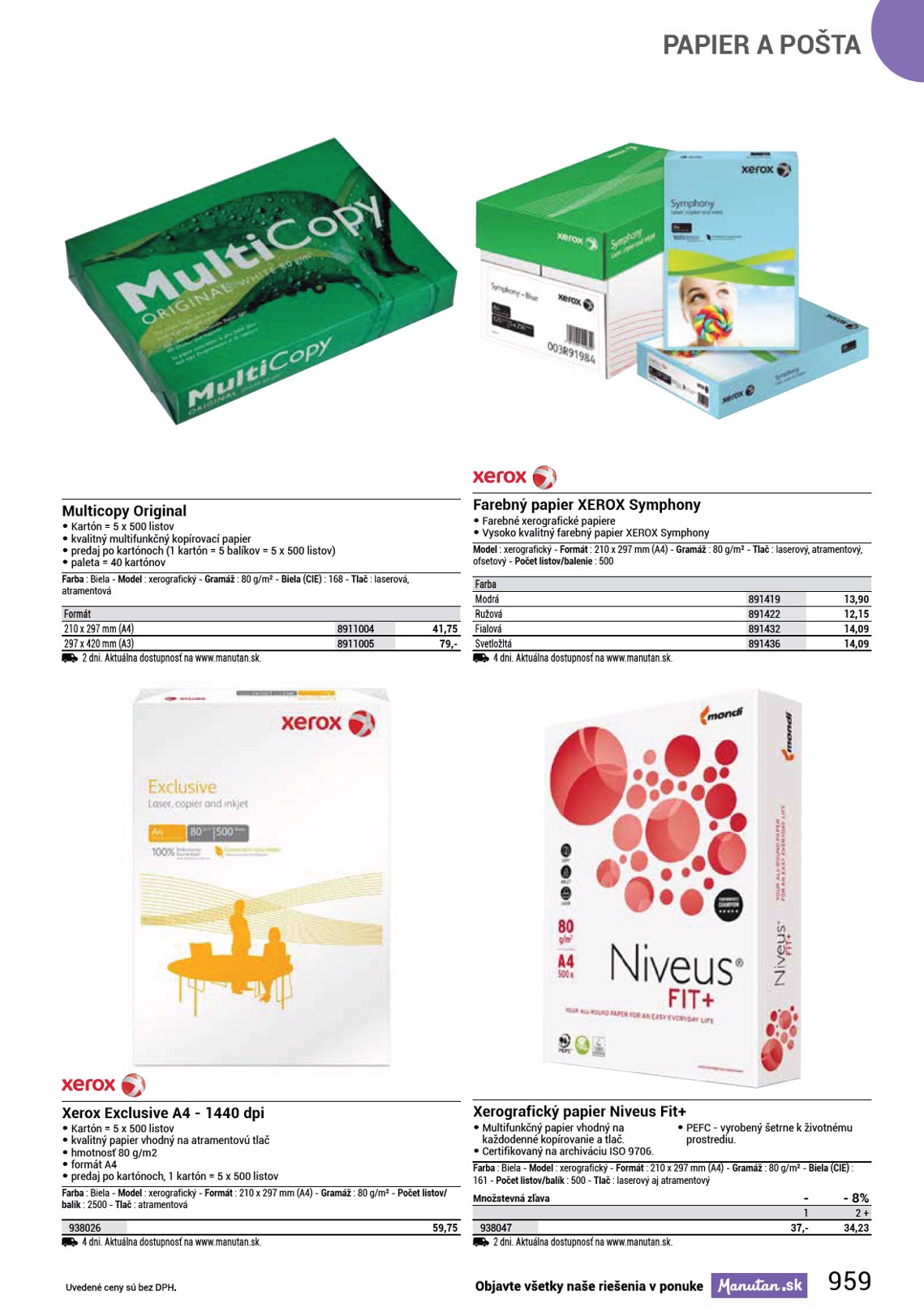 PÍSACIE POTREBY Korekčné strojčeky Pritt Roller, 10 ks • Pritt Roller korektory s vymeniteľnou náplňou vhodné na časté používanie. • Použiteľné na väčšinu druhov papiera vrátane faxovacieho. • Nezanechávajú značky ani tiene na fotokópiách. • Ľahká výmena náplne. SS Náhradné náplne nie sú súčasťou balenia. Dĺžka pásu : 12 m - Typ : Korekčný strojček Šírka pásu 4,2 mm 6 mm 4 dni. Aktuálna dostupnosť na www.manutan.sk. 8911644 8911645 70,90 70,90 Náhradné kazety ku korekčným strojčekom Pritt Roller, 5 ks • Vymeniteľné náplne Pritt Roller pre korekčné strojčeky. • Použiteľné na väčšinu druhov papiera vrátane faxovacieho. • Nezanechávajú značky ani tiene na fotokópiách. • Ľahká výmena náplne. Dĺžka pásu : 12 m - Typ : Náhradná kazeta Šírka pásu 4,2 mm 6 mm 4 dni. Aktuálna dostupnosť na www.manutan.sk. 8911646 8911647 24,90 24,90 Mikroceruzky Pentel AX105 Fiesta, 10 ks • Mikroceruzka - balenie 10 ks • veľká guma s viečkom • plastová mikroceruzka • predaj po balení 10 ks z jednej farby • ergonomické protišmykové držanie Ø špičky : 0,7 mm Farba tela Čierna 8911872 16,30 Mikroceruzka Manutan Expert • Ľahká pentelka s hrotom s priemerom 0,7 mm a s gumou na rýchle úpravy. Ø špičky : 0,7 mm - Vrátane gumy : áno Modrá 8911873 16,30 1501463 4,89 4 dni. Aktuálna dostupnosť na www.manutan.sk. 2 dni. Aktuálna dostupnosť na www.manutan.sk. Bezprašná guma • Guma - balenie 24 ks • pri použití vzniká len jediný šúľanec, čím možno zachovať poriadok na pracovnom stole • rozmery 17 x 44 x 12 mm • predaj po balení 24 ks 095080 Aktuálna dostupnosť na www.manutan.sk. 63,36 Korekčný strojček • jednorazový korekčný strojček • ergonomický tvar puzdra na jednoduché opravovanie • vhodný na všetky druhy korektúr • šírka pásky 5 mm, návin 8 m • predaj po balení Dĺžka pásu : 8000 mm - Šírka pásu : 5 mm - Typ : Korekčný strojček 8911634 4 dni. Aktuálna dostupnosť na www.manutan.sk. 17,16 965