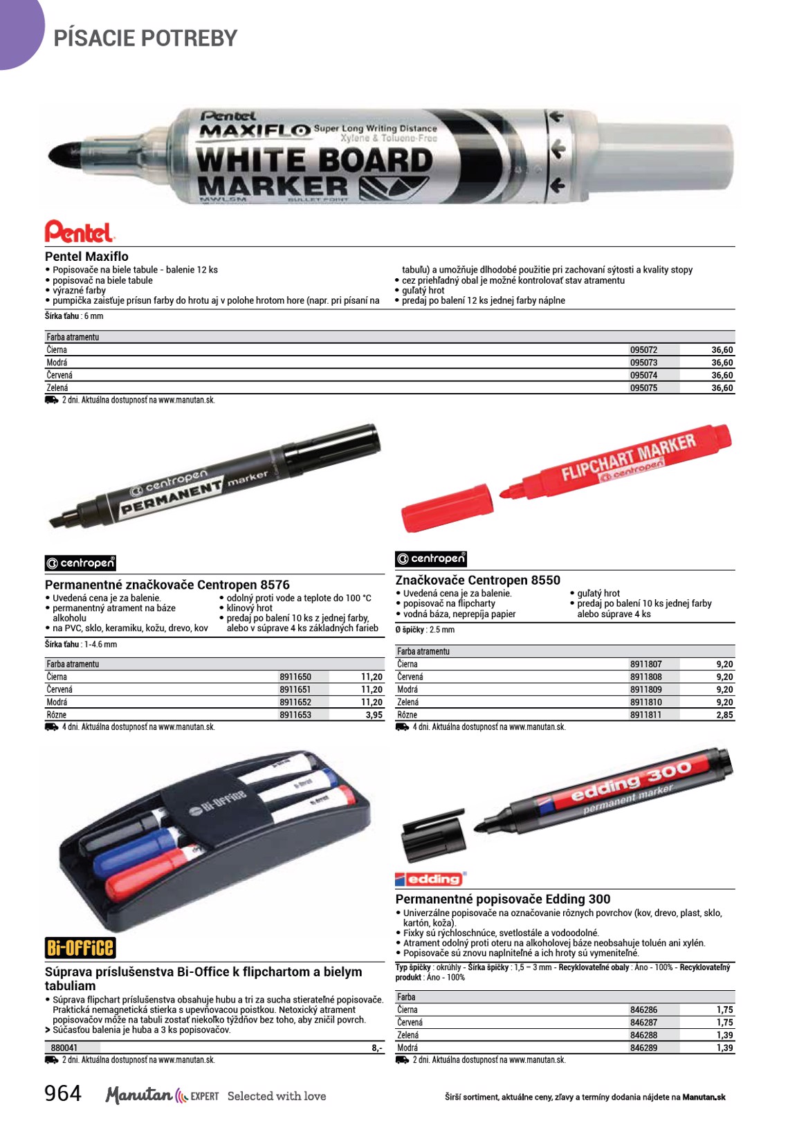 PÍSACIE POTREBY Pentel Maxiflo • Popisovače na biele tabule - balenie 12 ks • popisovač na biele tabule • výrazné farby • pumpička zaisťuje prísun farby do hrotu aj v polohe hrotom hore (napr. pri písaní na Šírka ťahu : 6 mm Farba atramentu Čierna Modrá Červená Zelená 2 dni. Aktuálna dostupnosť na www.manutan.sk. tabuľu) a umožňuje dlhodobé použitie pri zachovaní sýtosti a kvality stopy • cez priehľadný obal je možné kontrolovať stav atramentu • guľatý hrot • predaj po balení 12 ks jednej farby náplne 095072 095073 095074 095075 36,60 36,60 36,60 36,60 Permanentné značkovače Centropen 8576 • Uvedená cena je za balenie. • odolný proti vode a teplote do 100 °C • permanentný atrament na báze • klinový hrot alkoholu • predaj po balení 10 ks z jednej farby, • na PVC, sklo, keramiku, kožu, drevo, kov alebo v súprave 4 ks základných farieb Šírka ťahu : 1-4.6 mm Farba atramentu Čierna Červená Modrá Rôzne 4 dni. Aktuálna dostupnosť na www.manutan.sk. 8911650 8911651 8911652 8911653 11,20 11,20 11,20 3,95 Značkovače Centropen 8550 • Uvedená cena je za balenie. • popisovač na flipcharty • vodná báza, neprepíja papier Ø špičky : 2.5 mm • guľatý hrot • predaj po balení 10 ks jednej farby alebo súprave 4 ks Farba atramentu Čierna Červená Modrá Zelená Rôzne 4 dni. Aktuálna dostupnosť na www.manutan.sk. 8911807 9,20 8911808 9,20 8911809 9,20 8911810 9,20 8911811 2,85 Súprava príslušenstva Bi-Office k flipchartom a bielym tabuliam • Súprava flipchart príslušenstva obsahuje hubu a tri za sucha stierateľné popisovače. Praktická nemagnetická stierka s upevňovacou poistkou. Netoxický atrament popisovačov môže na tabuli zostať niekoľko týždňov bez toho, aby zničil povrch. OO Súčasťou balenia je huba a 3 ks popisovačov. 880041 8,- 2 dni. Aktuálna dostupnosť na www.manutan.sk. Permanentné popisovače Edding 300 • Univerzálne popisovače na označovanie rôznych povrchov (kov, drevo, plast, sklo, kartón, koža). • Fixky sú rýchloschnúce, svetlostále a vodoodolné. • Atrament odolný proti oteru na alkoholovej báze neobsahuje toluén ani xylén. • Popisovače sú znovu naplniteľné a ich hroty sú vymeniteľné. Typ špičky : okrúhly - Šírka špičky : 1,5 – 3 mm - Recyklovateľné obaly : Áno - 100% - Recyklovateľný produkt : Áno - 100% Farba Čierna Červená Zelená Modrá 2 dni. Aktuálna dostupnosť na www.manutan.sk. 846286 1,75 846287 1,75 846288 1,39 846289 1,39 964